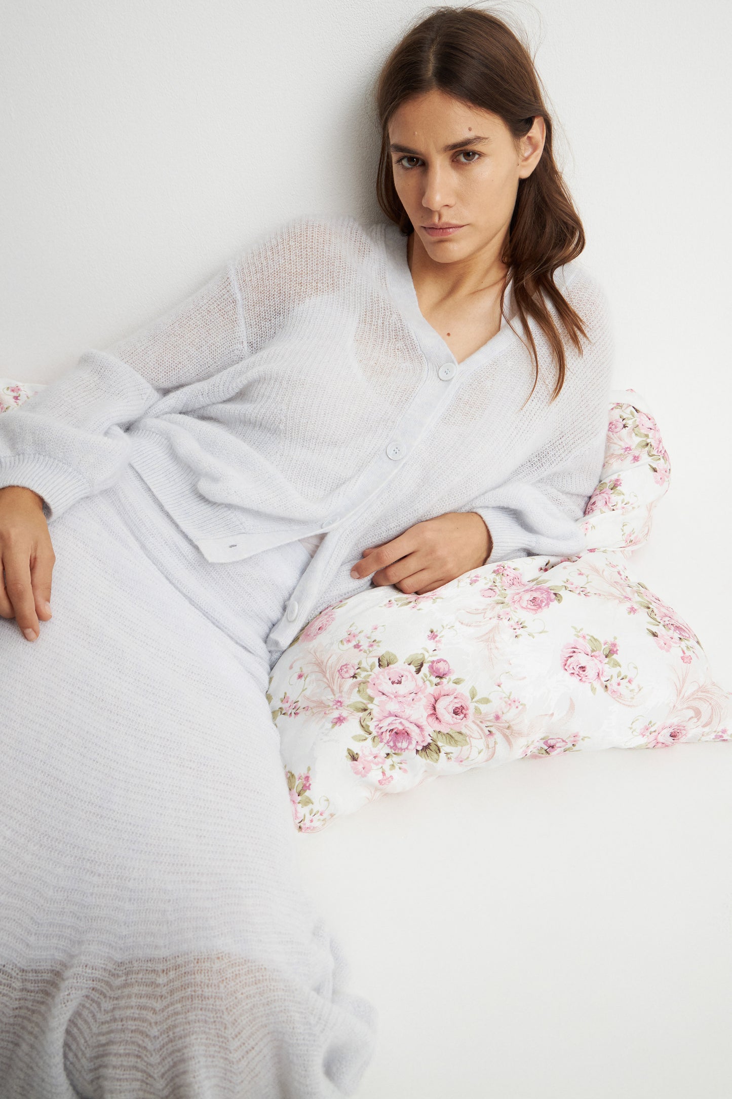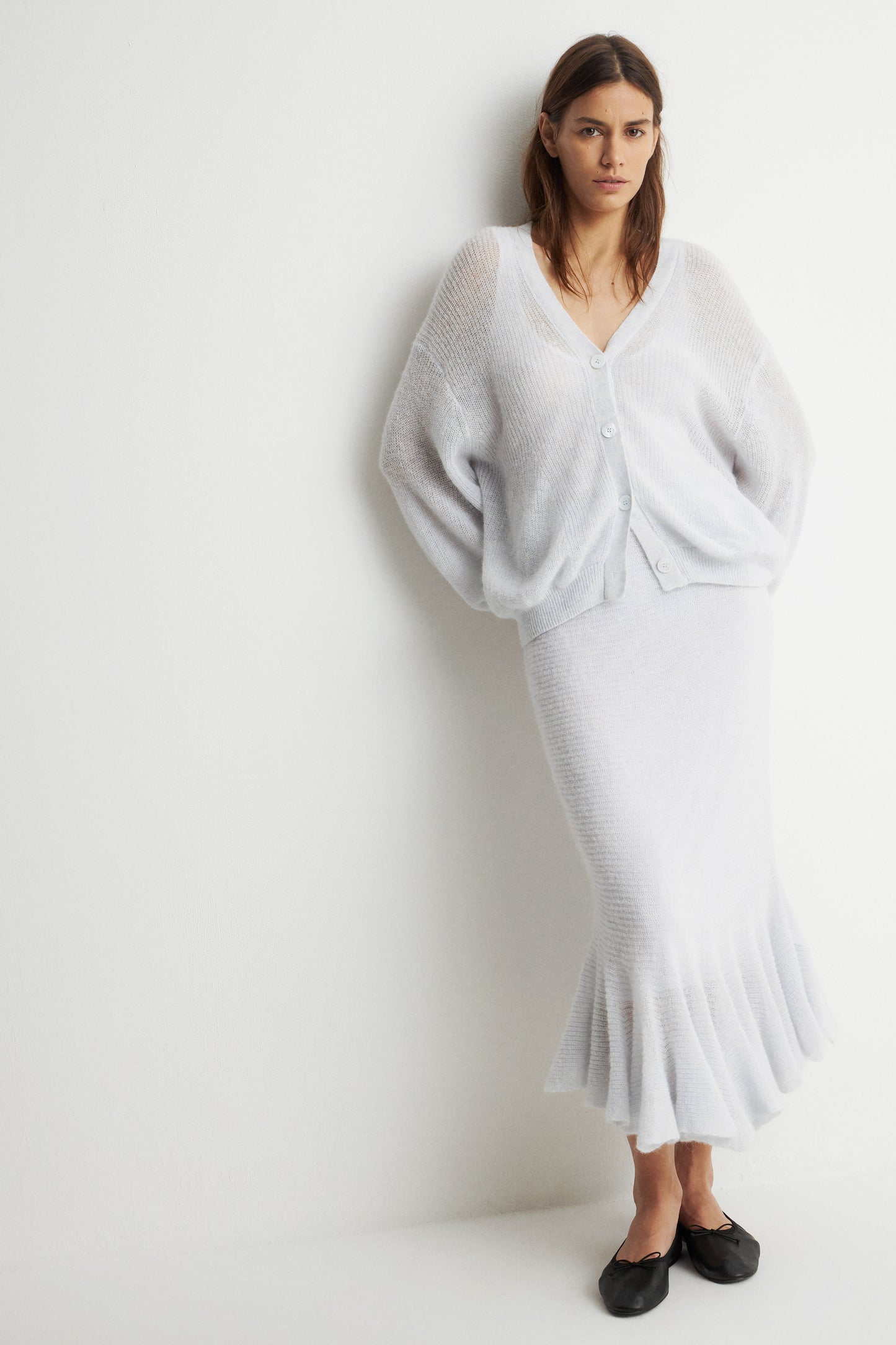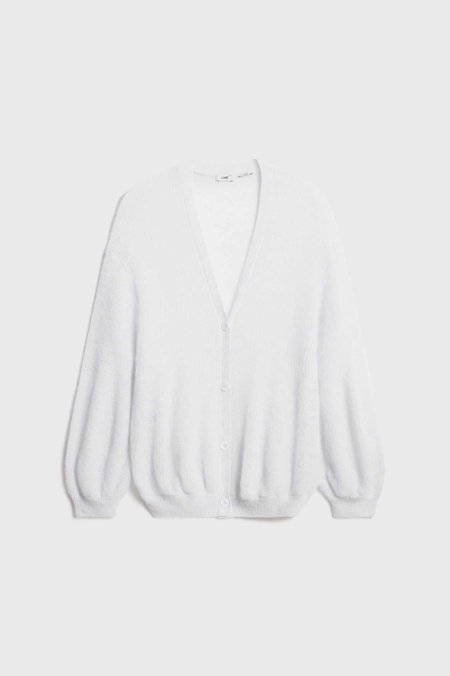 Loose-fit cardigan made of fluffy blend containing alpaca and wool. V-neck, long volume sleeves and button-up front.