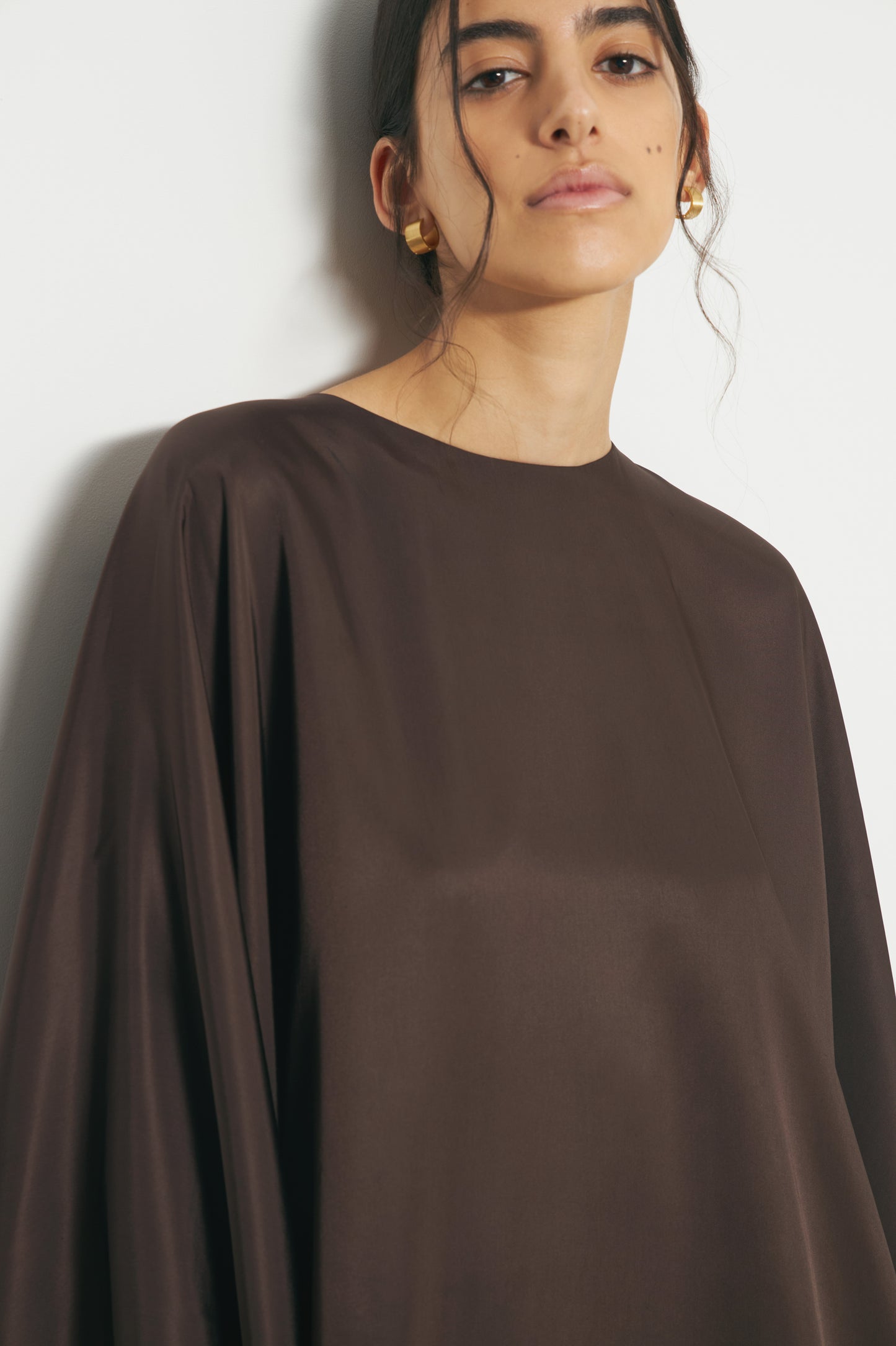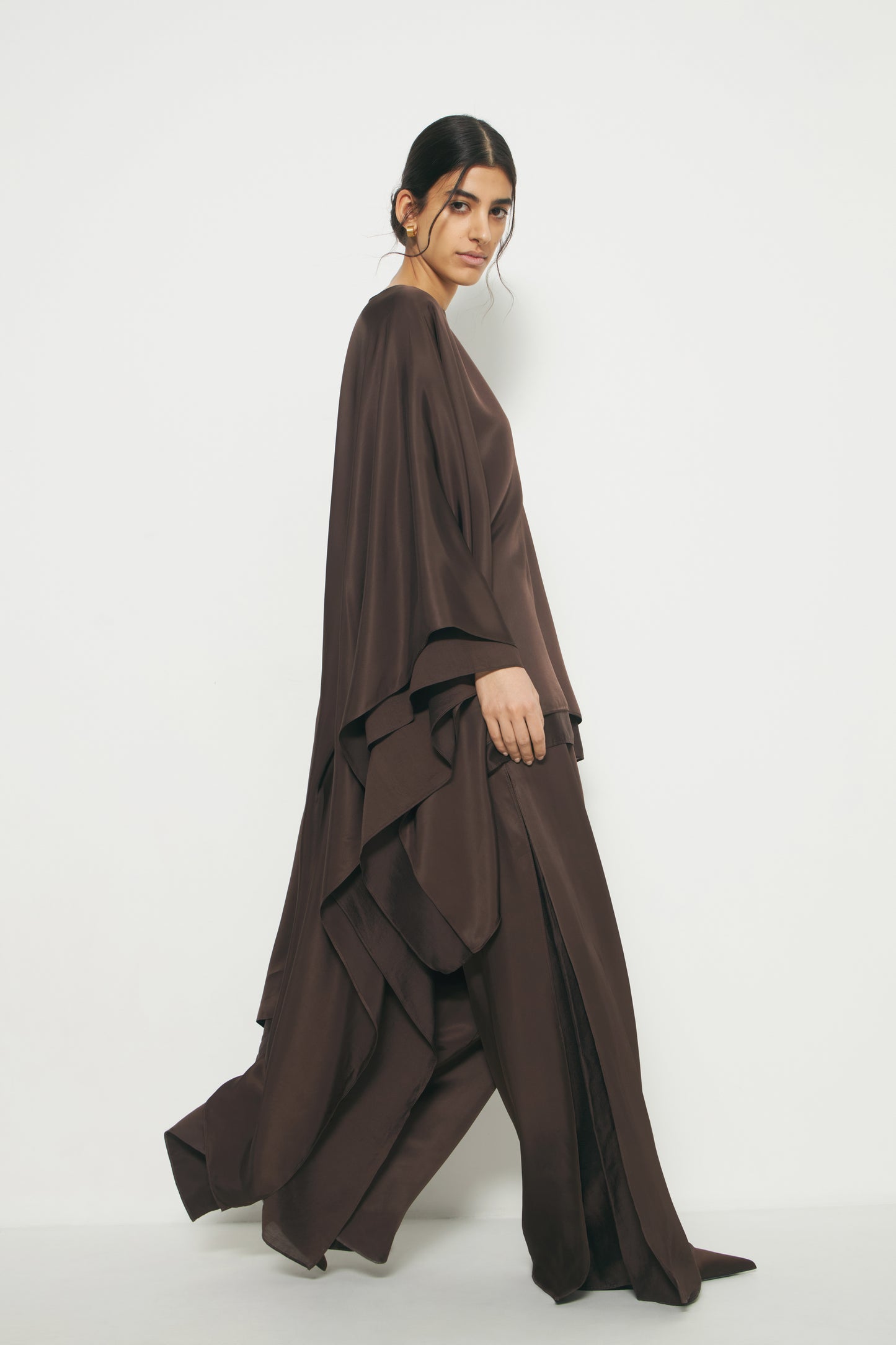 Oversized cape in a satin fabric made from viscose. Designed with a round neck and layered finish that falls in an asymmetric hemline. Buttoned teardrop closure at back.