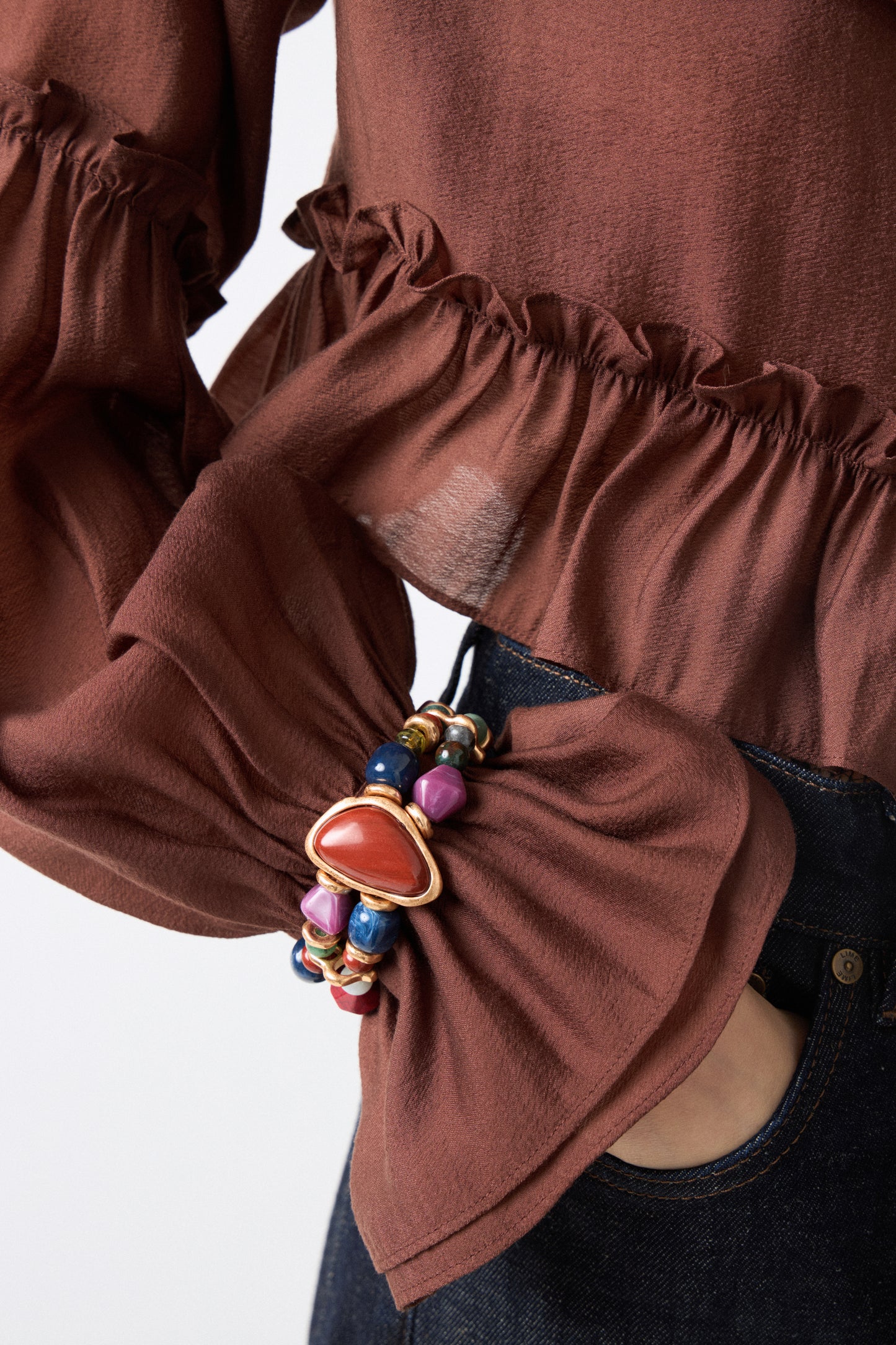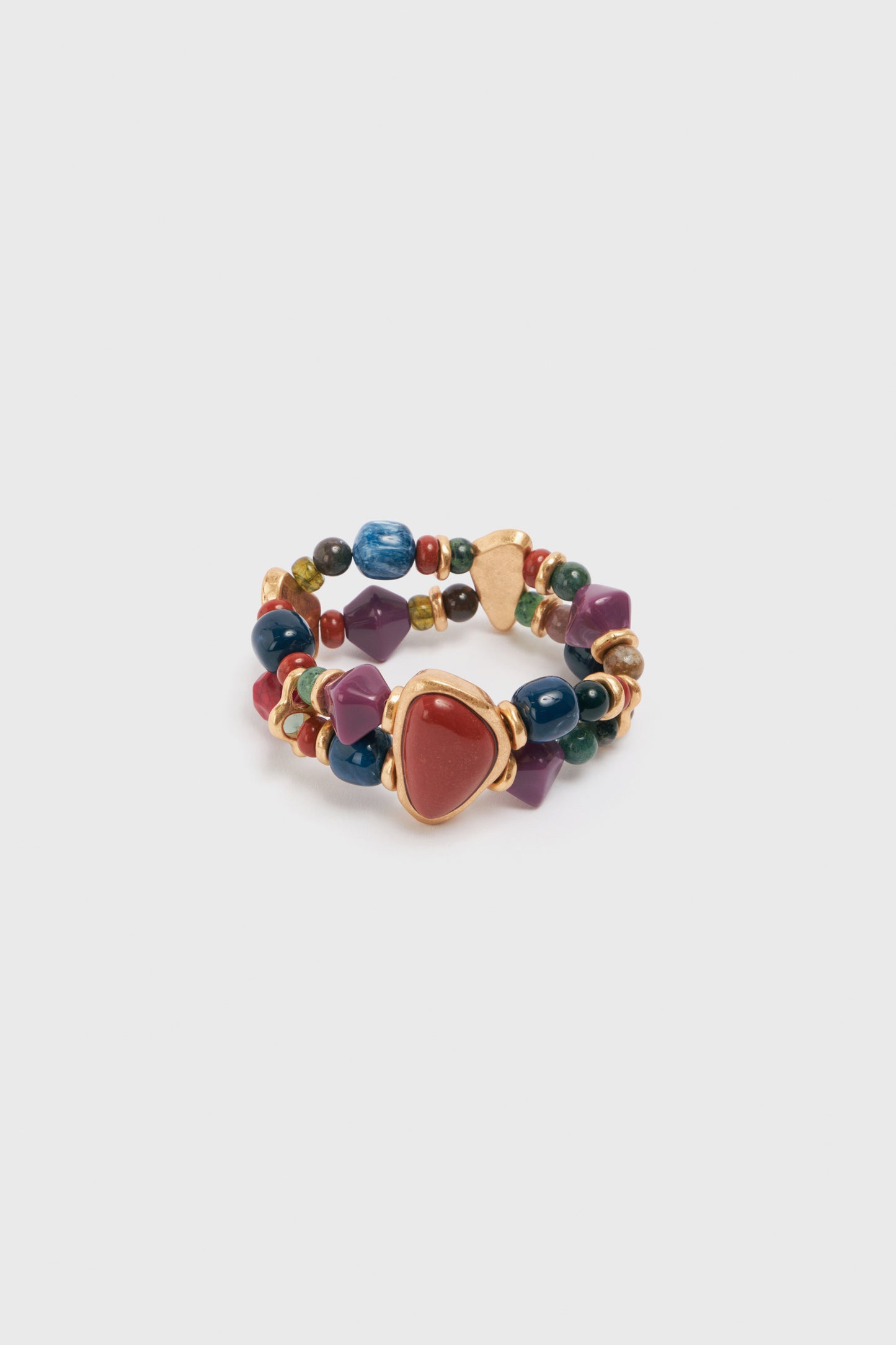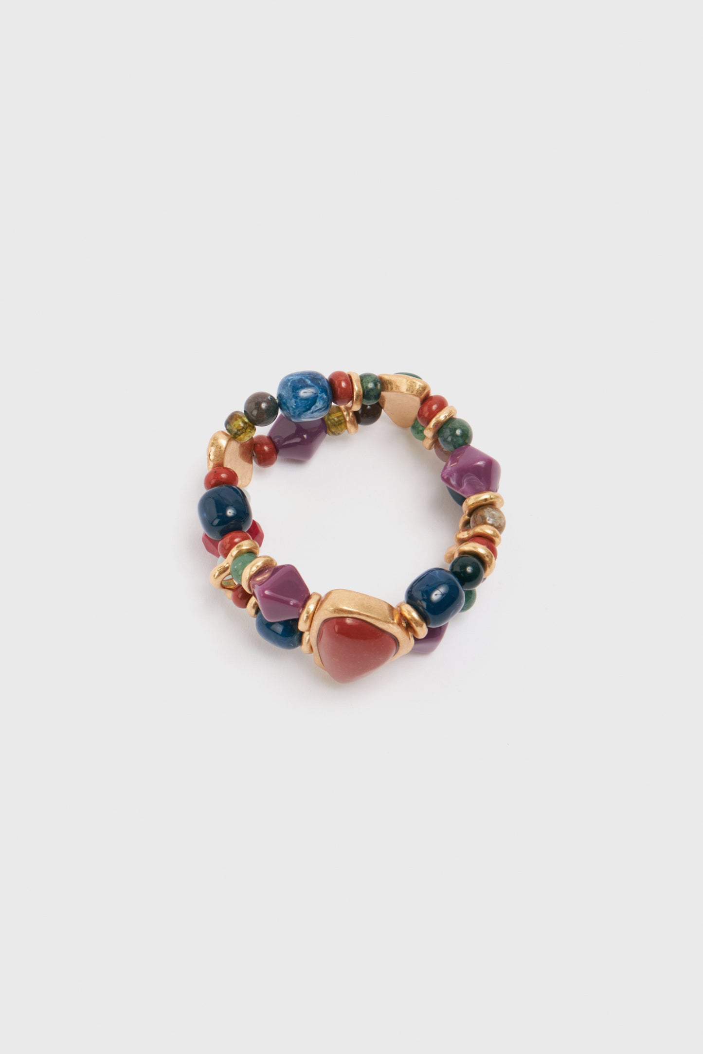 Beaded bracelet detailed with gold-tone metal elements and asymmetric natural stones. Made of jasper, agate, amethyst, and jade. ONE SIZE: 6 cm