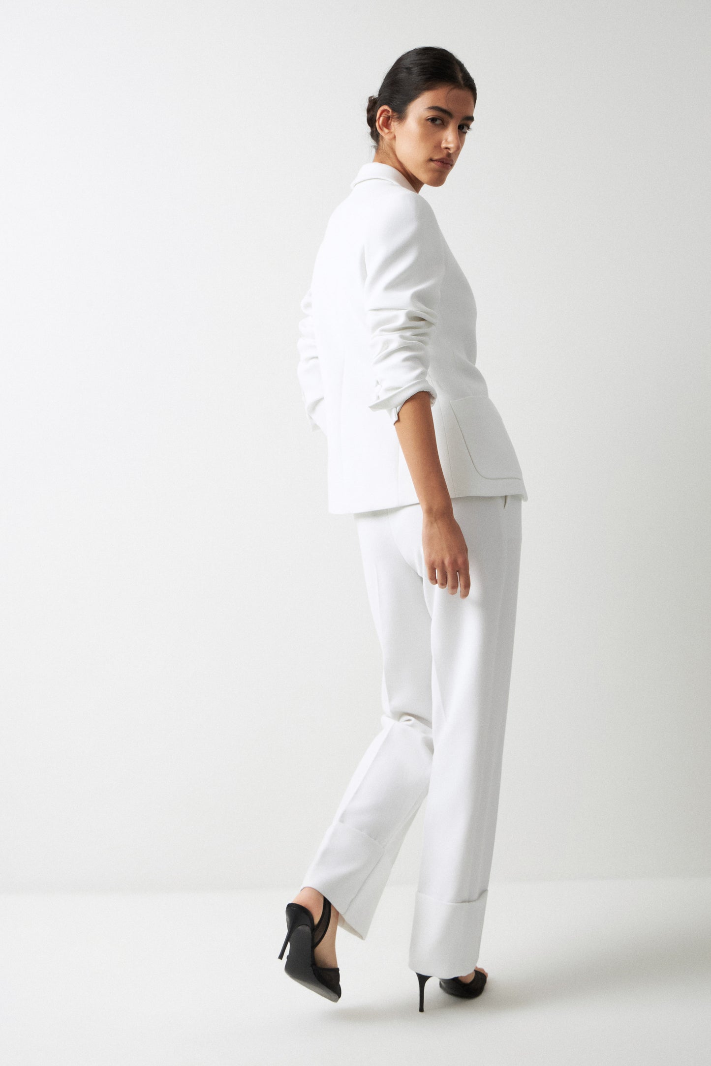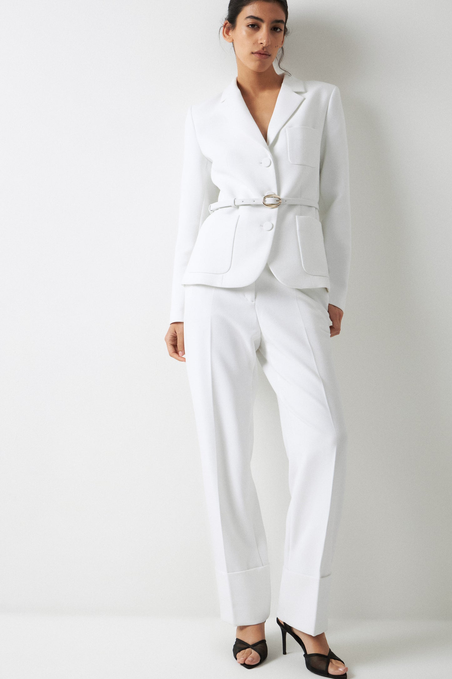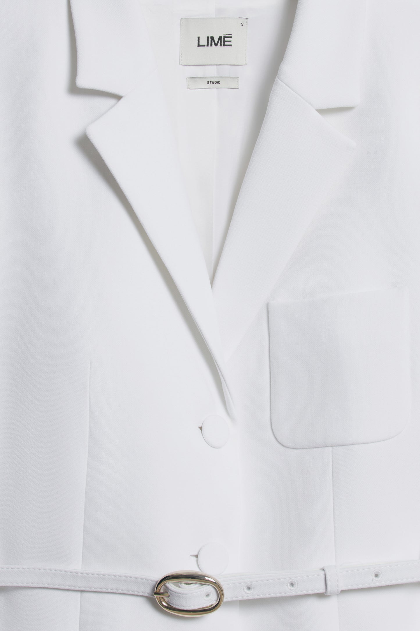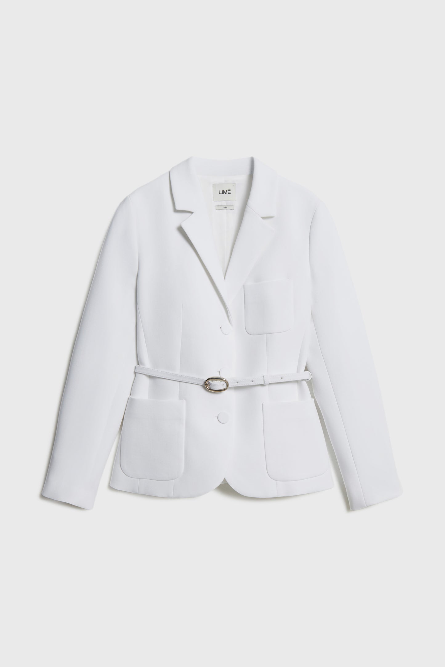 Iconic slim-fit silhouette defines the style of this blazer with long sleeves, patch pockets, and a narrow, removable belt in coated fabric. Matching lining. Single-breasted front with covered buttons.