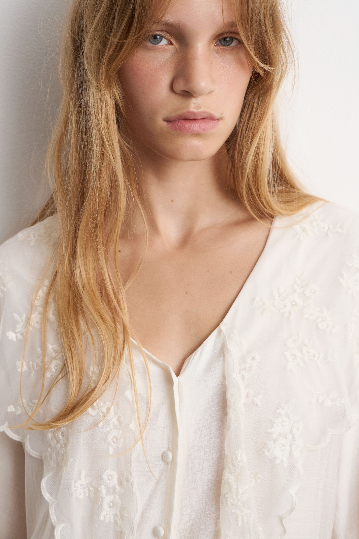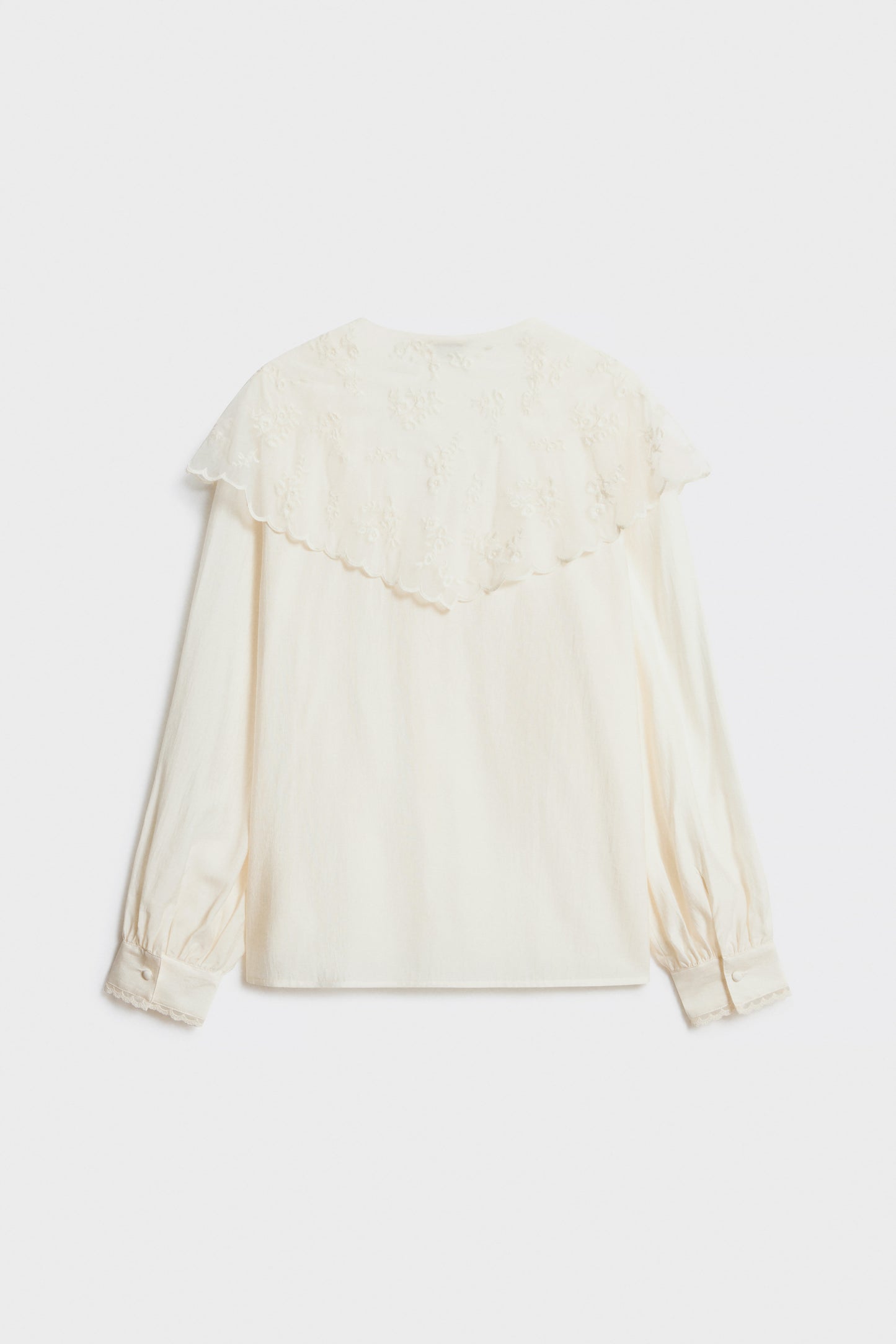 Blouse in a viscose blend with sophisticated lace detail that highlight its uniqueness. V-shaped opening, small covered buttons at front and long sleeves with cuffs. Straight fit.