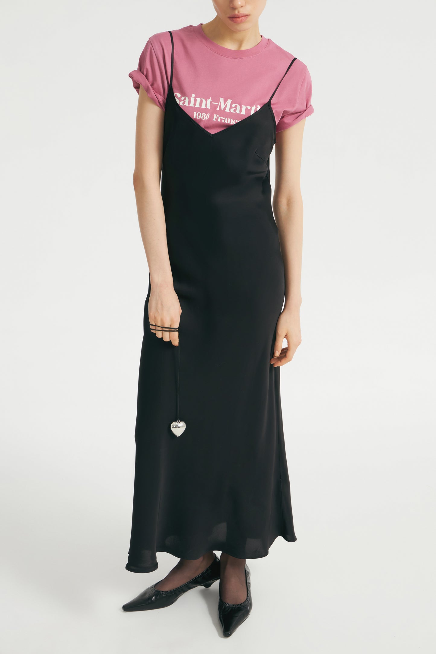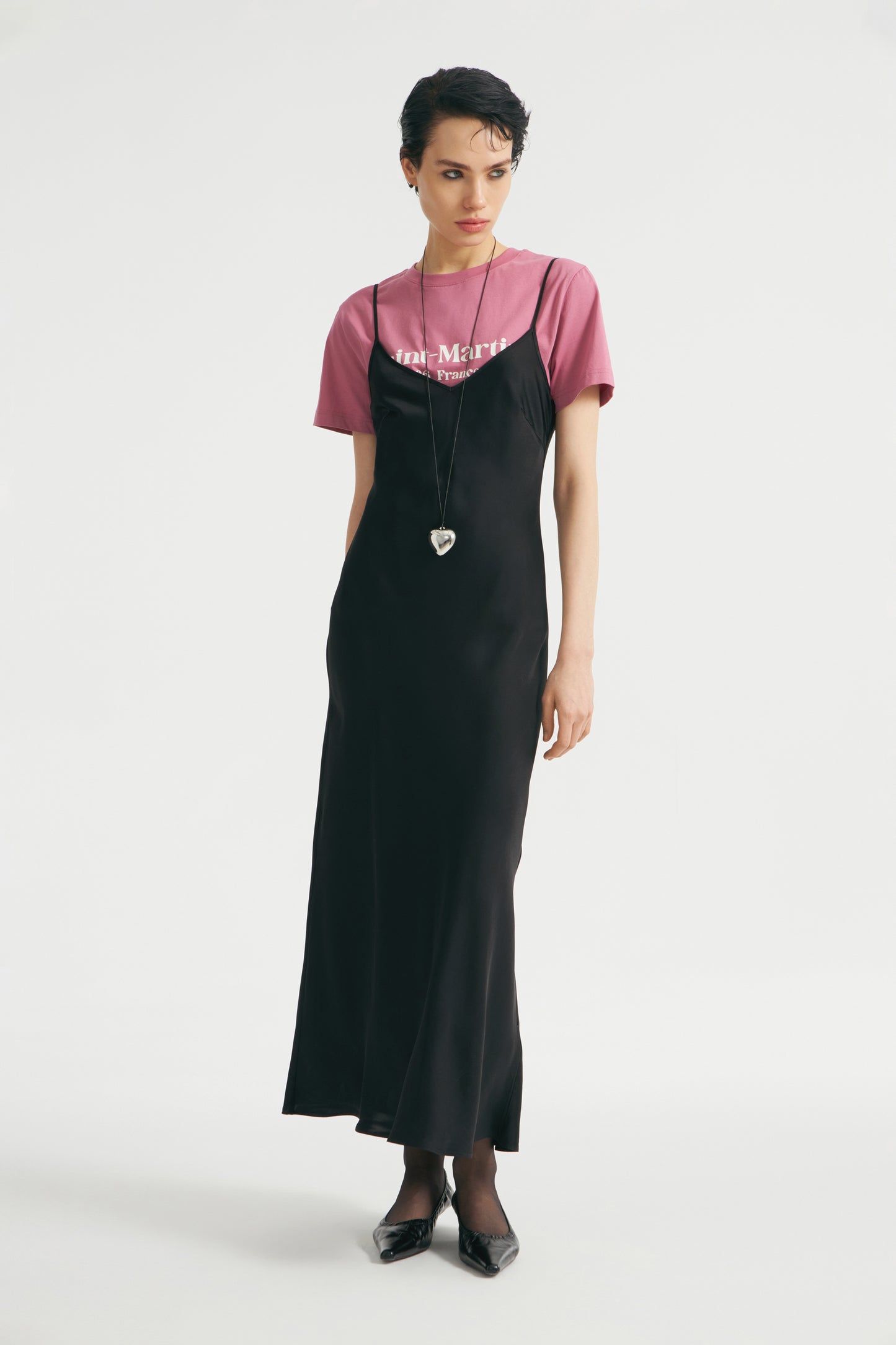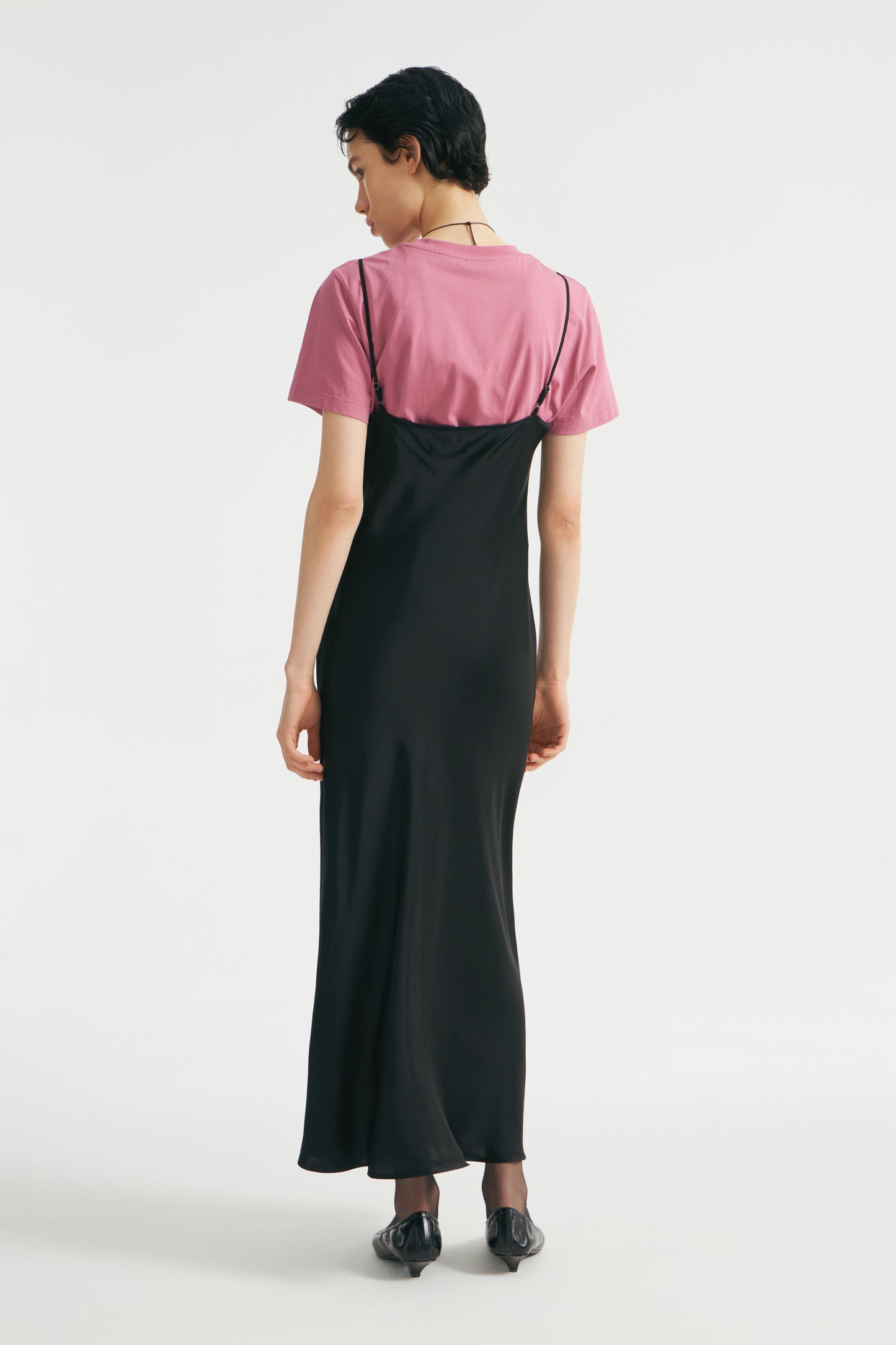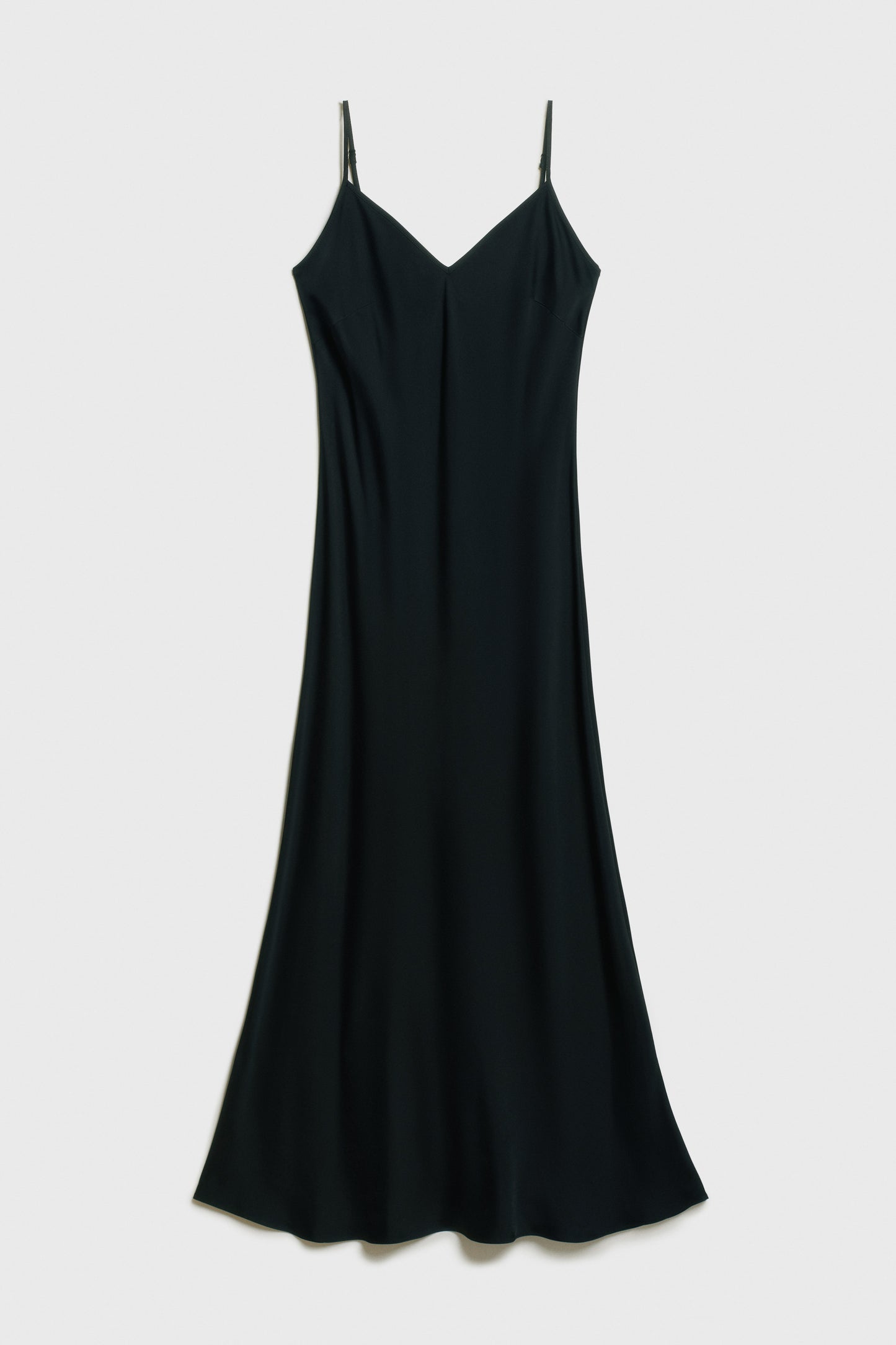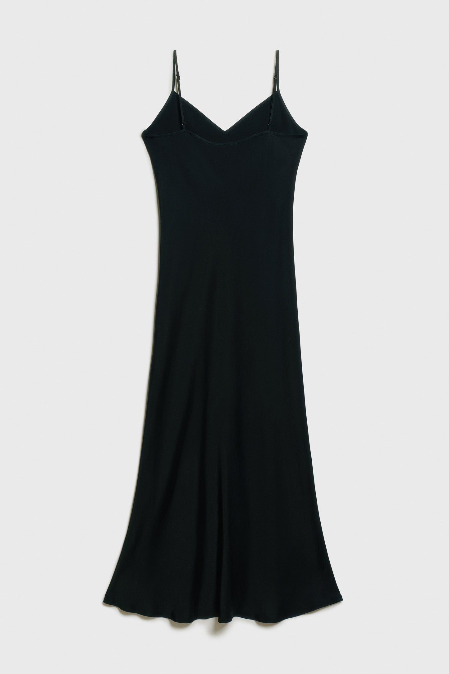 Sleeveless midi dress in satin made from a viscose. Featuring with a V-shaped neckline and thin adjustable shoulder straps.