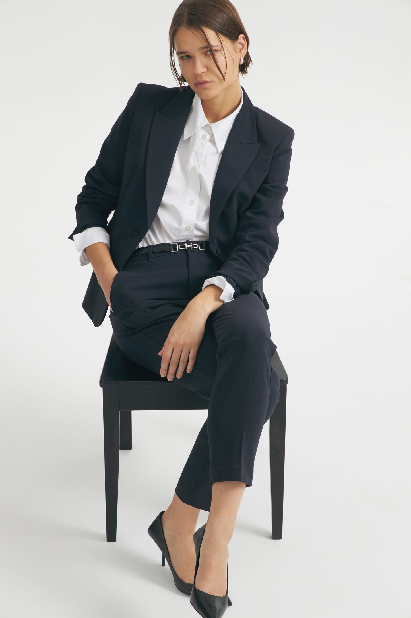 Carrot-fit trousers with creases. Featuring front pockets, fake welt pockets at the back. Zip, inner button and metal hook fastening.