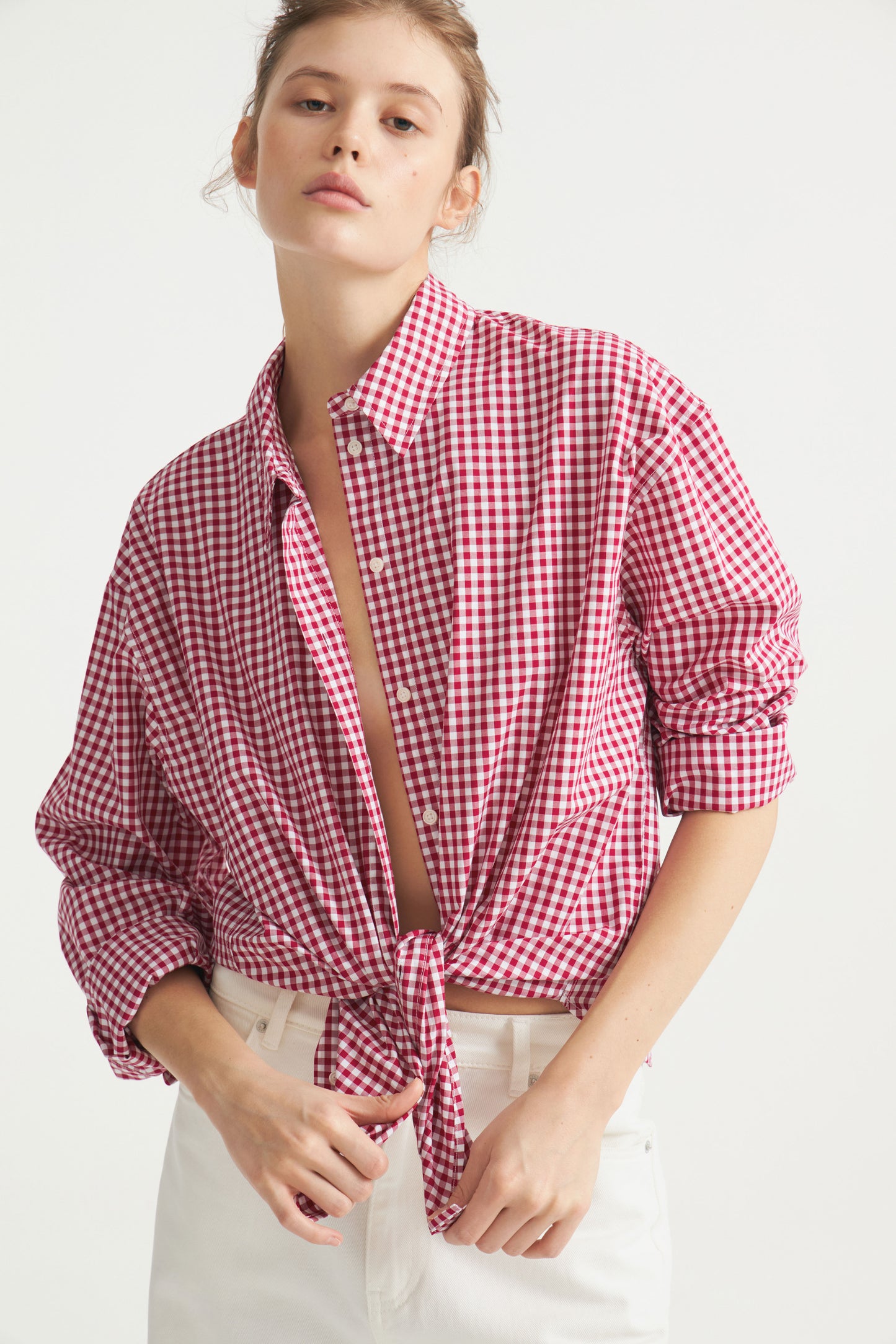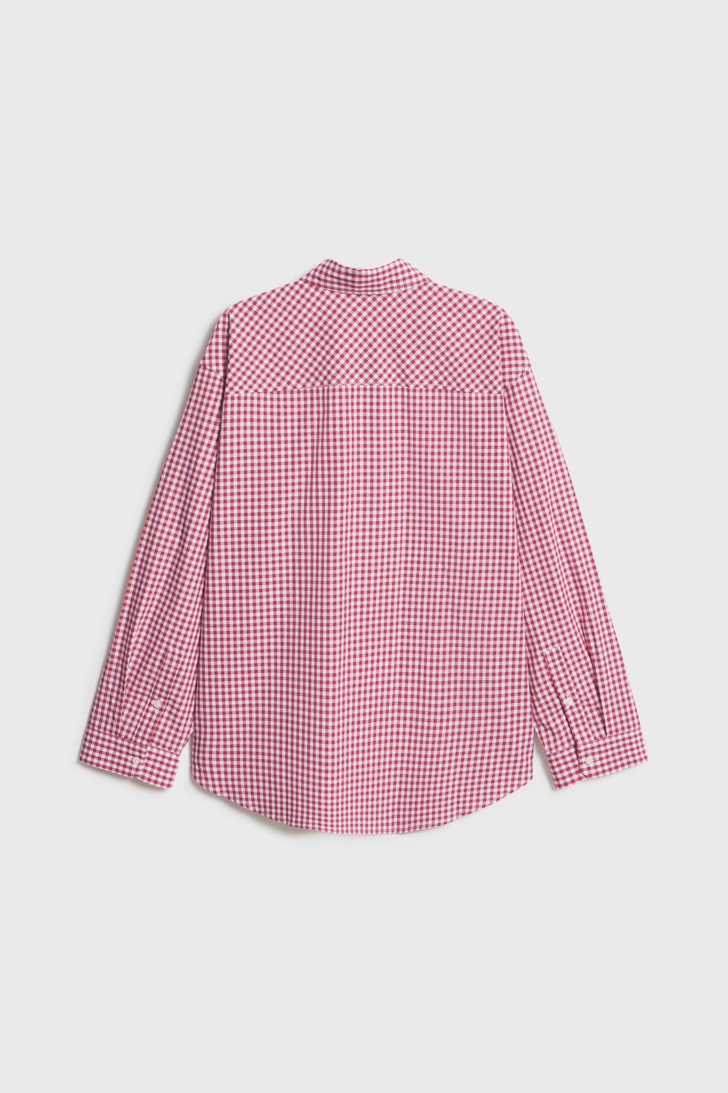 Collared shirt in cotton with a check pattern. Button front and long sleeves with adjustable buttoning at the cuffs. Rounded hem.