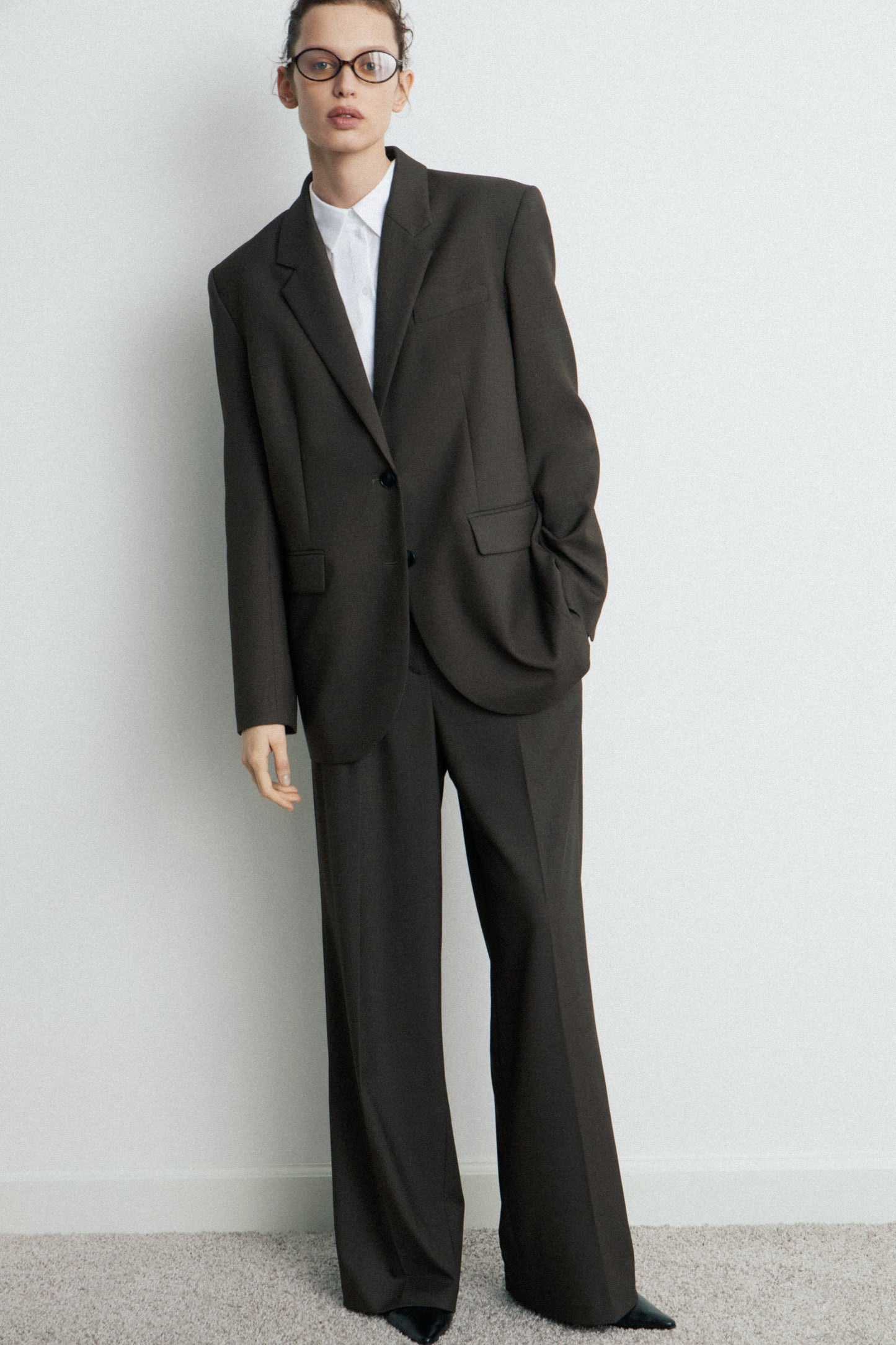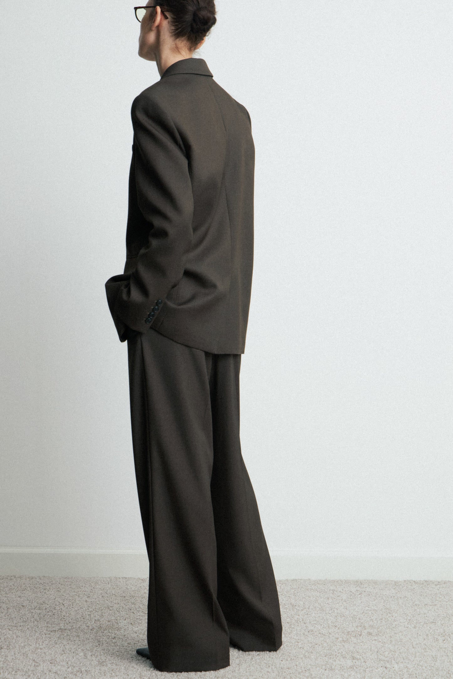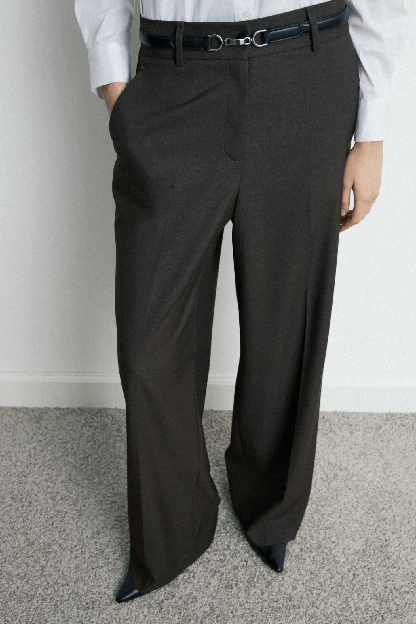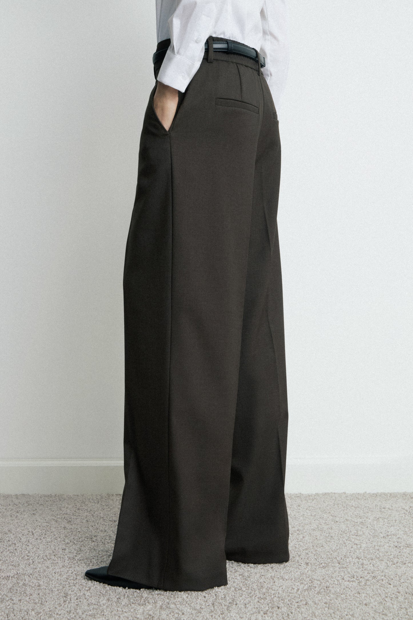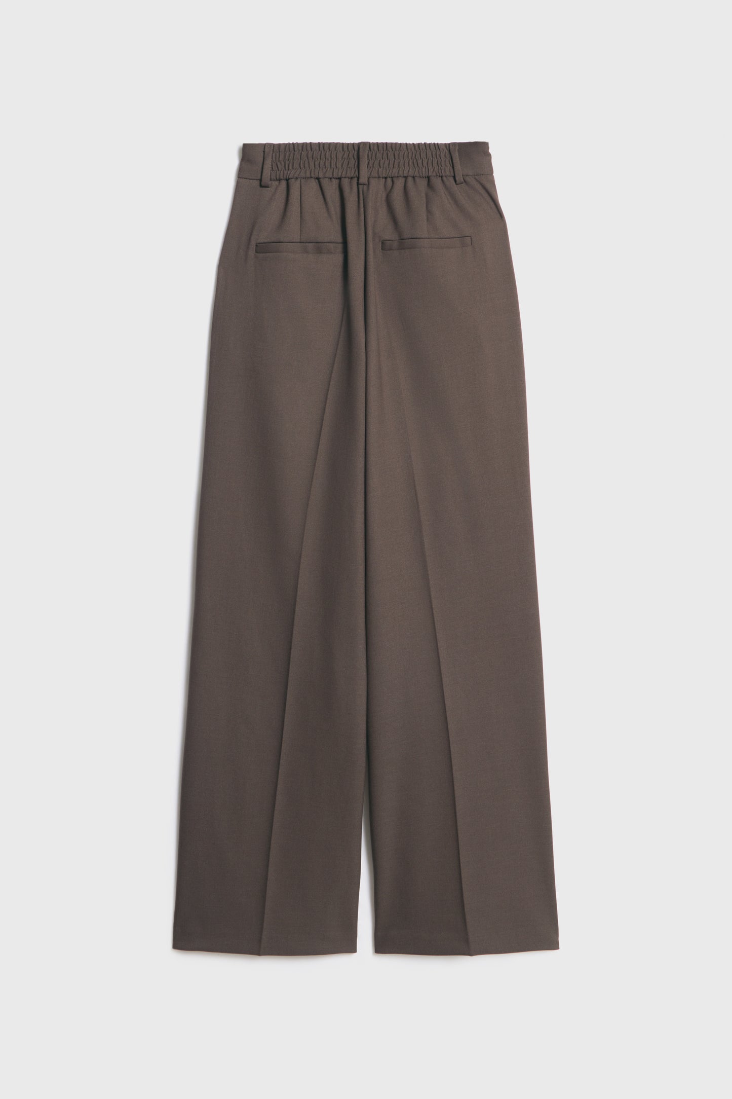 Trousers with discreet side pockets, fake back pocket and straight legs with creases. Features an elasticated detail at back. Zip, inside button and metal hook fastening at the front.