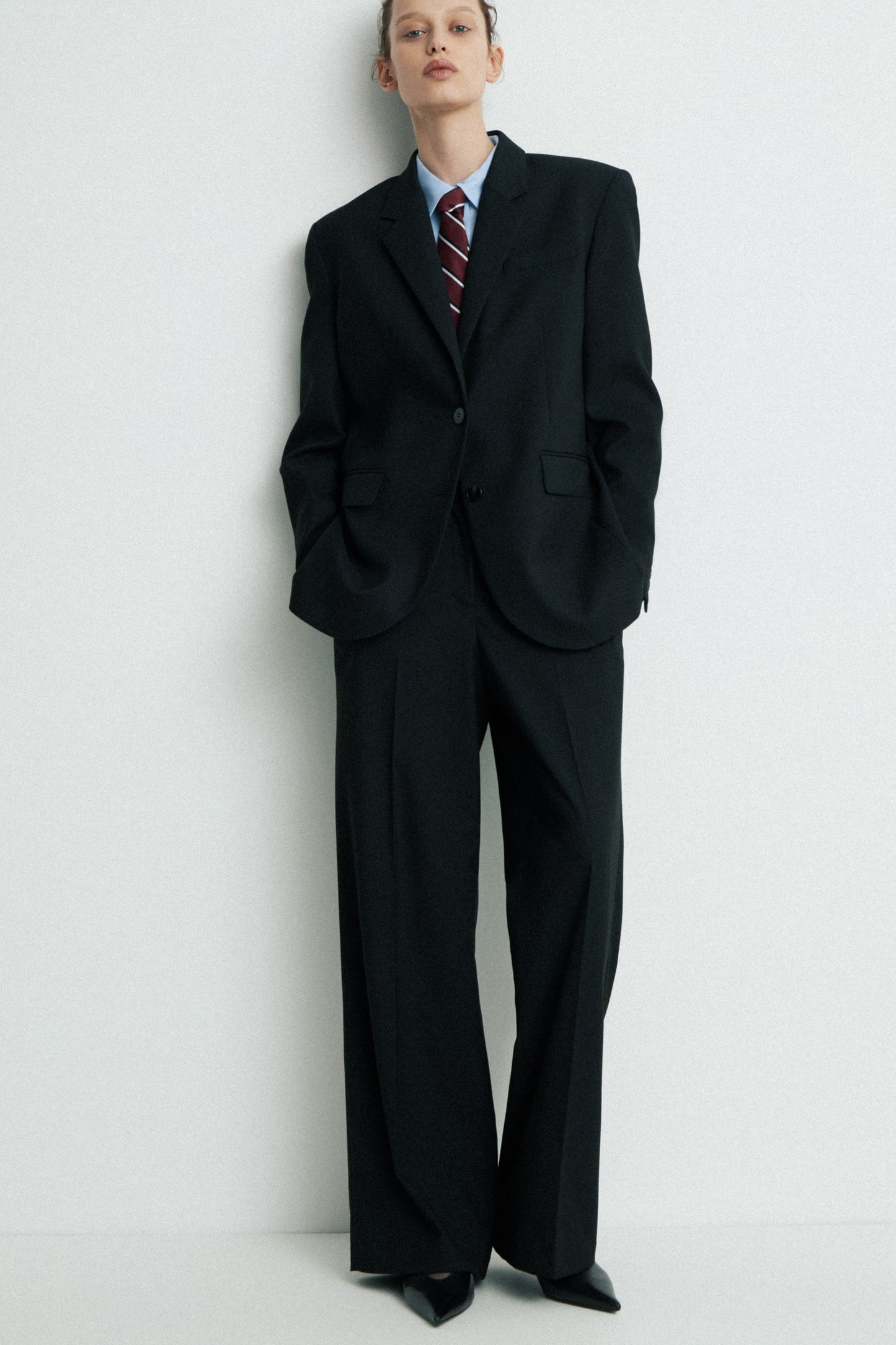 Trousers with discreet side pockets, fake back pocket and straight legs with creases. Features an elasticated detail at back. Zip, inside button and metal hook fastening at the front.