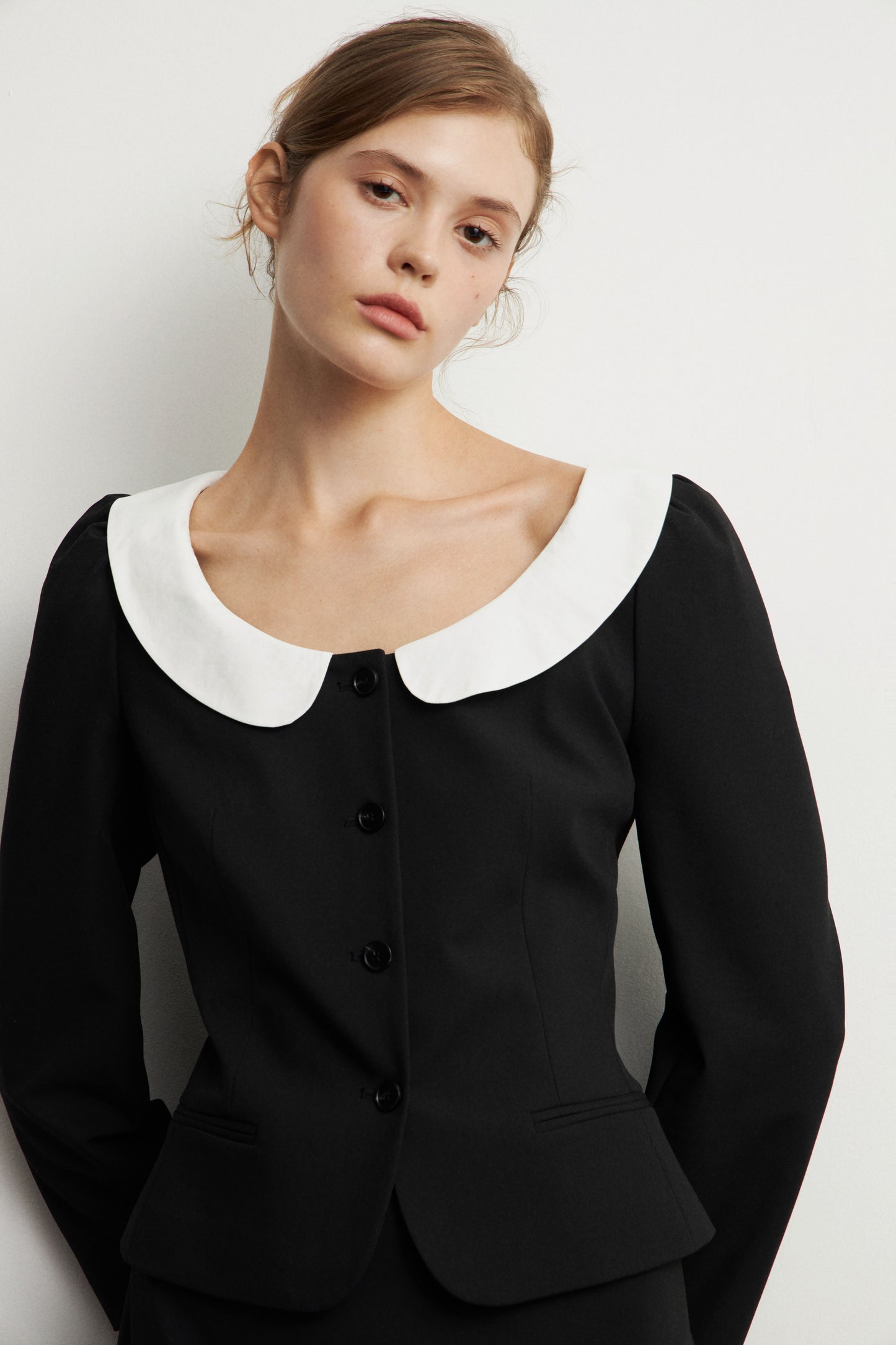 Long sleeve blazer with a contrast collar and round neck. Puff shoulders. Front welt pockets. Lined. Front button closure. Cropped. Slim fit.