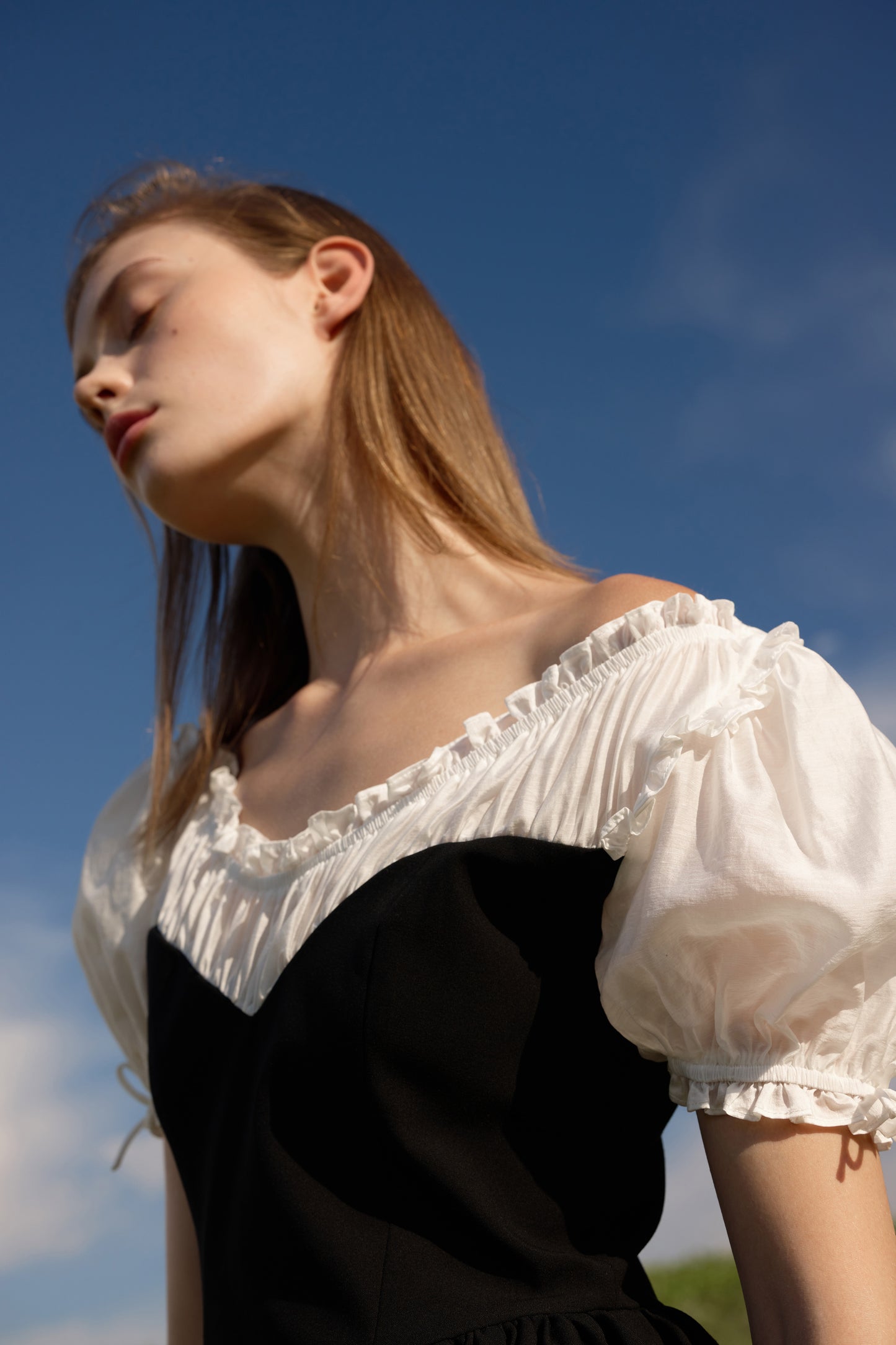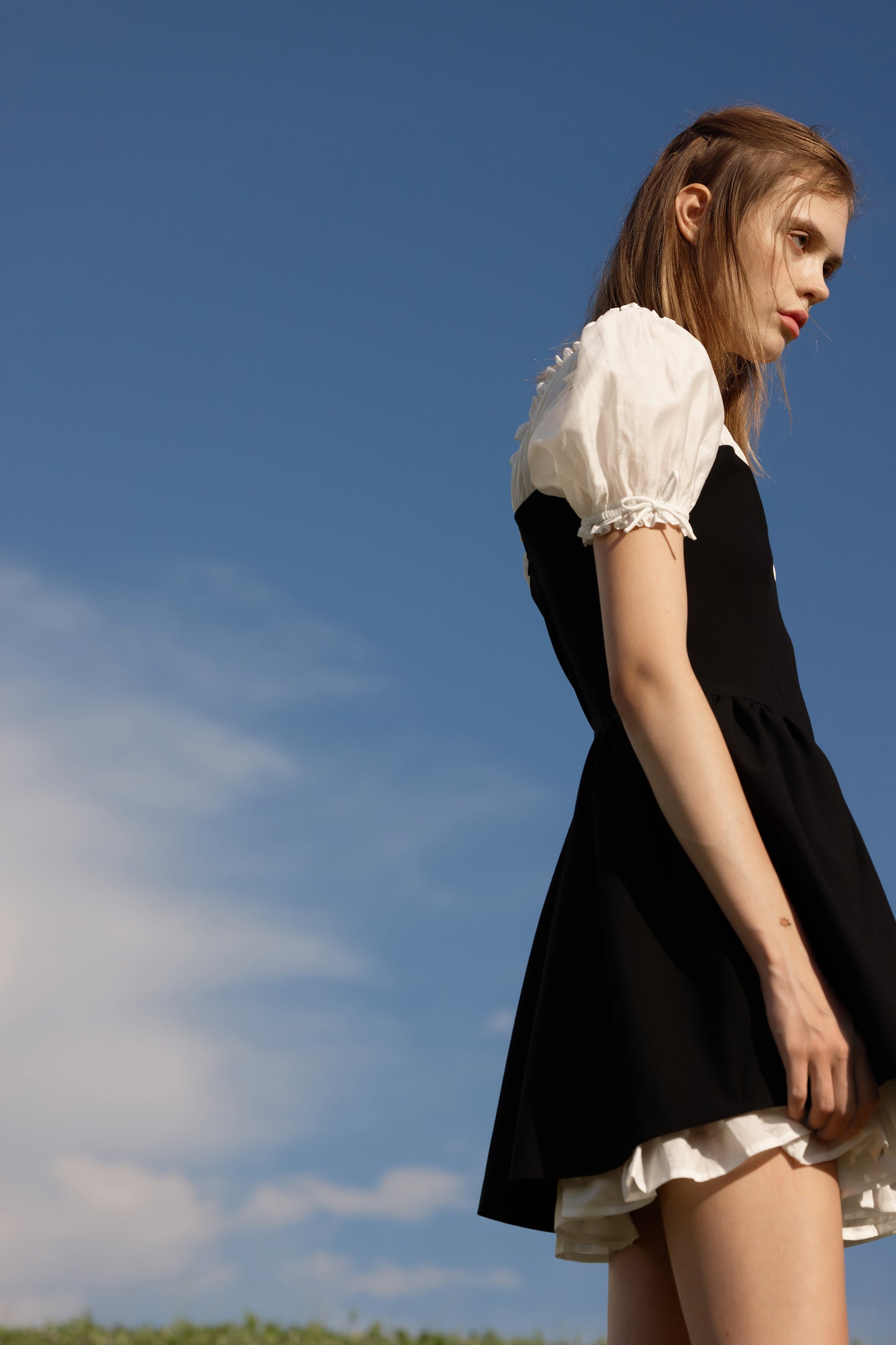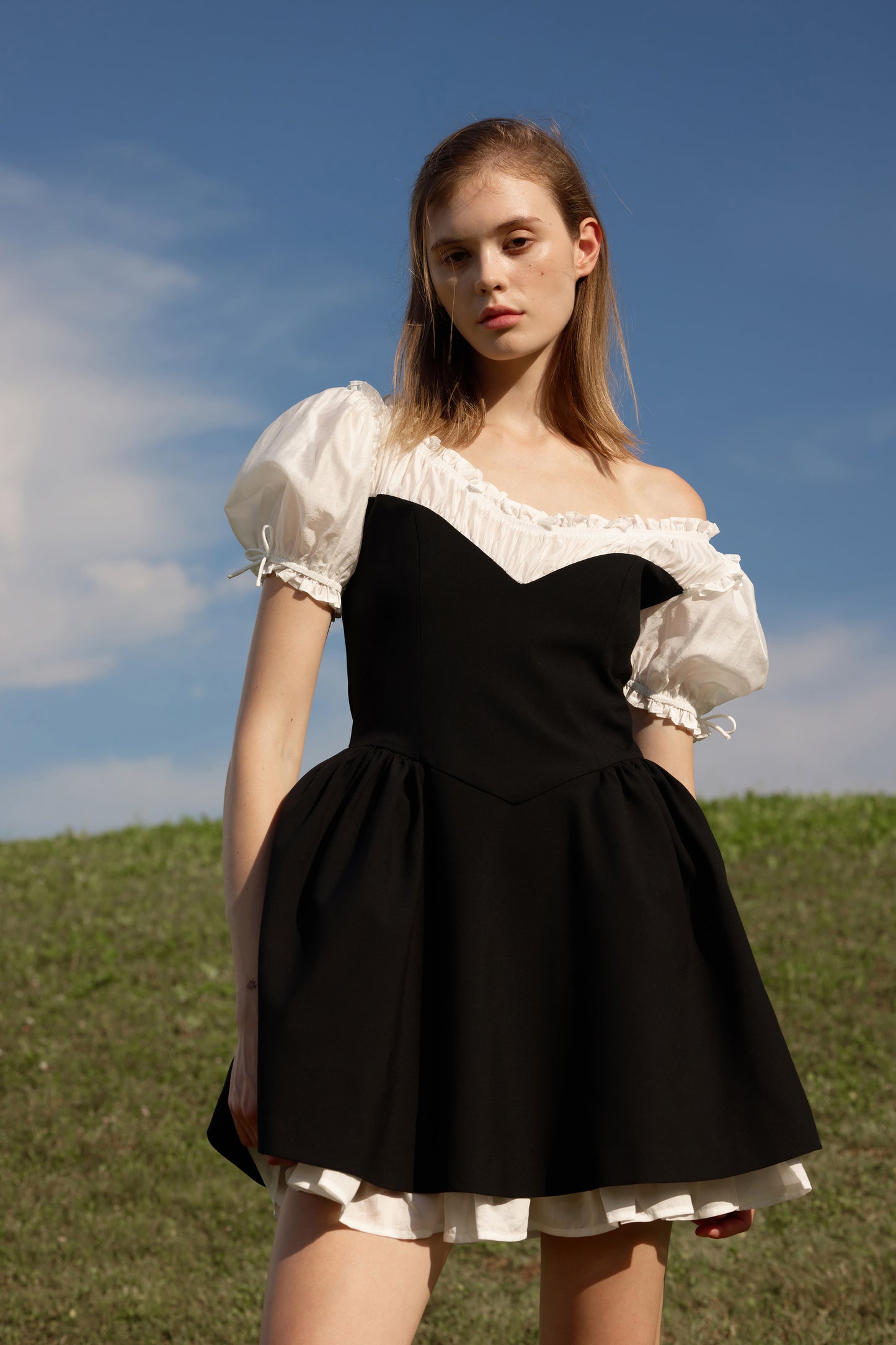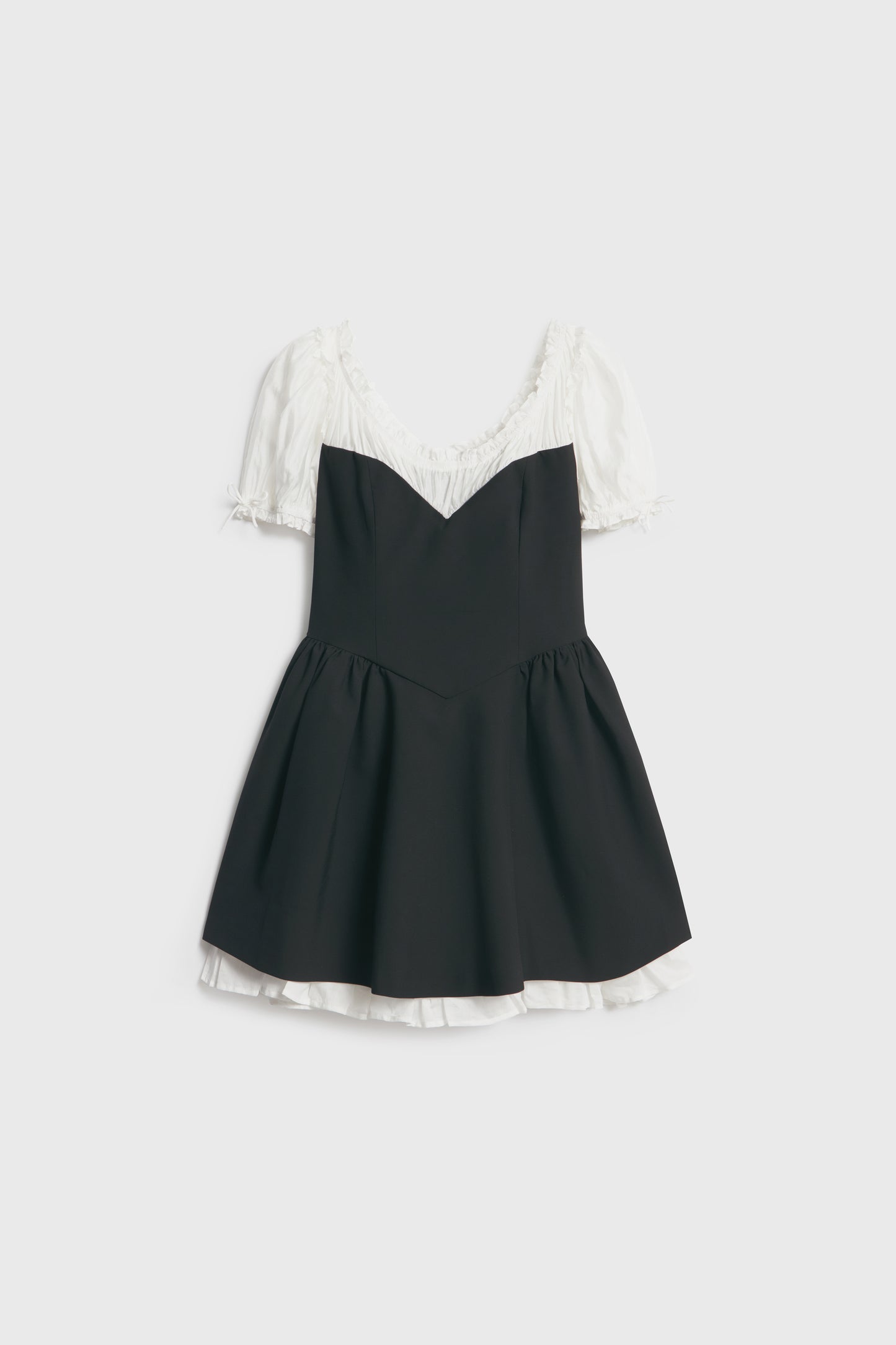 Short, slim-fit dress in woven fabric with contrast details. Flared, short, puff sleeves with extra-narrow drawstrings at the cuffs. Gathered seam below the neckline for added volume. Lined. A concealed zip at the back.