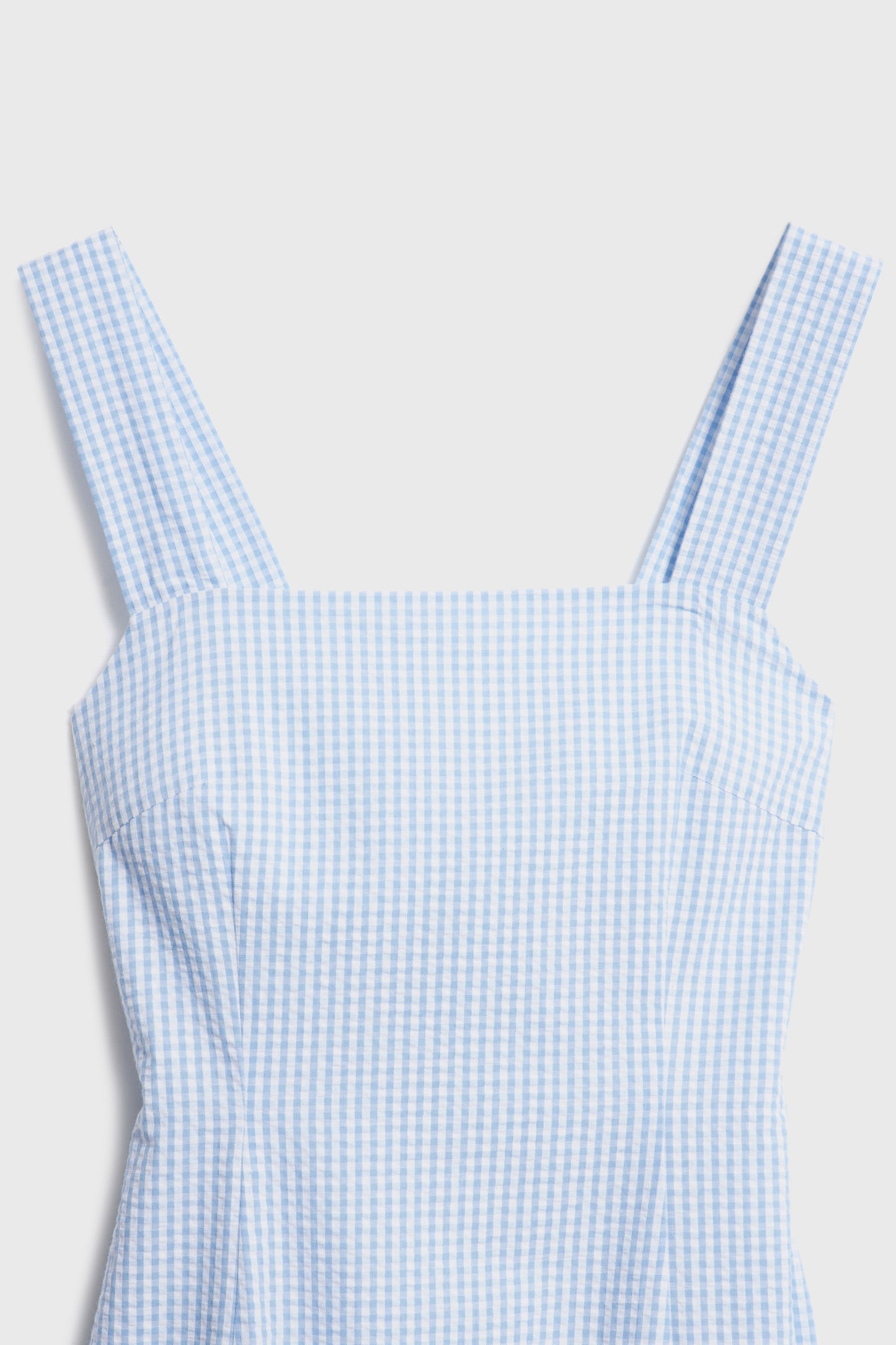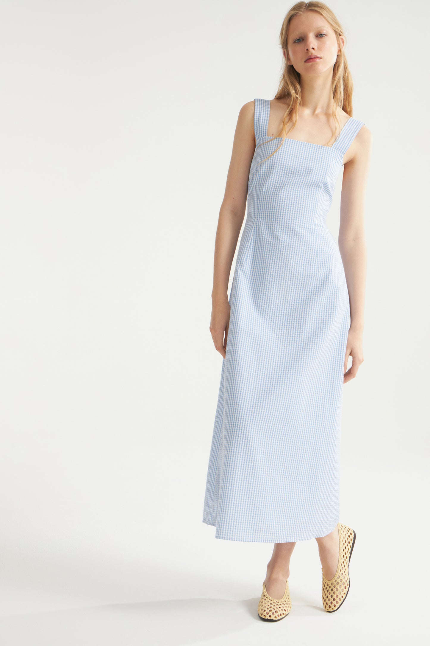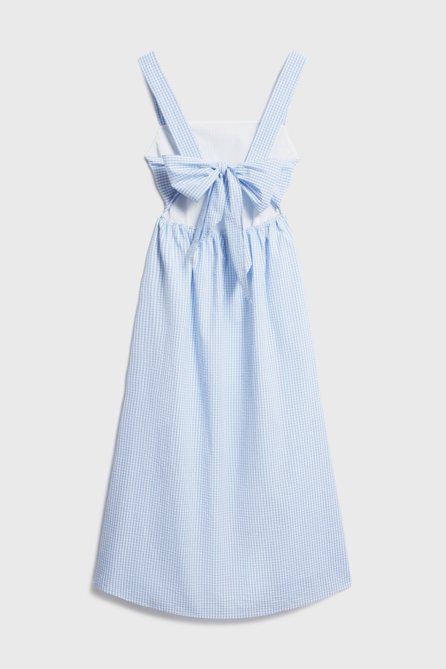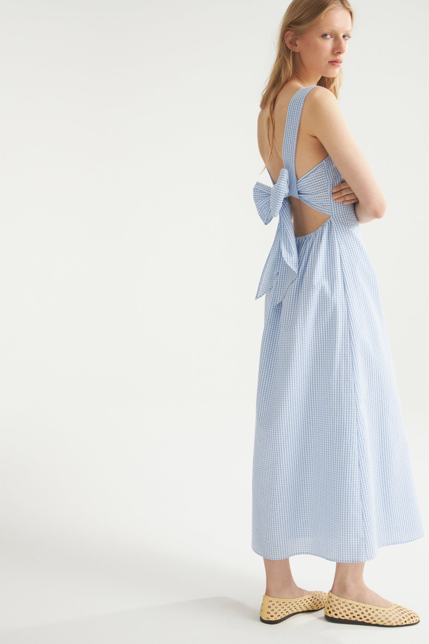 Midi dress in micro-checked cotton weave featuring shoulder straps and wide ties at the back. Lined.