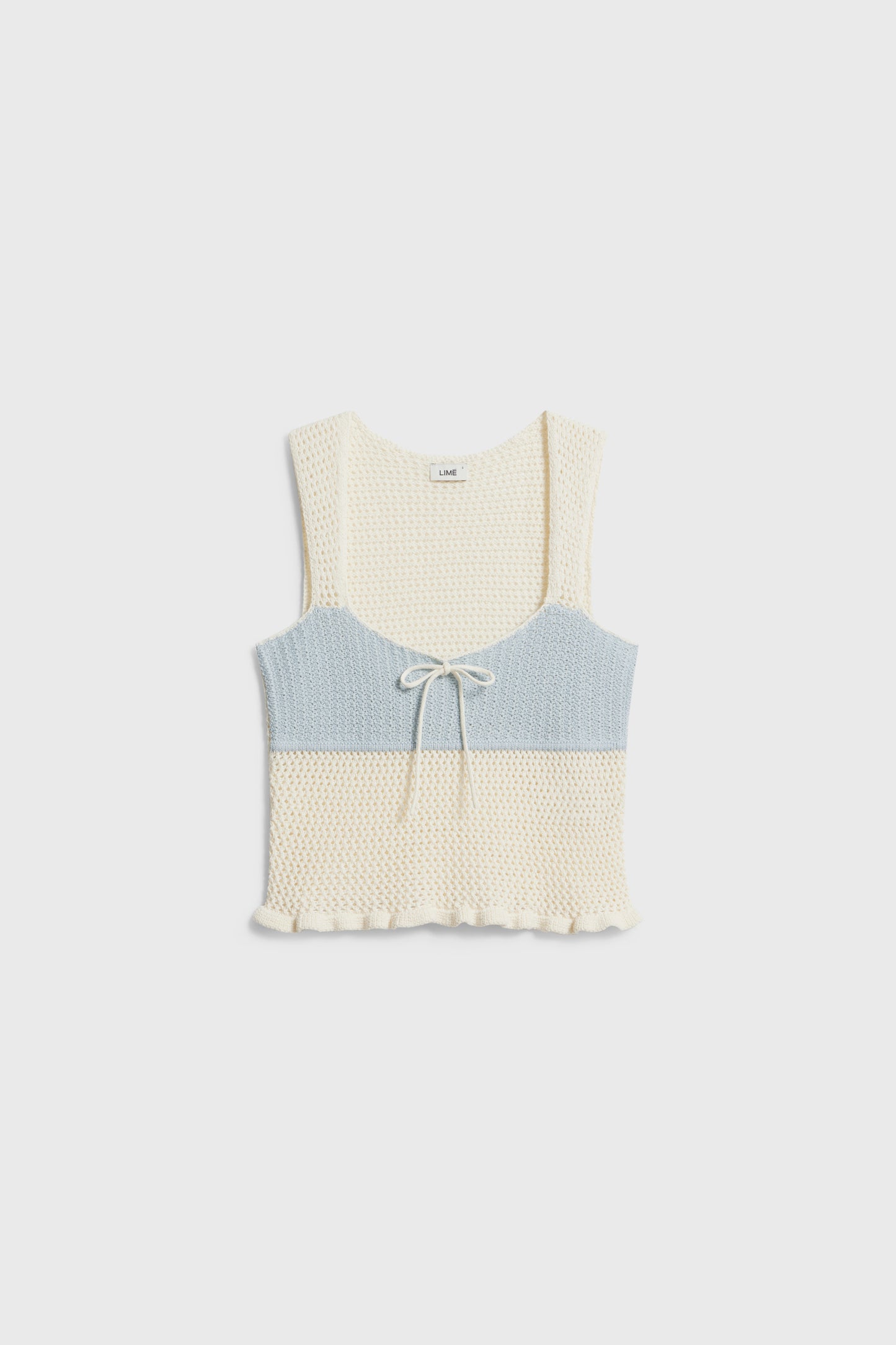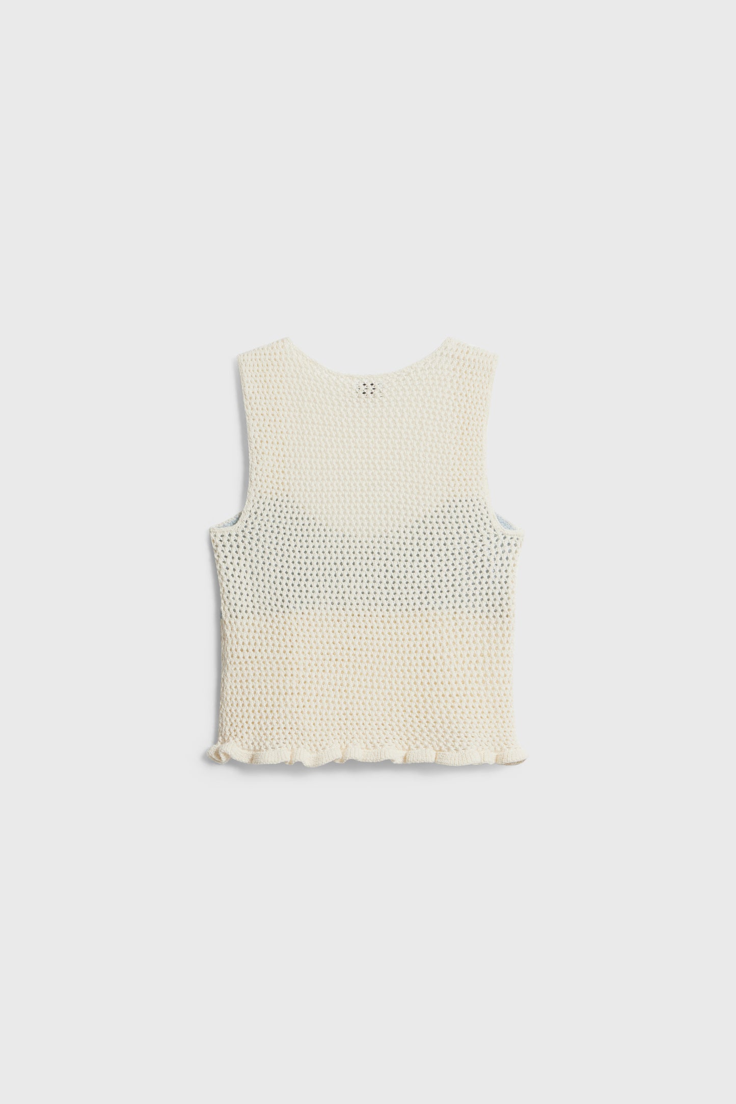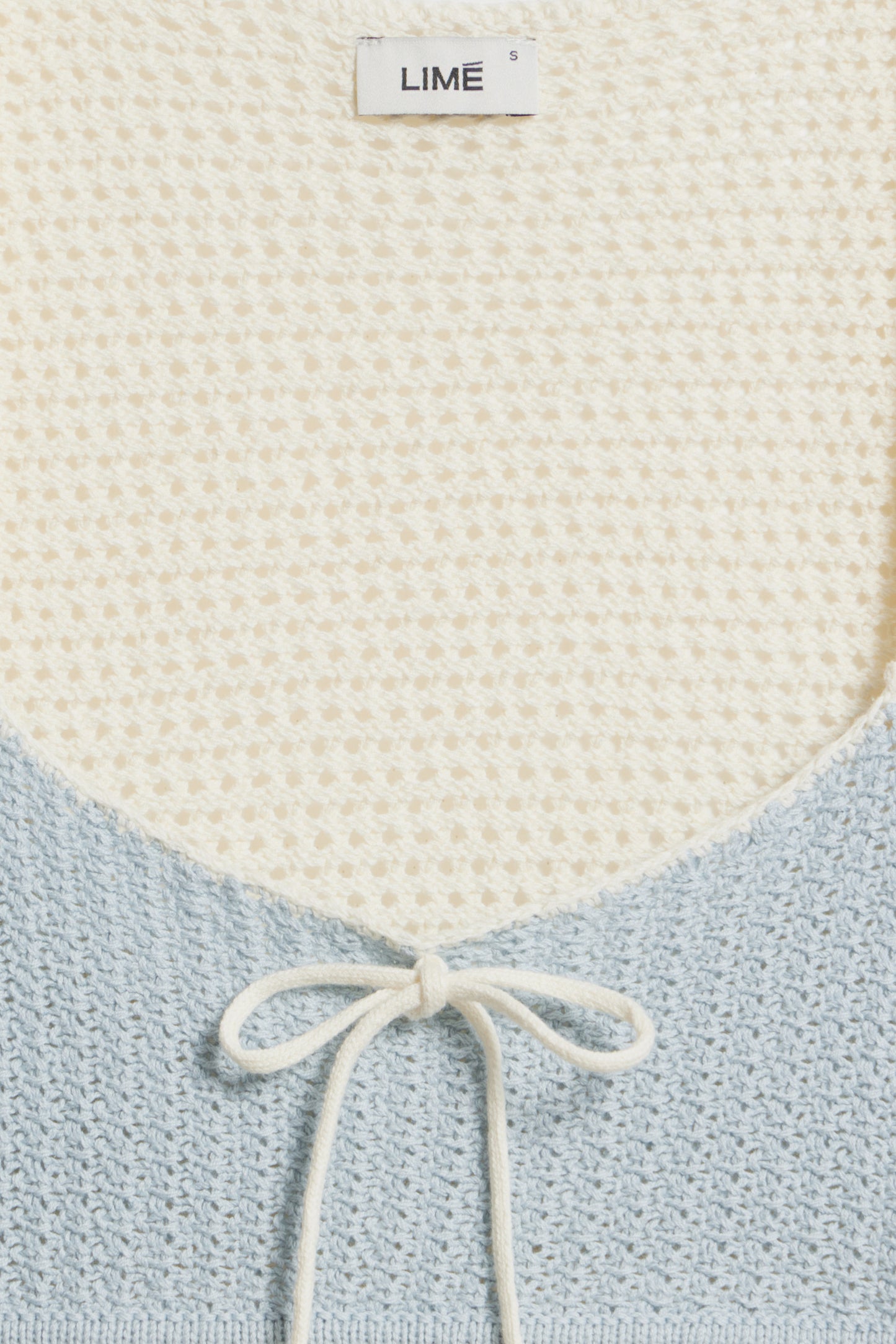 Cropped fitted bustier top crafted from cotton. Square neckline with decorative small bow. Frill trim at the hem. Unlined.