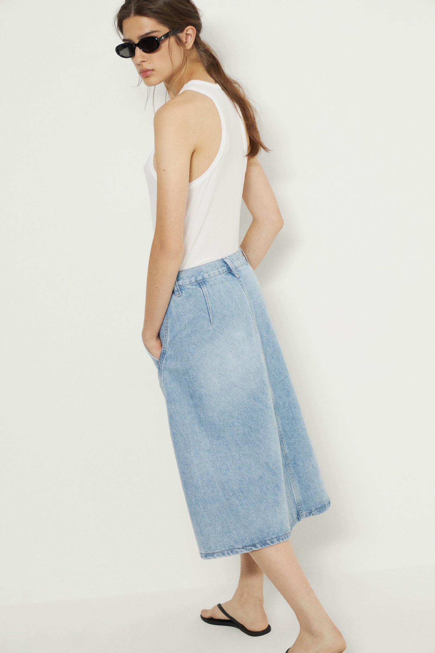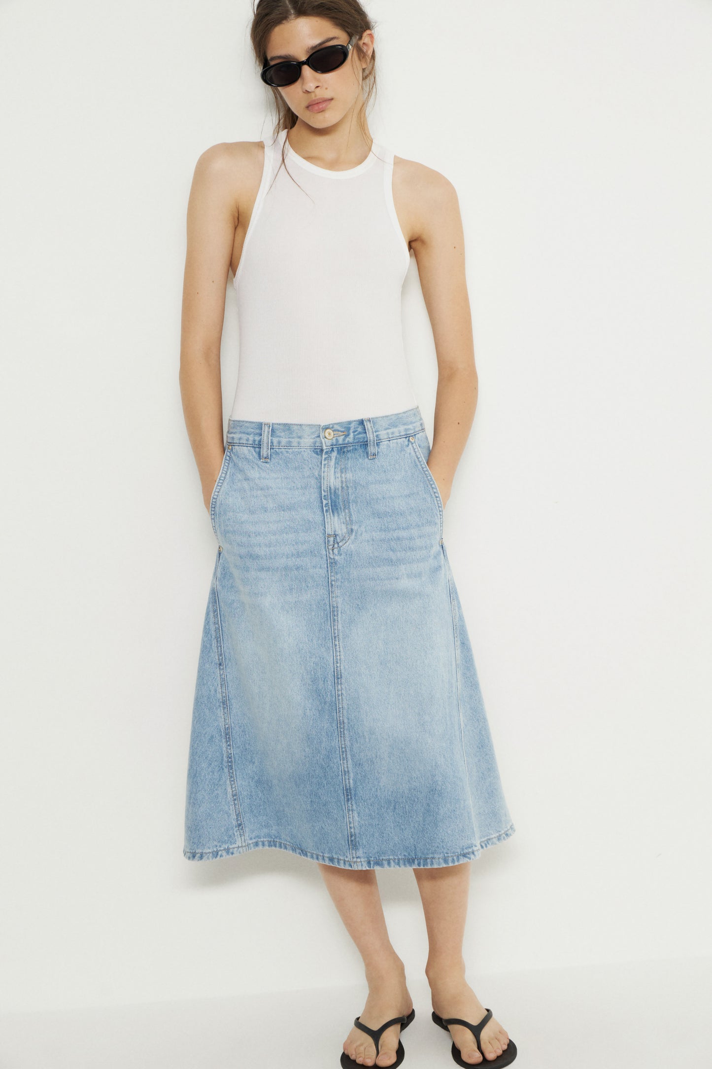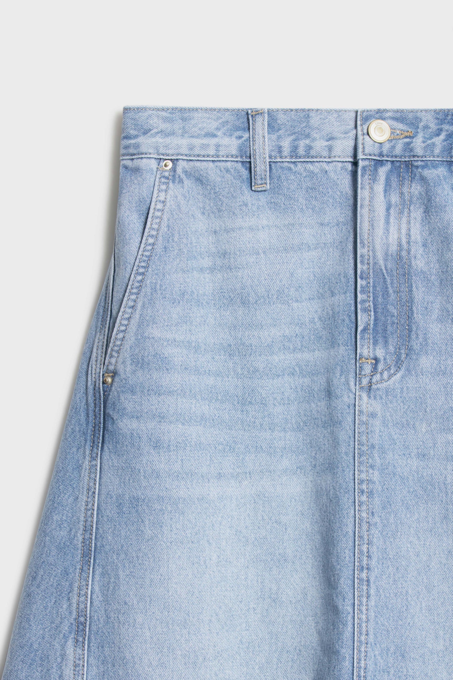 Knee-length skirt in faded denim crafted from a cotton and lyocell blend. Flared hem. Side pockets. Zip and metal button fastening.