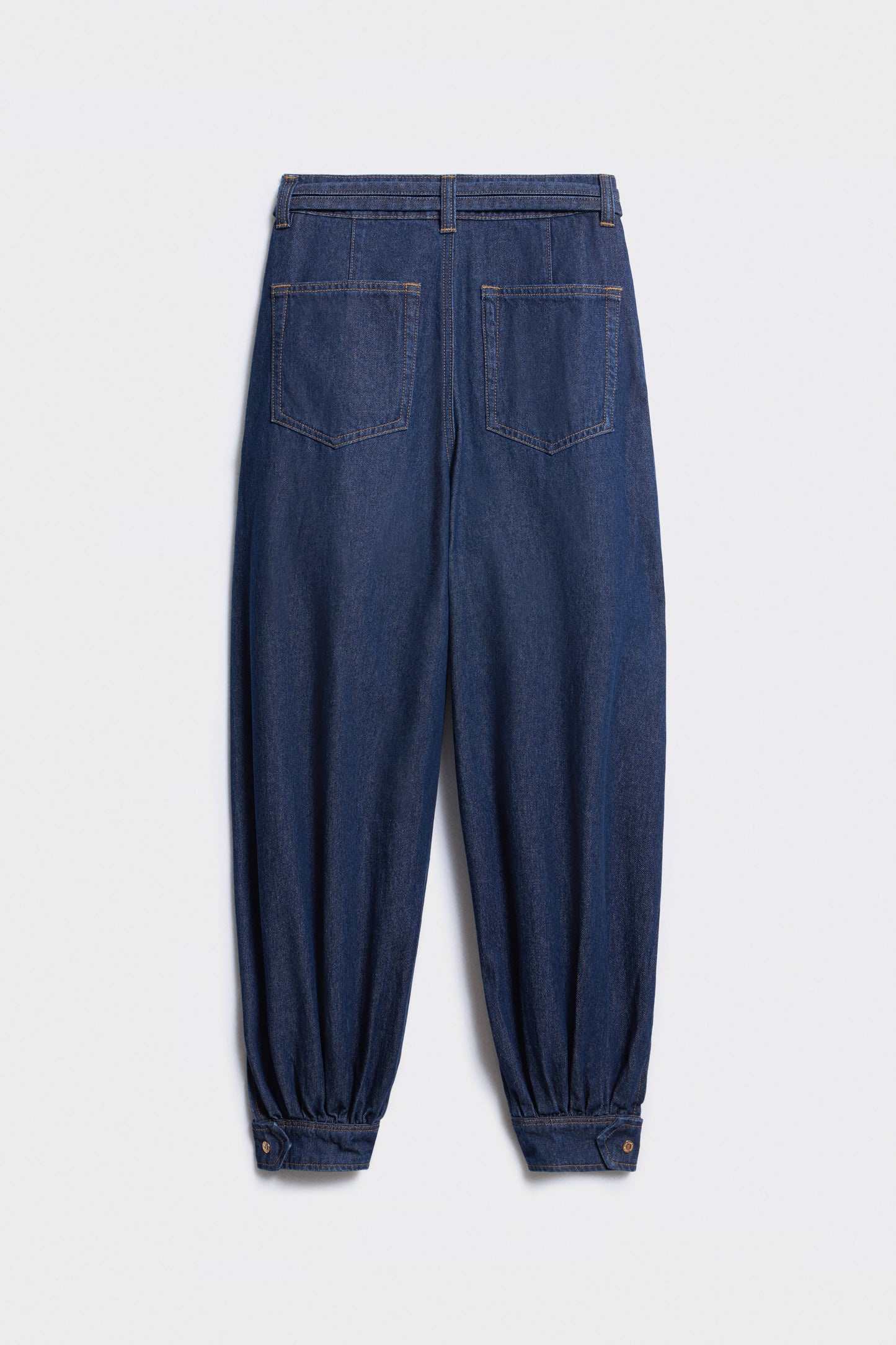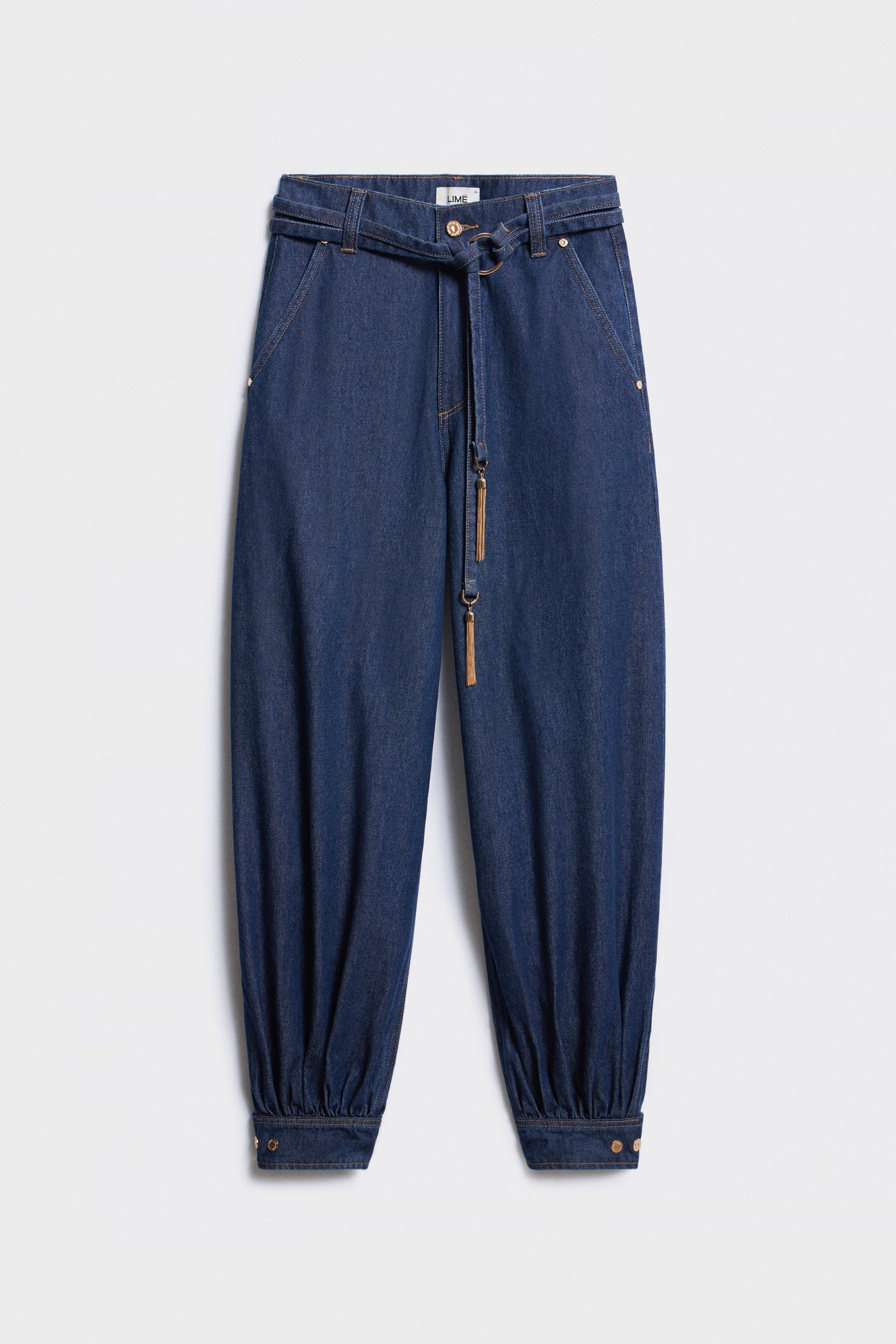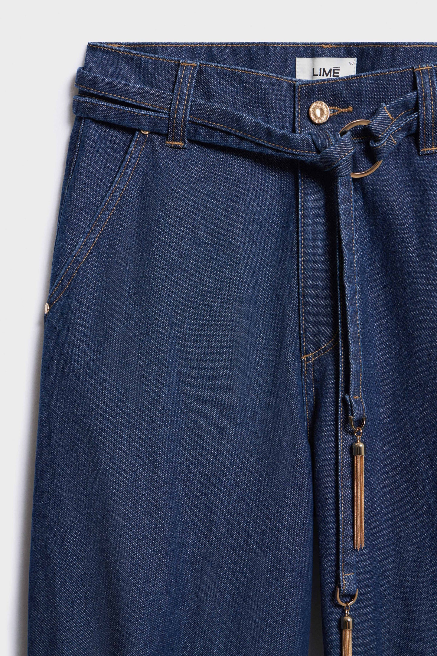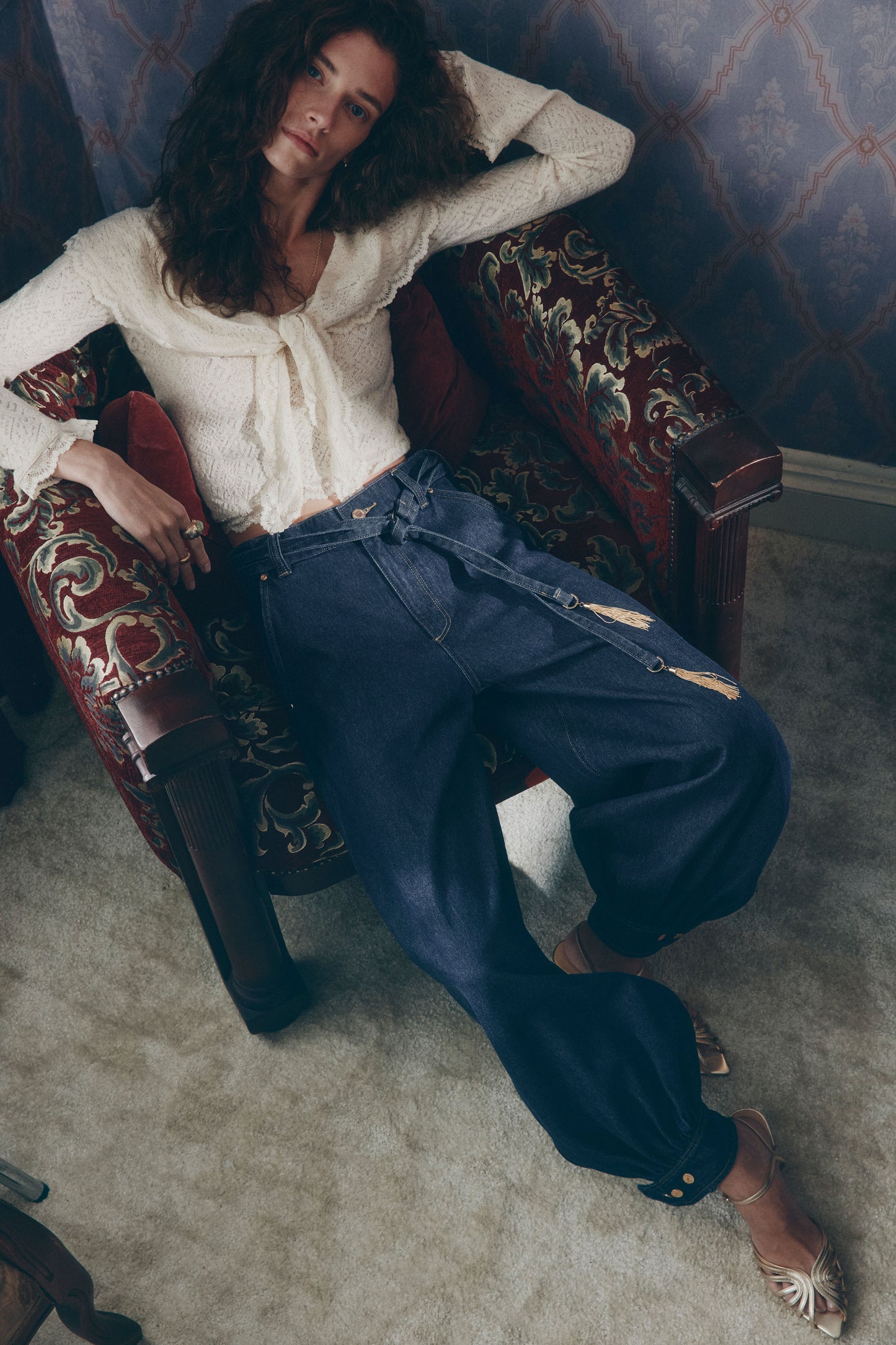 Loose-fit jeans in cotton and lyocell blend. Mid waist with button, diagonal side and back pockets. Narrow, extra-long tie belt with tassels that wraps around waist. Wide legs with snap buttoned cuffs.