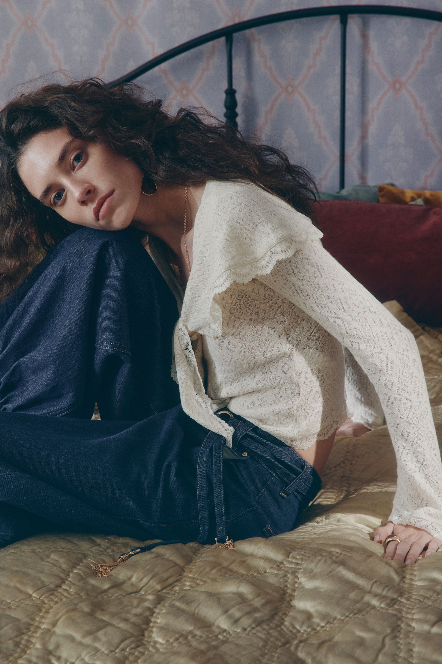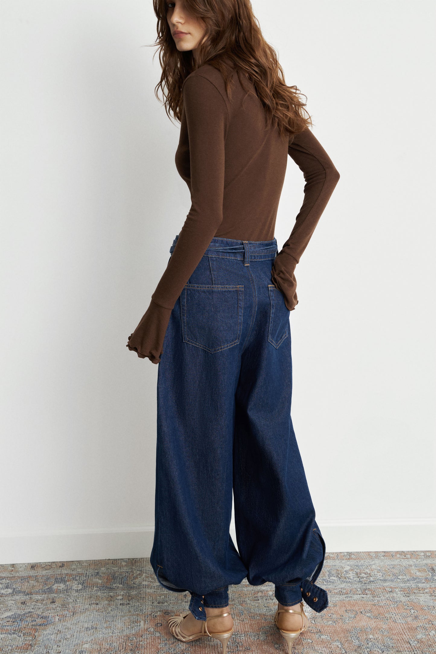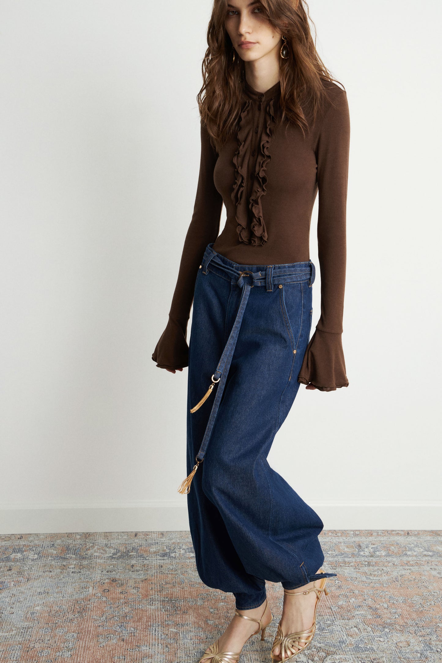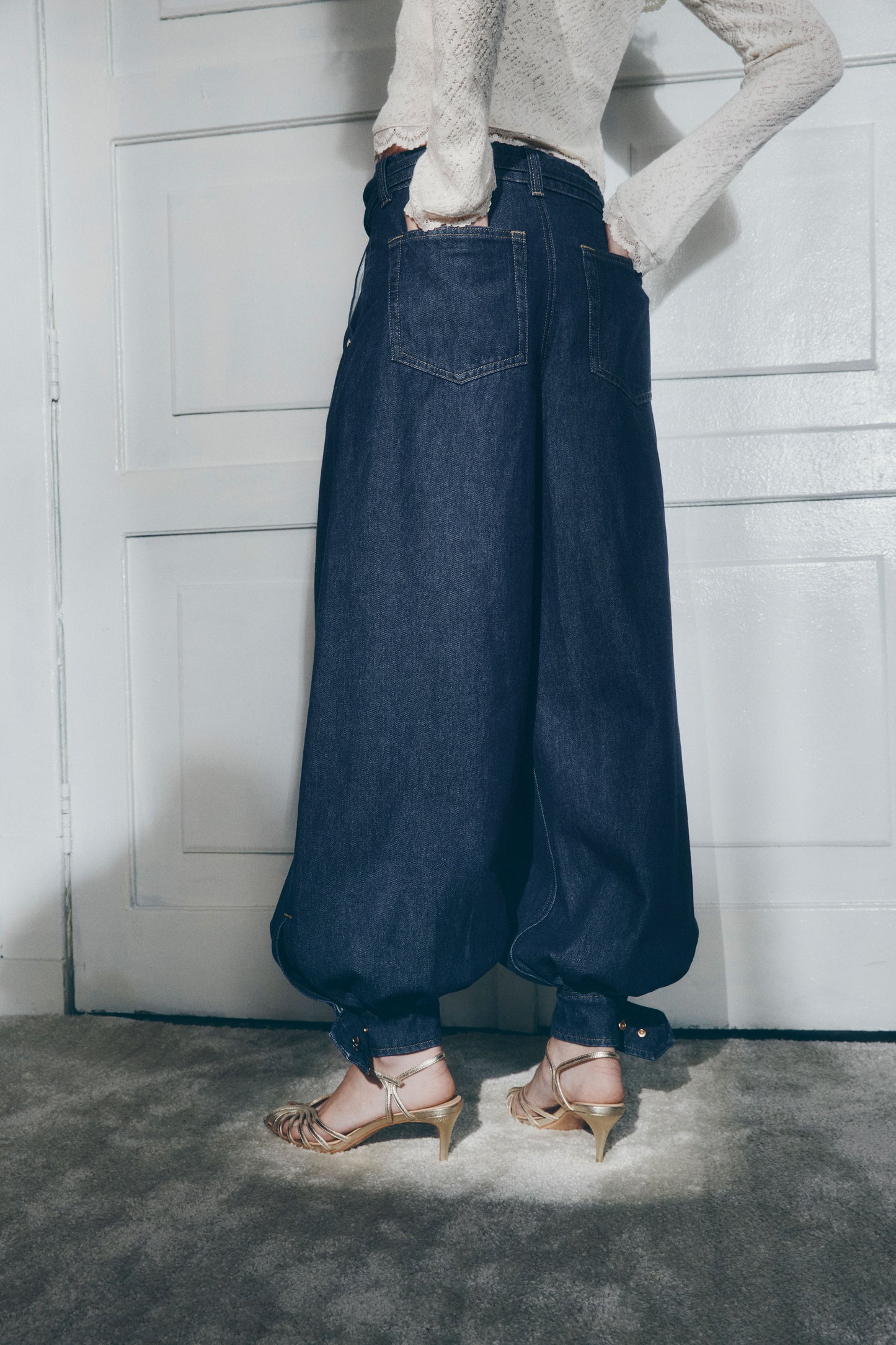 Loose-fit jeans in cotton and lyocell blend. Mid waist with button, diagonal side and back pockets. Narrow, extra-long tie belt with tassels that wraps around waist. Wide legs with snap buttoned cuffs.