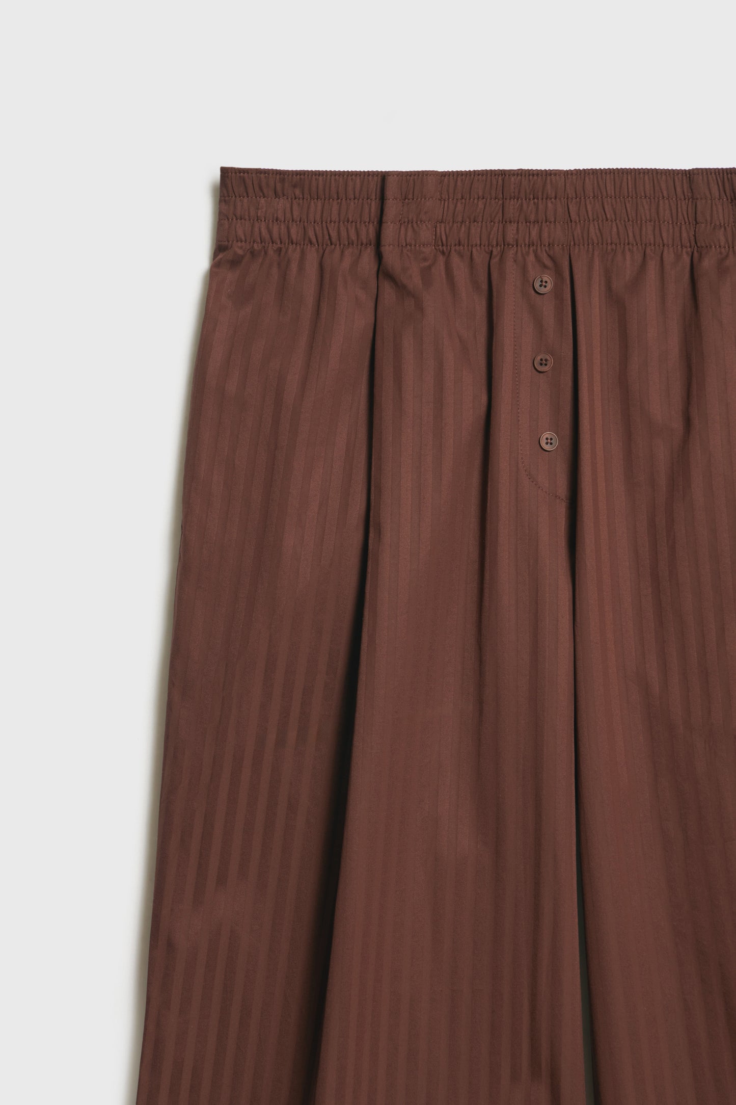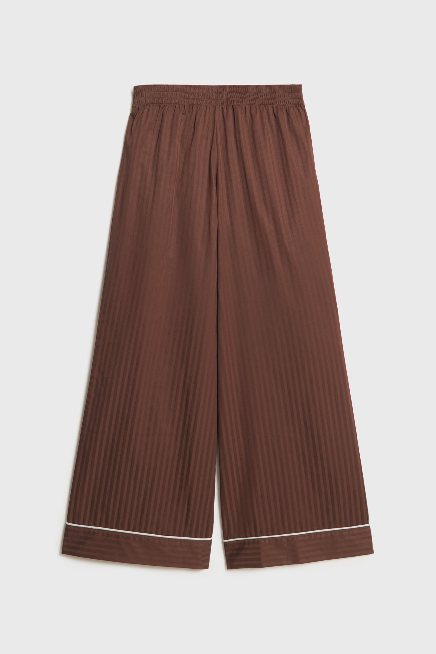 Trousers in cotton with contrasting color piping. Featuring a fake front fly and a paperbag waist with pleats. Side pockets and turn-up hems.