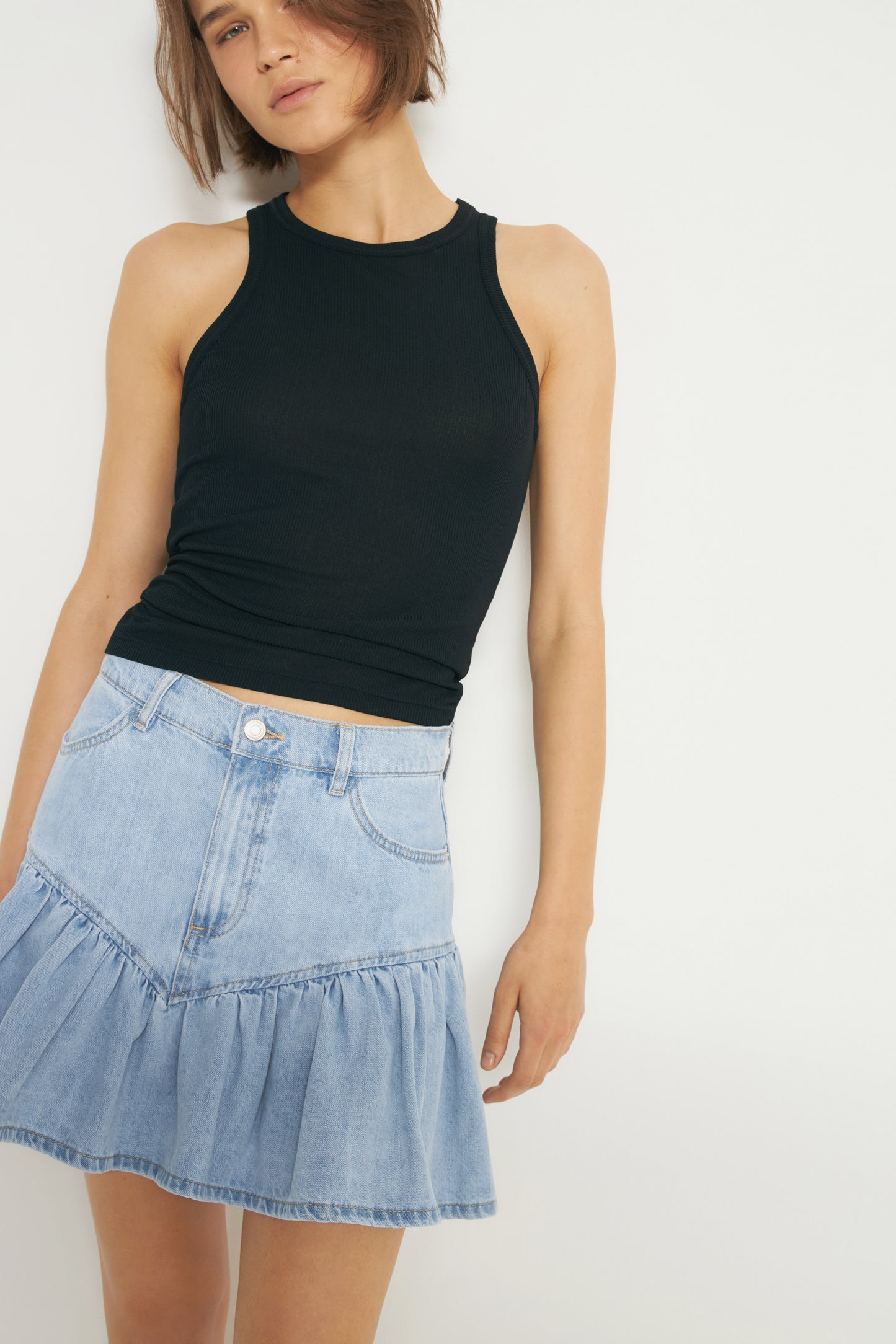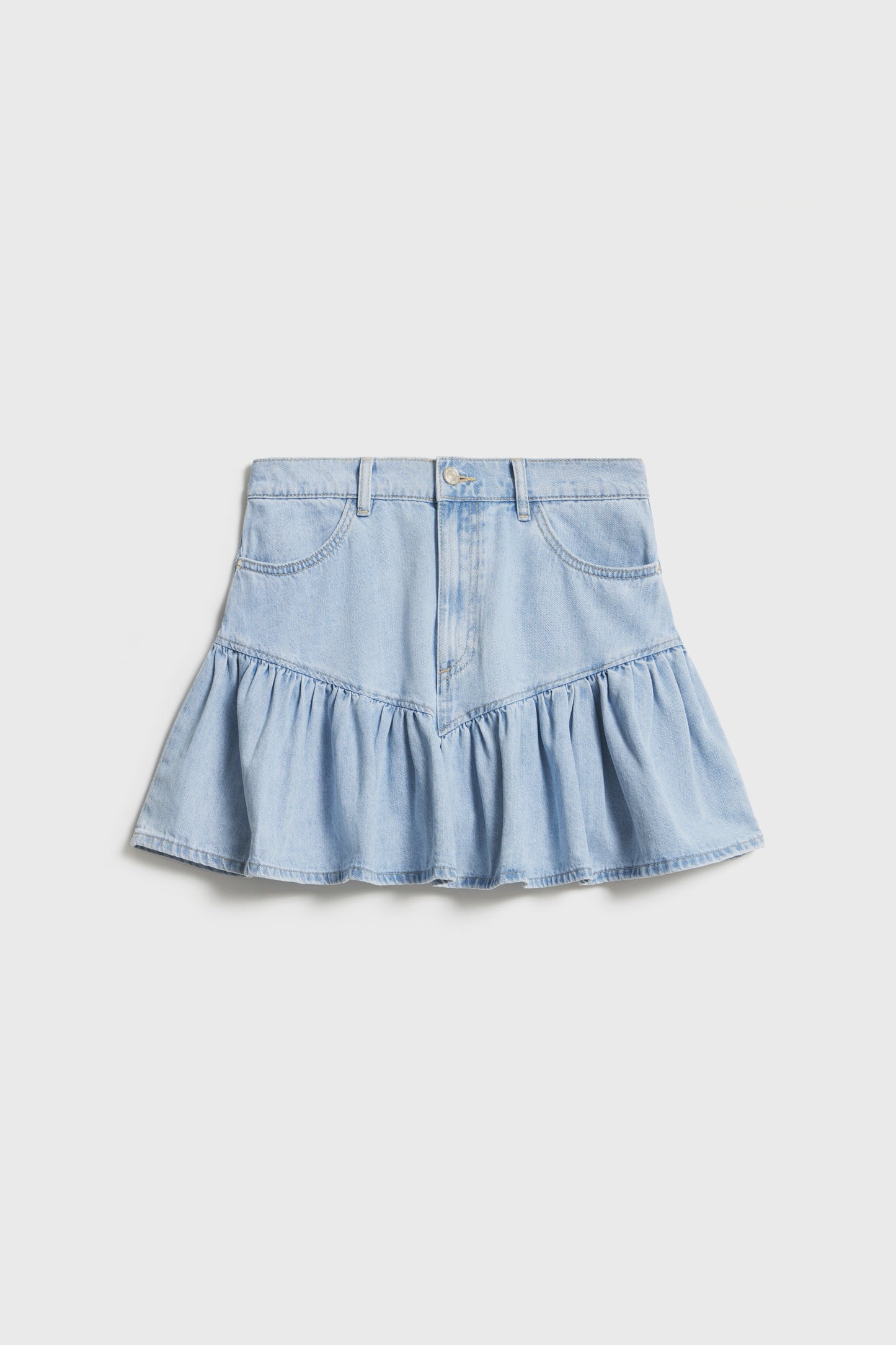 Short skirt in soft denim crafted from cotton and viscose blend. Wide waistband and a flared, ruffle-trimmed hem. Front pockets. Button fly.