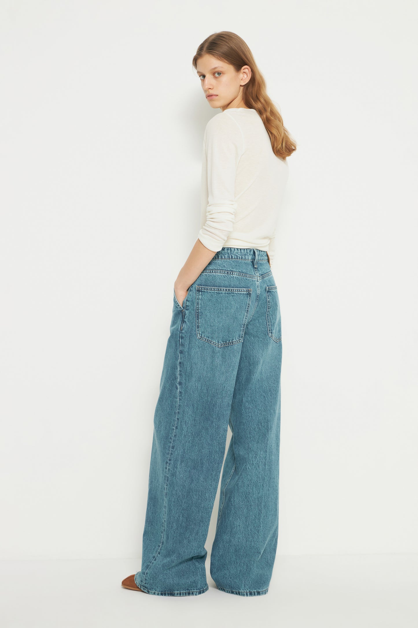 Cotton denim jeans with front and back pockets. Wide-leg design featuring a mid waist and press creases. Leather label detail. Front zip fly and top button fastening.