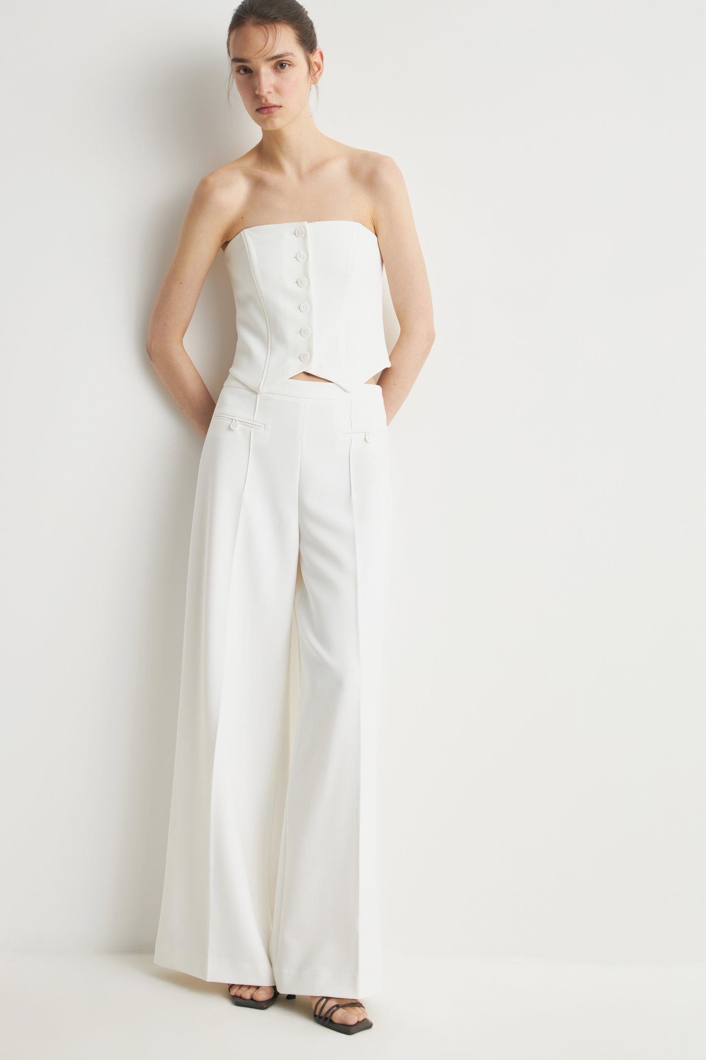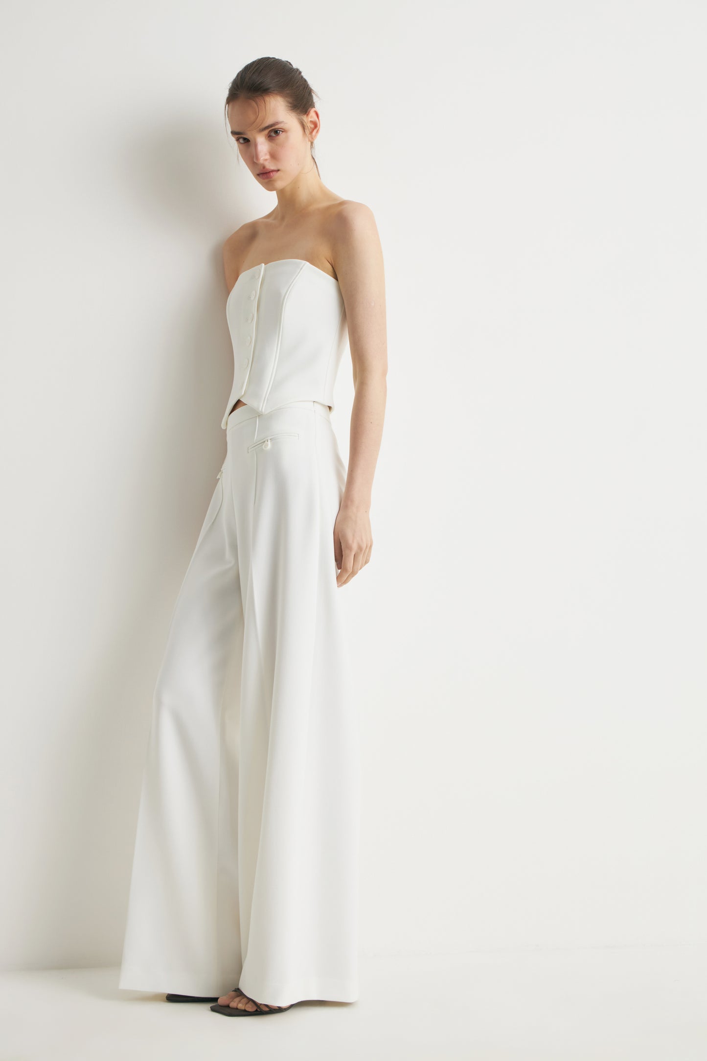 Loose-fit trousers in heavy stretch fabric with wide legs. Side zip closure and creases down the front. Buttoned decorative welt pockets.