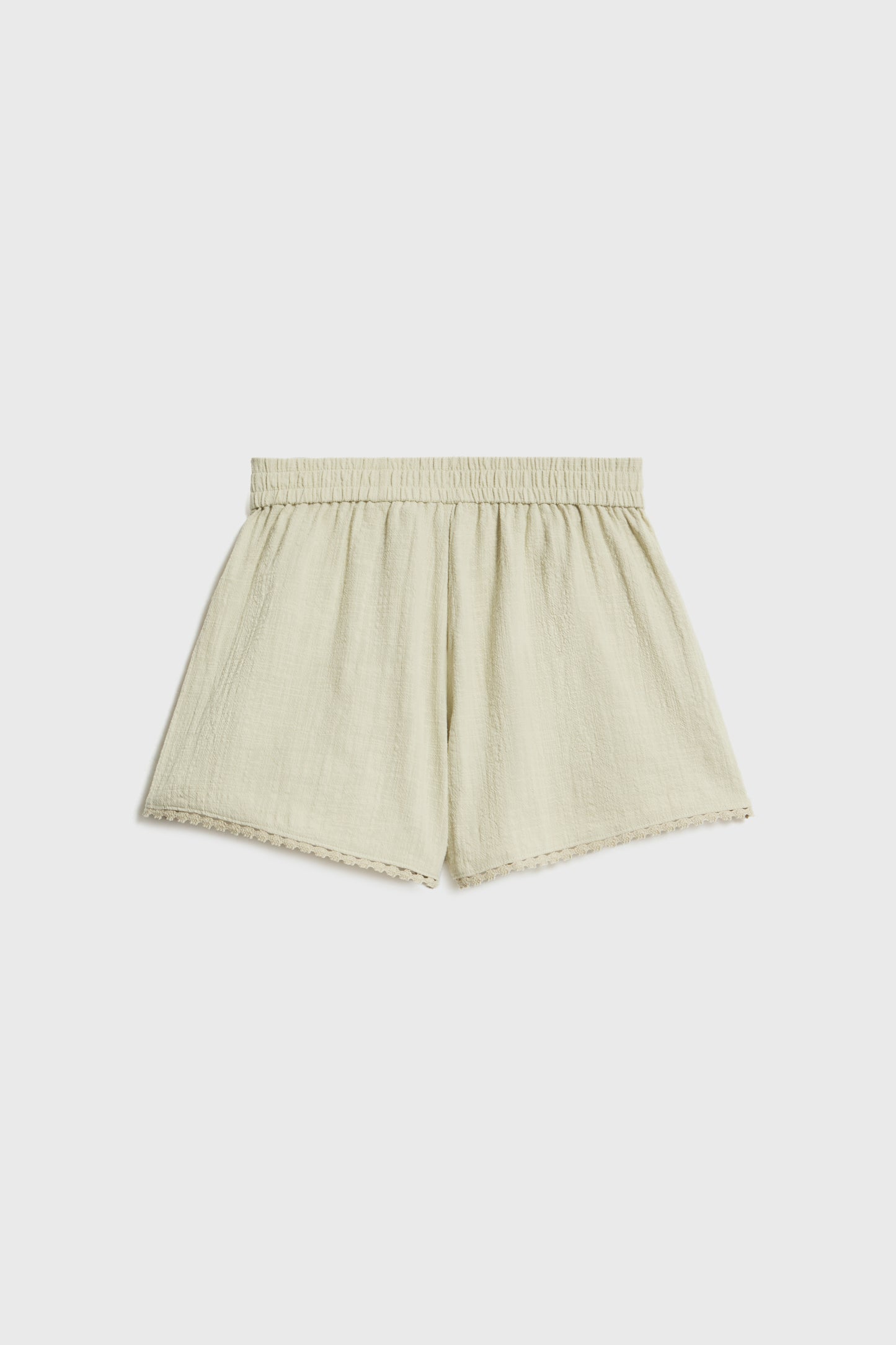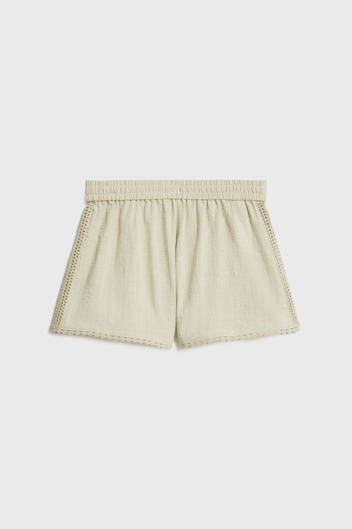 Beach shorts in cotton with crochet-look knit details. Regular waist, covered elastic at the waistband.
