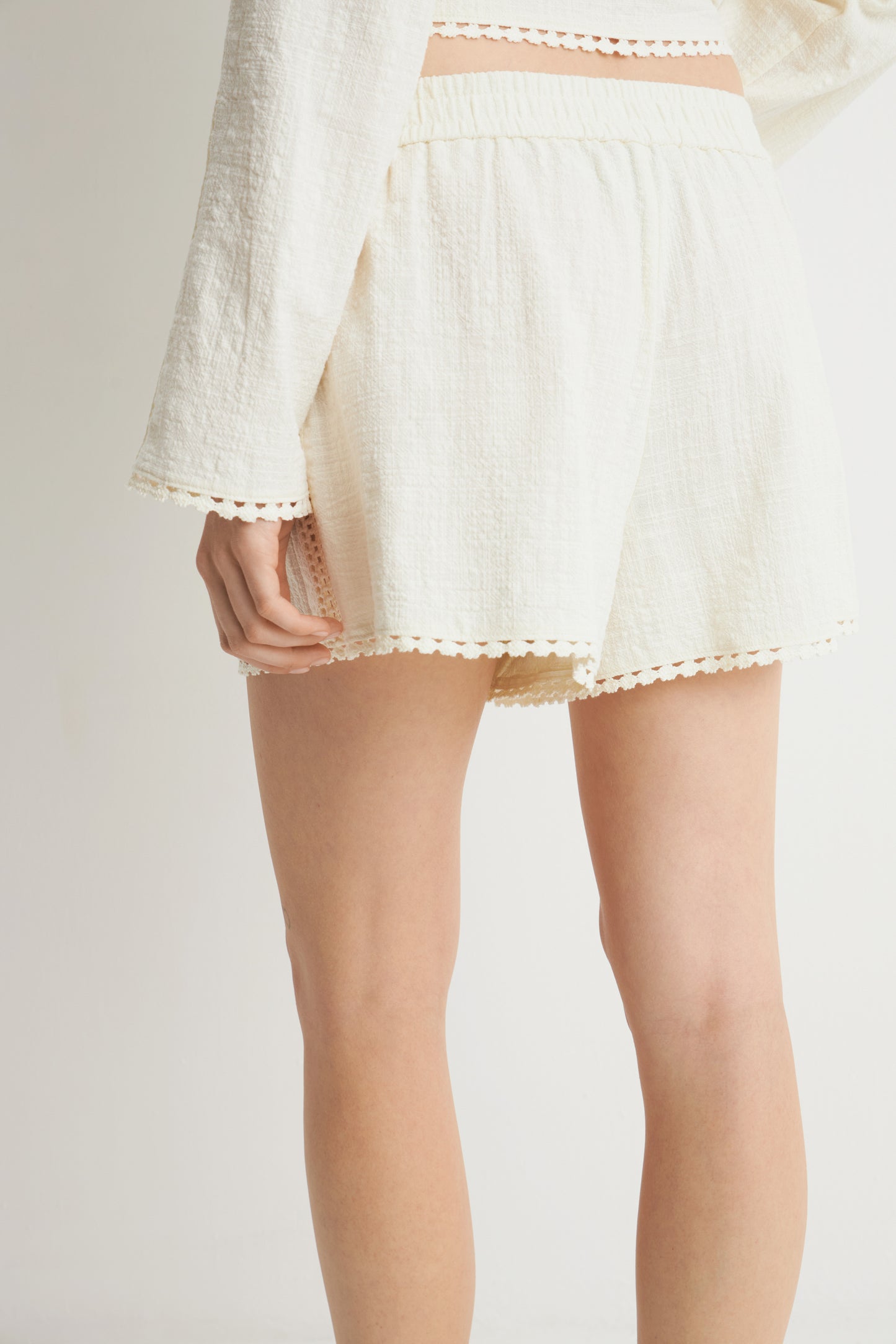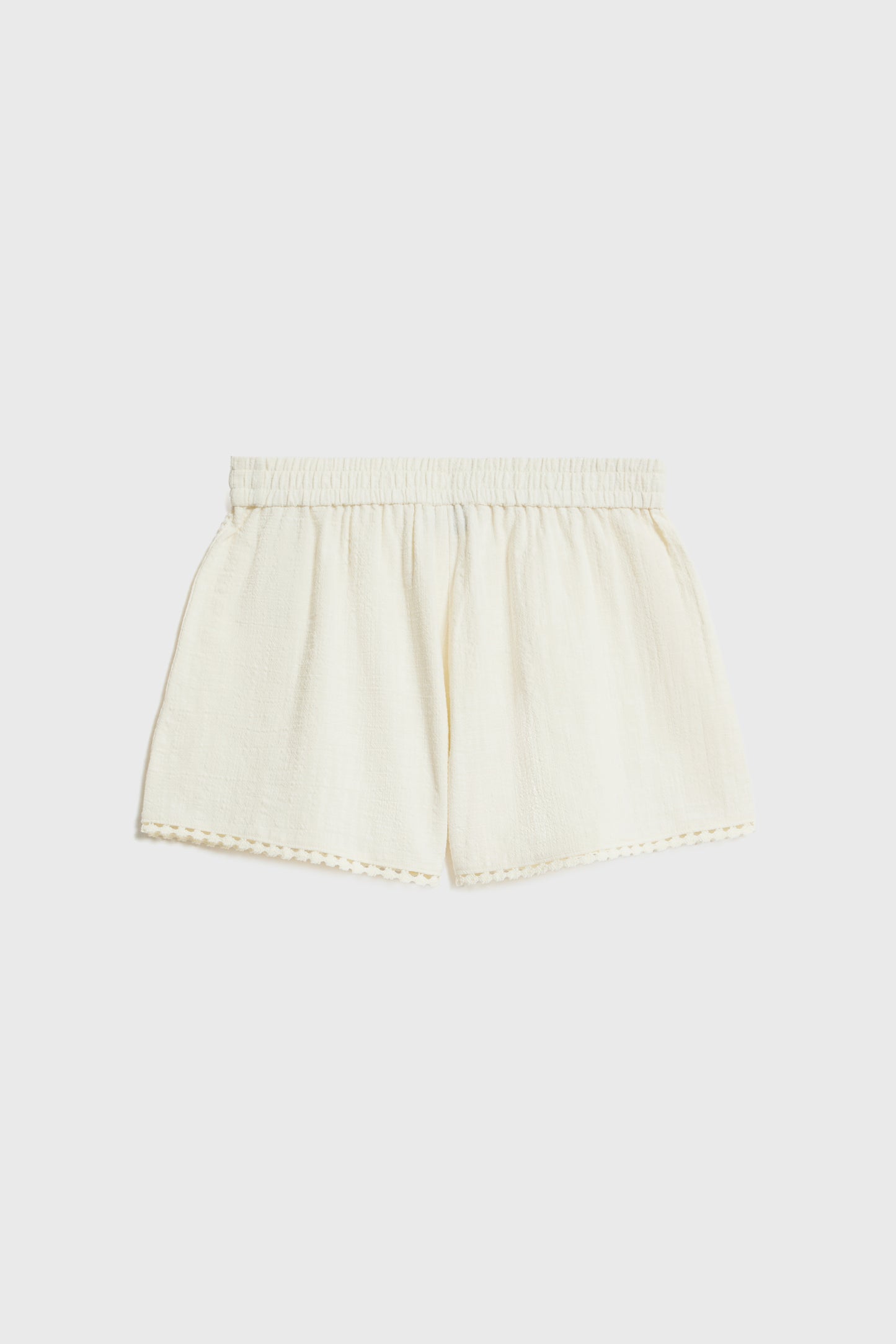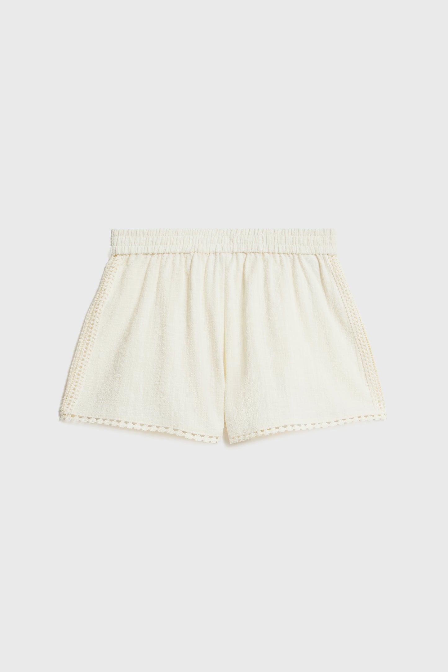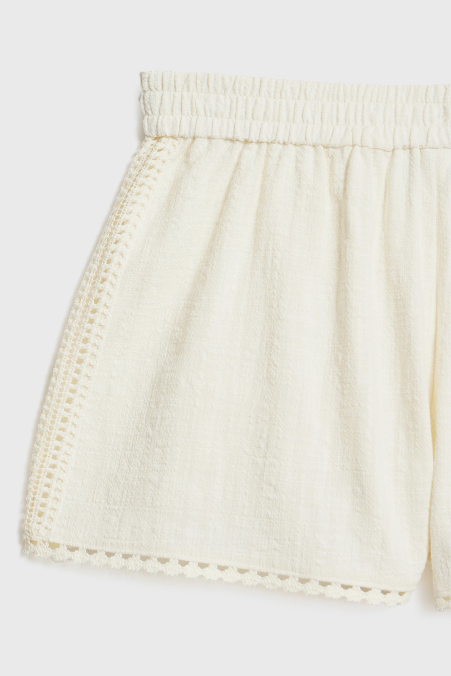 Beach shorts in cotton with crochet-look knit details. Regular waist, covered elastic at the waistband.