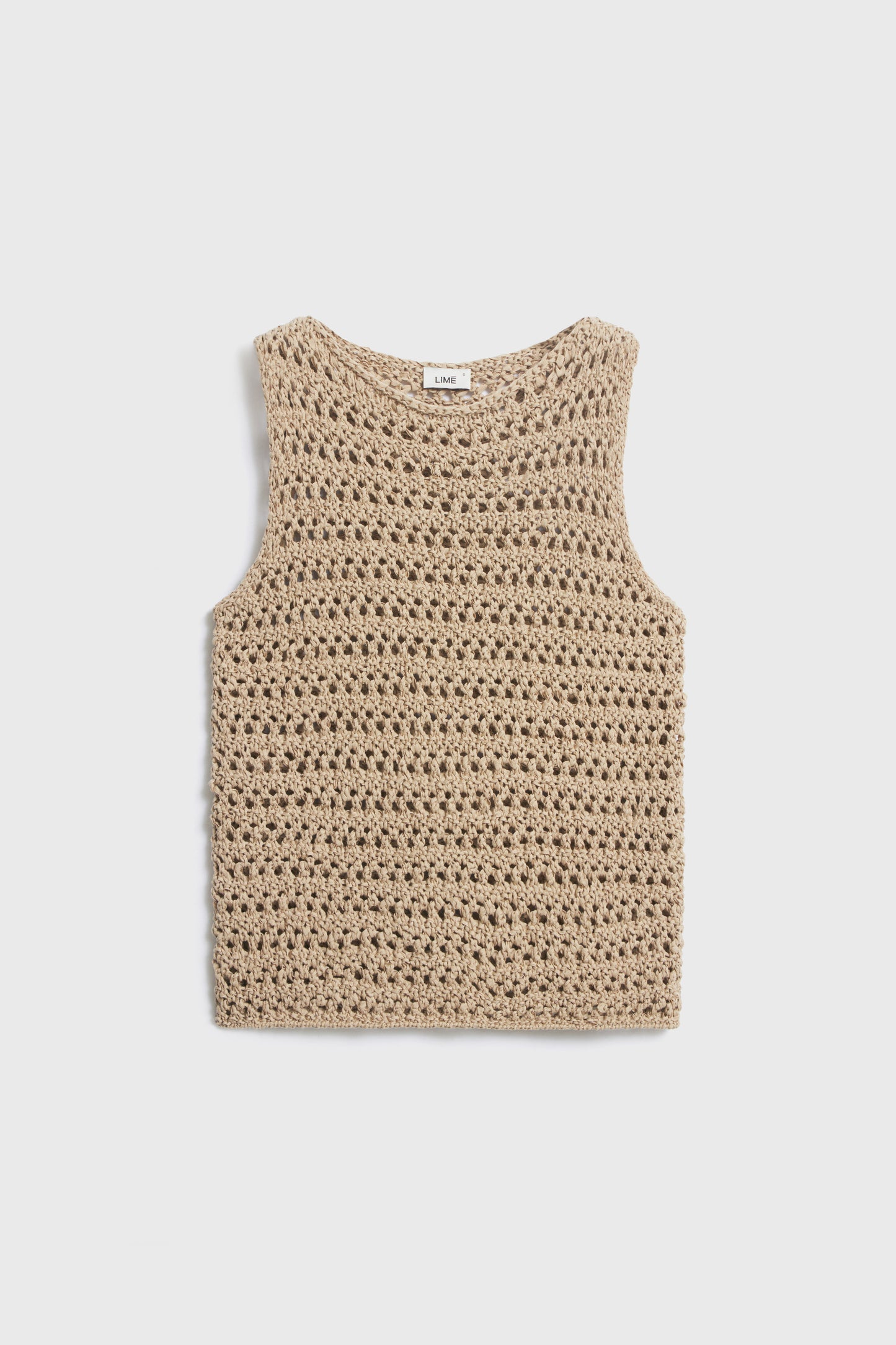 Round neck top in crochet-look knit cotton blend. Figure-hugging silhouette.
