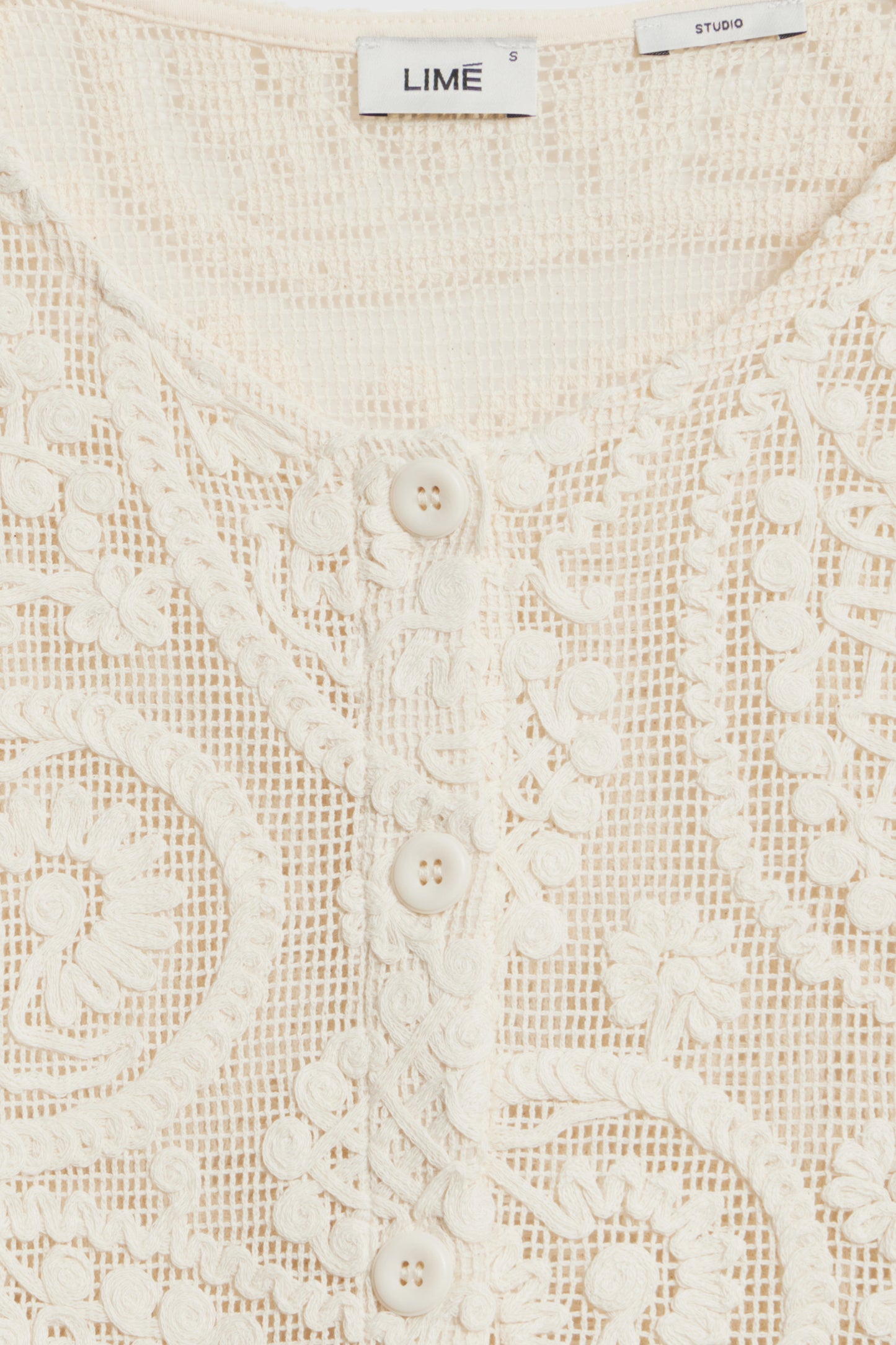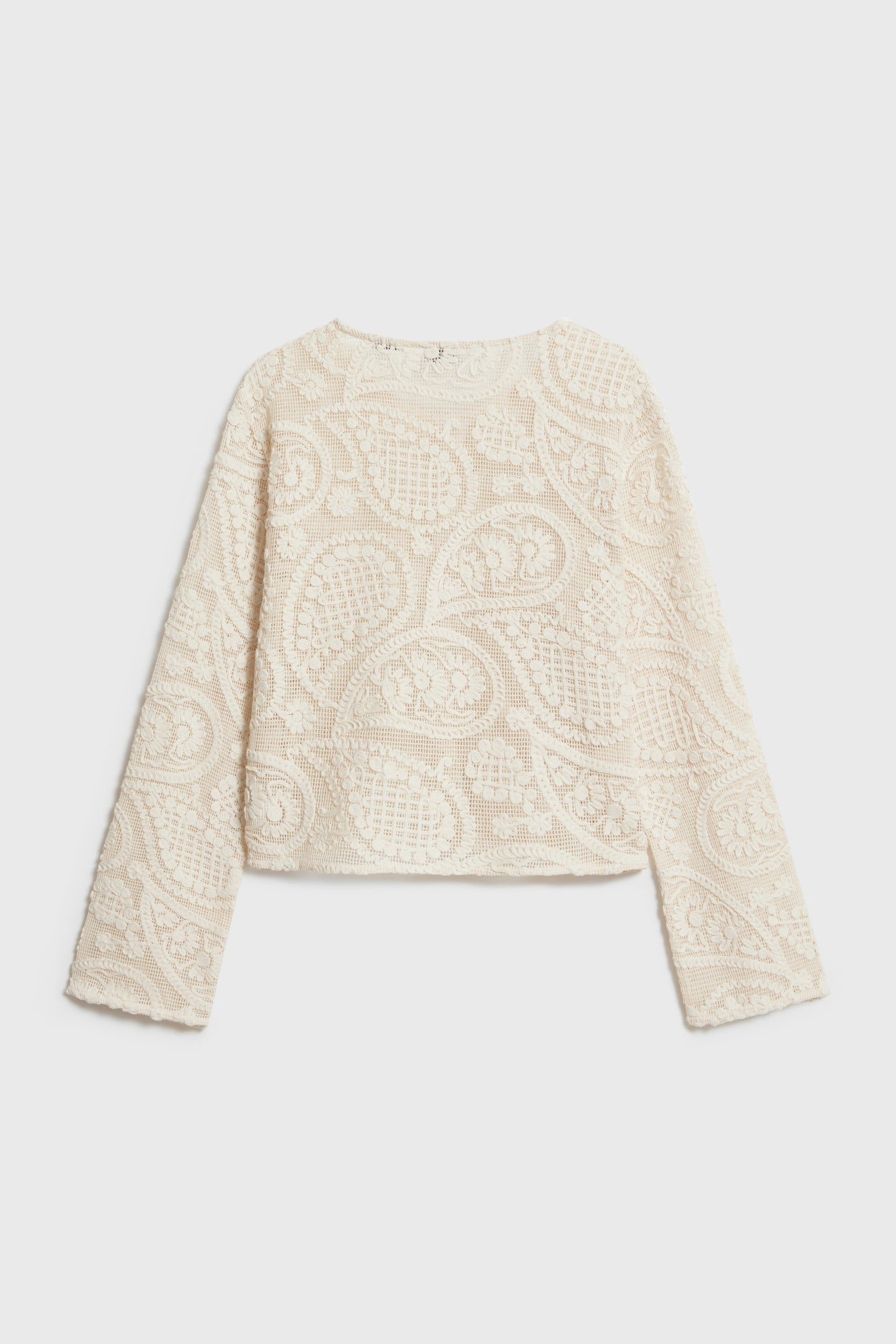 Long-sleeved top in a crochet-look cotton with a round neckline and button front. Adorned with a bohemian-inspired ethnic motif. Unlined for a lightweight feel, it looks best paired with the matching piece.