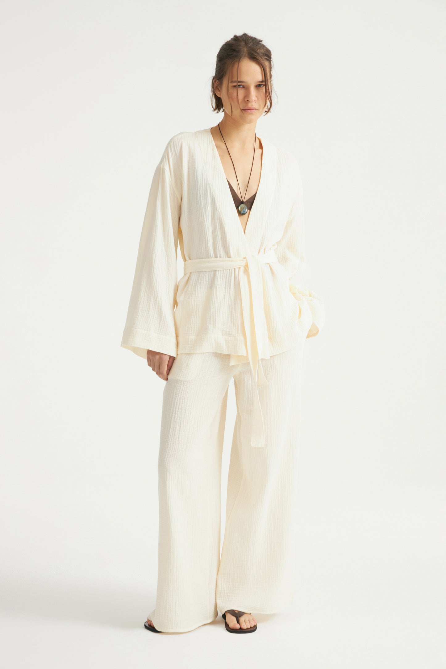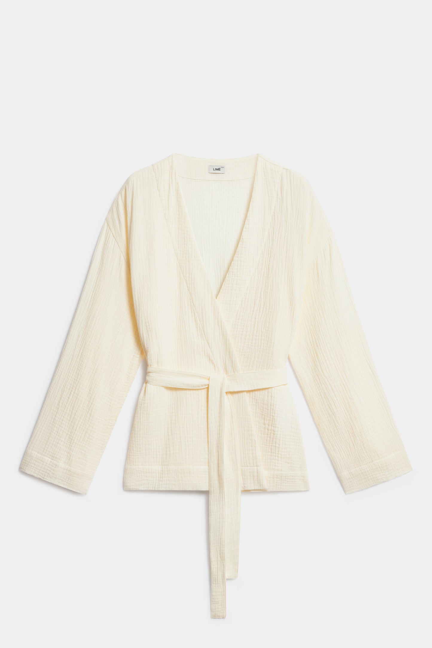 Oversized kimono-style blouse made of soft cotton muslin. Wrap-style piece ties at the waist with a matching belt.