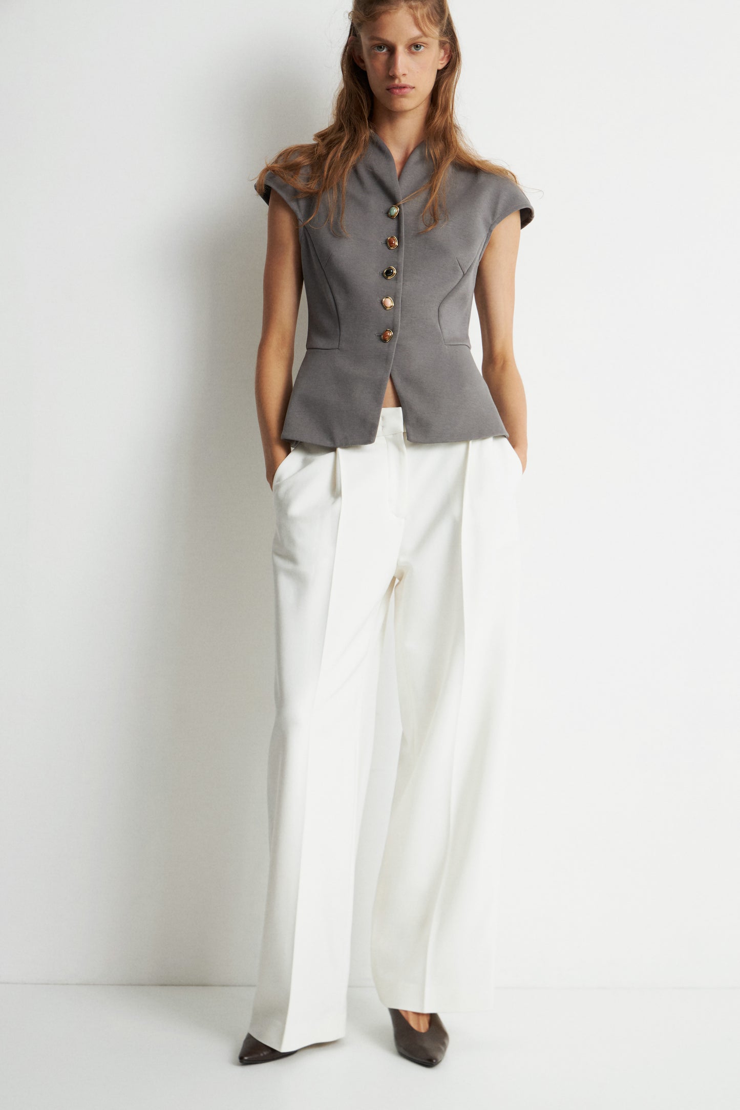 Tailored blouse in a cotton blend with embellishments for front fasteners. Rounded stand collar.