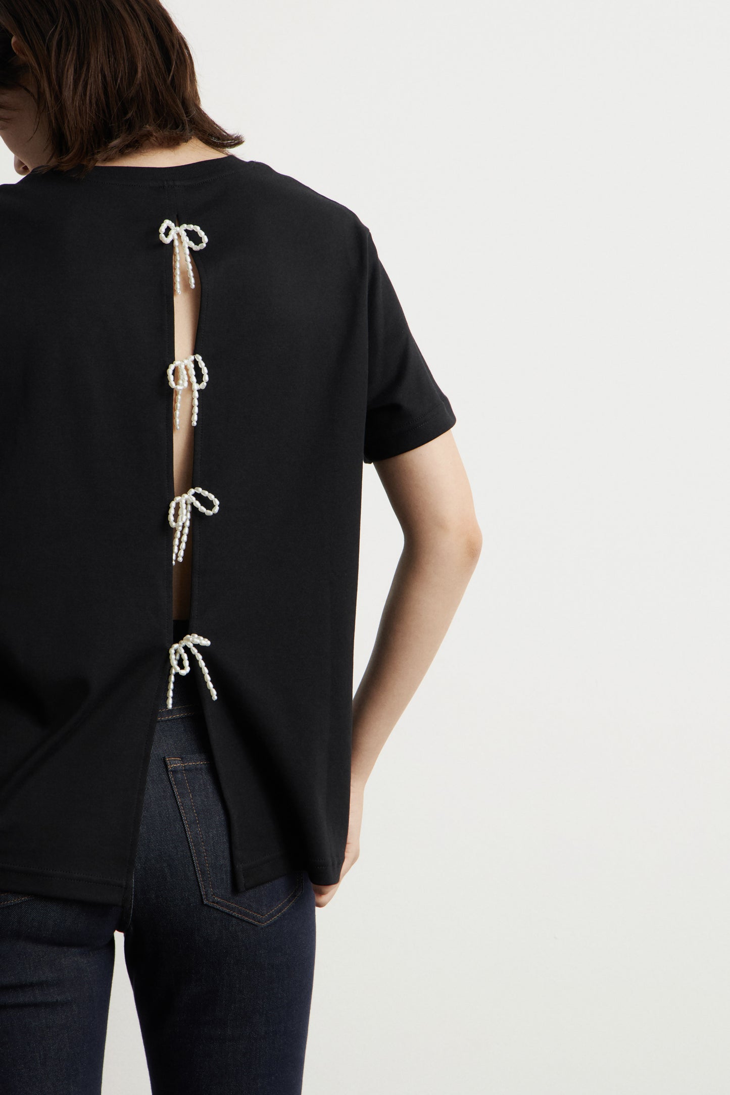 Round neck T-shirt in a cotton with short sleeves. Embellished with pearly beads that form bows at the back.