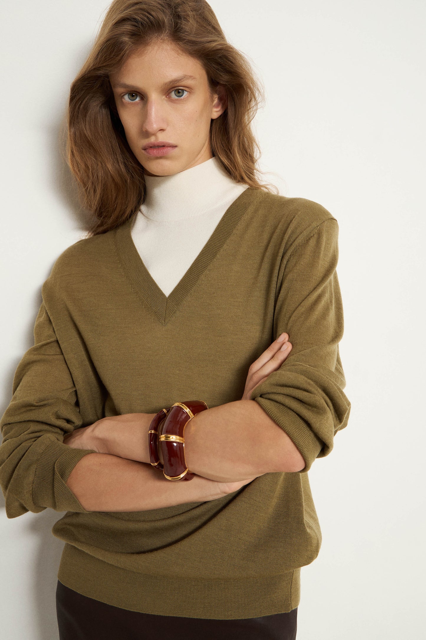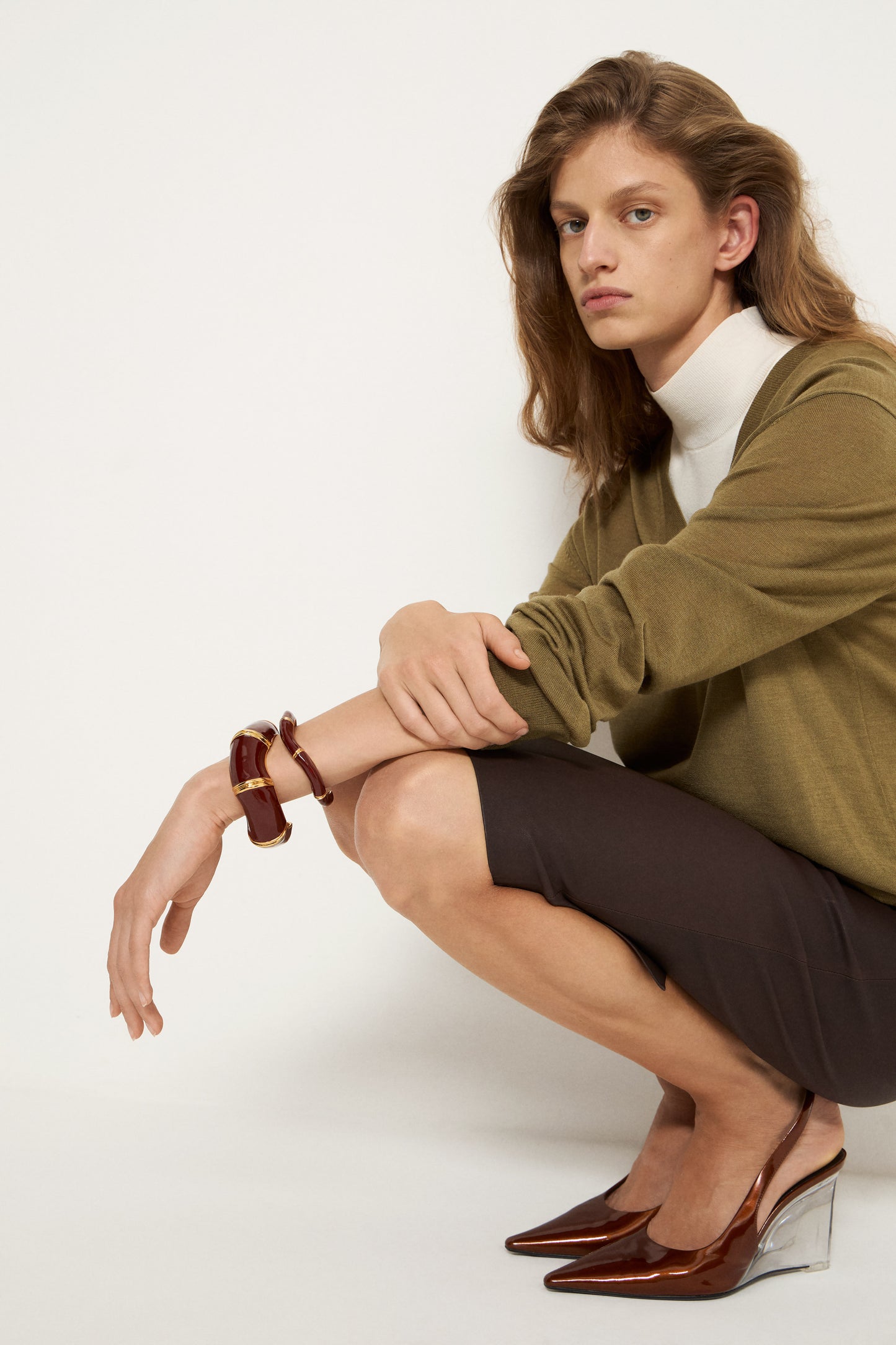 Thin bangle in gold-tone metal with a curved design and enameled surface. ONE SIZE: 6,4 cm