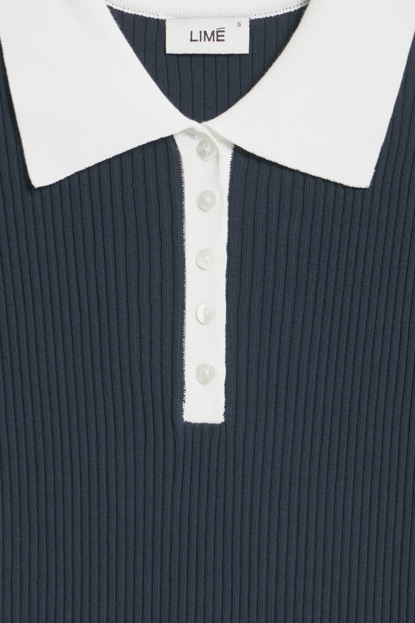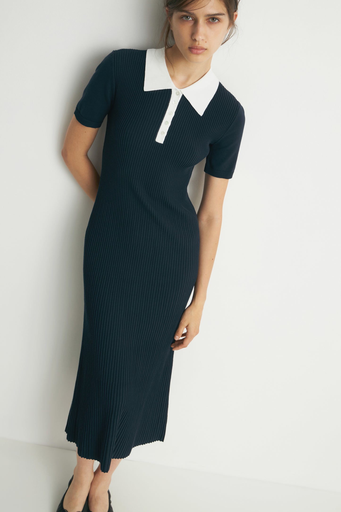 Calf-length, fitted dress in a soft, fine knit cotton with a collar, button placket and short sleeves.