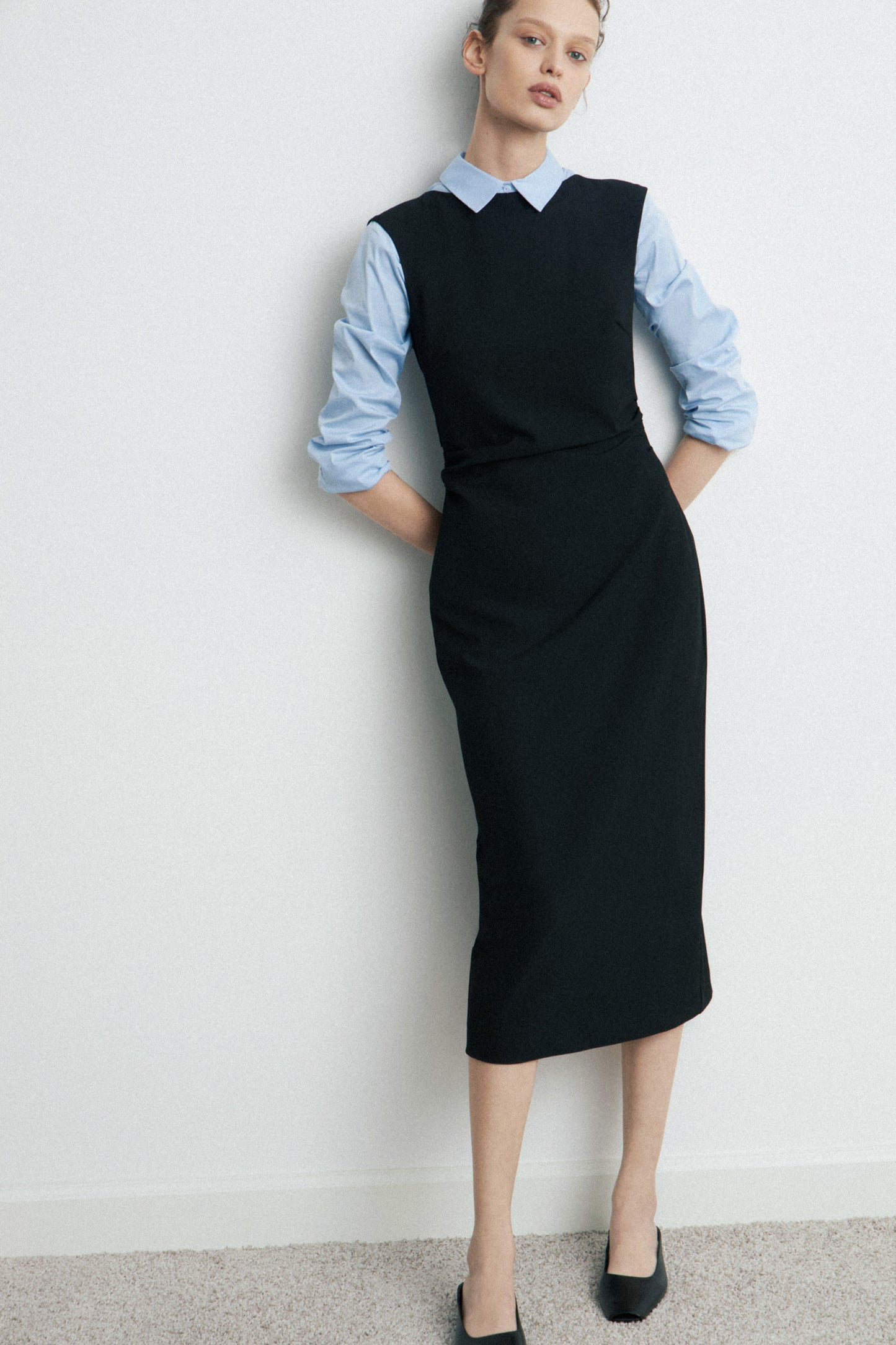 Fitted midi dress in thick suit weave. Concealed zipper at back. Gathers at waist for a flattering silhouette. Partly lining.