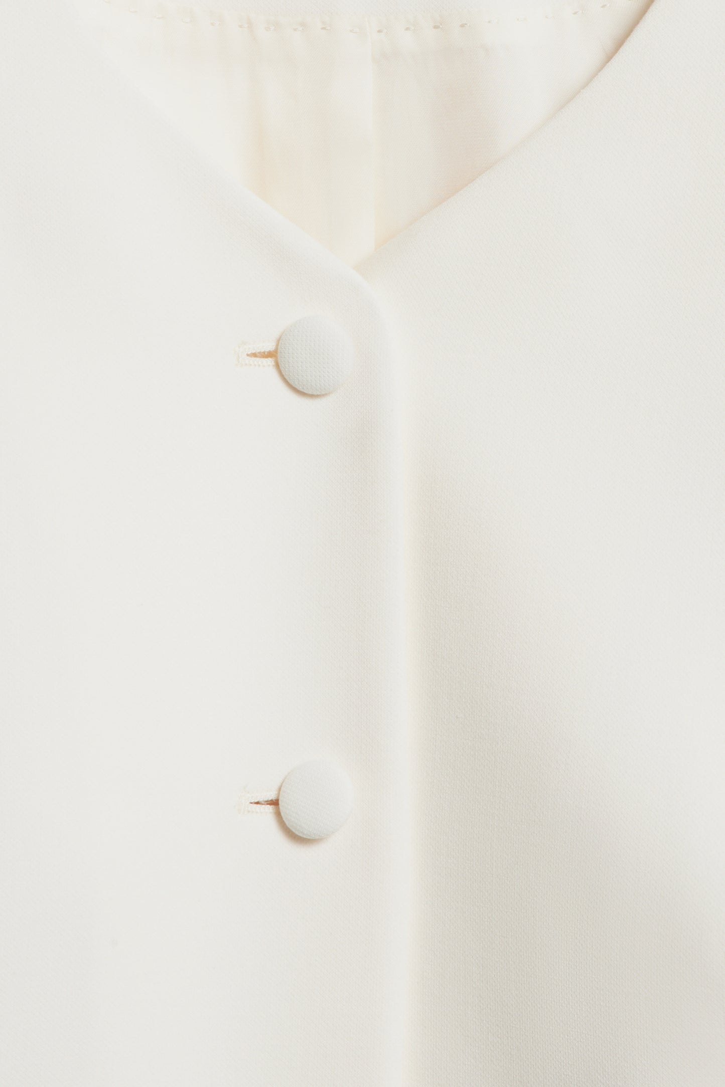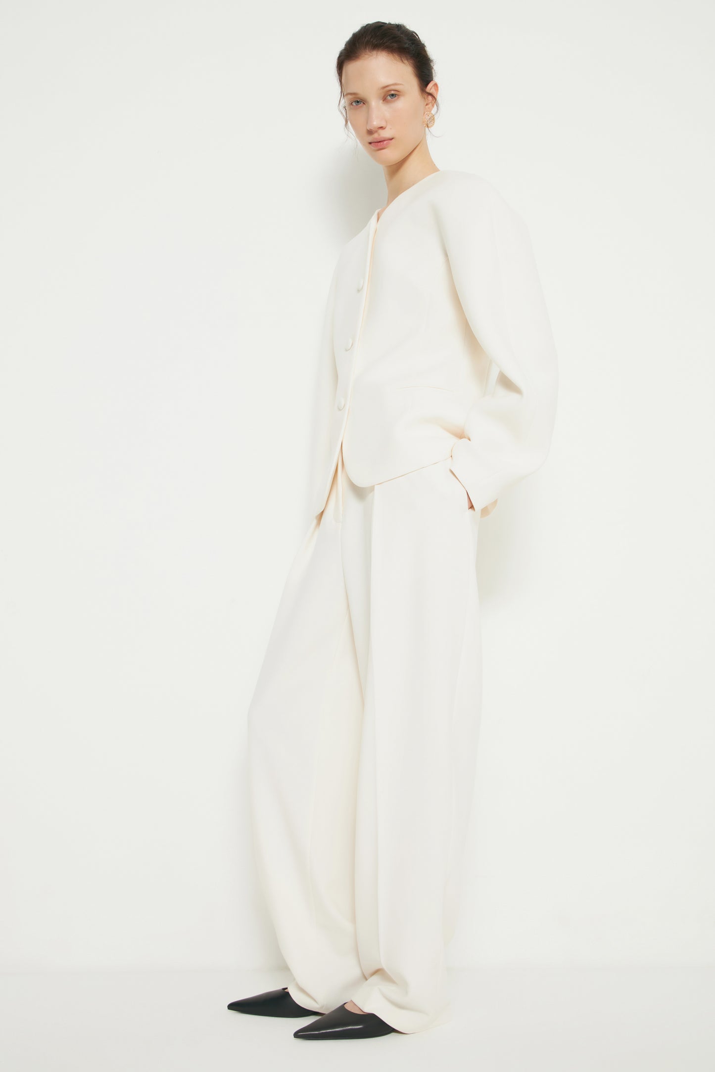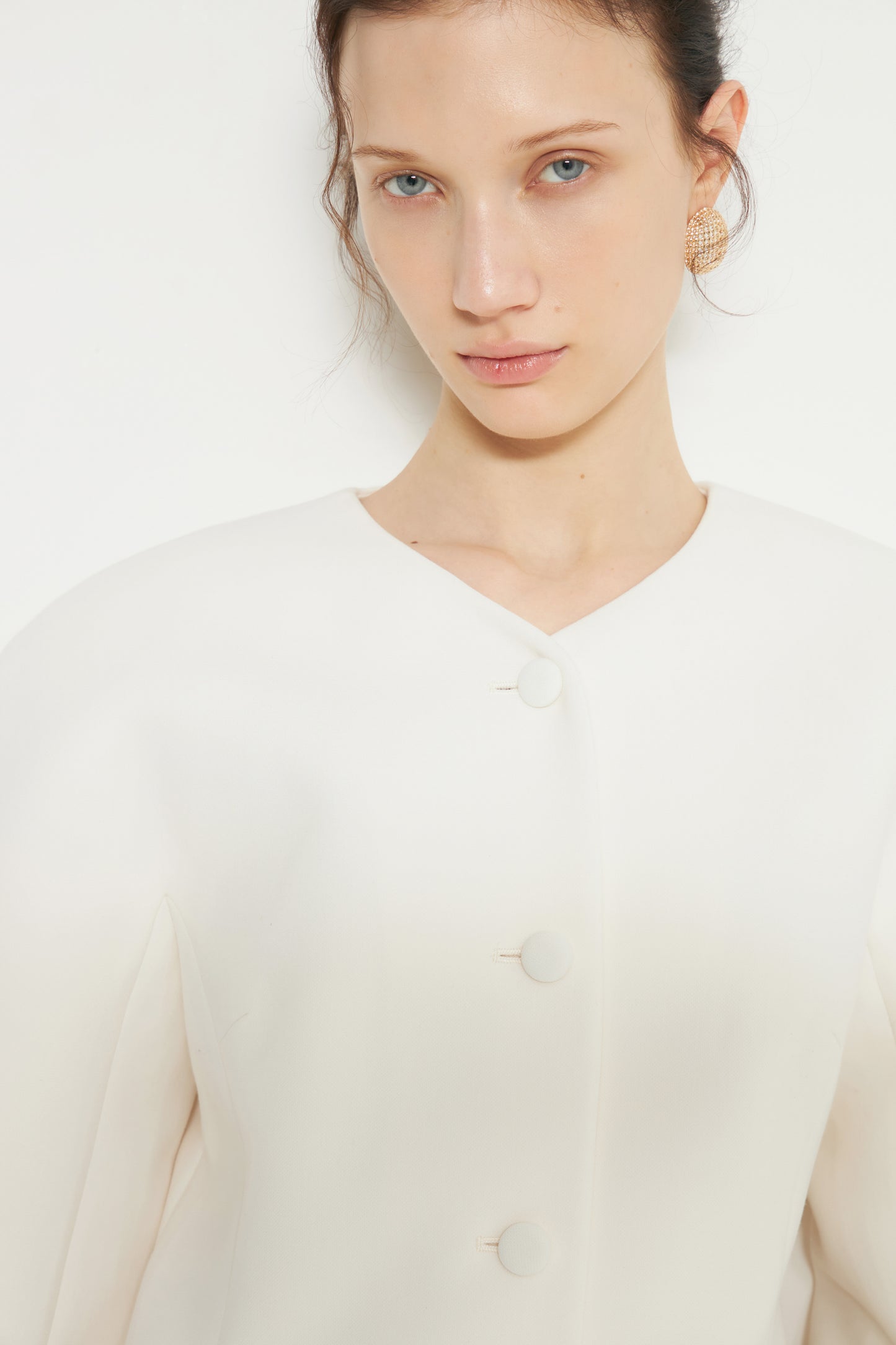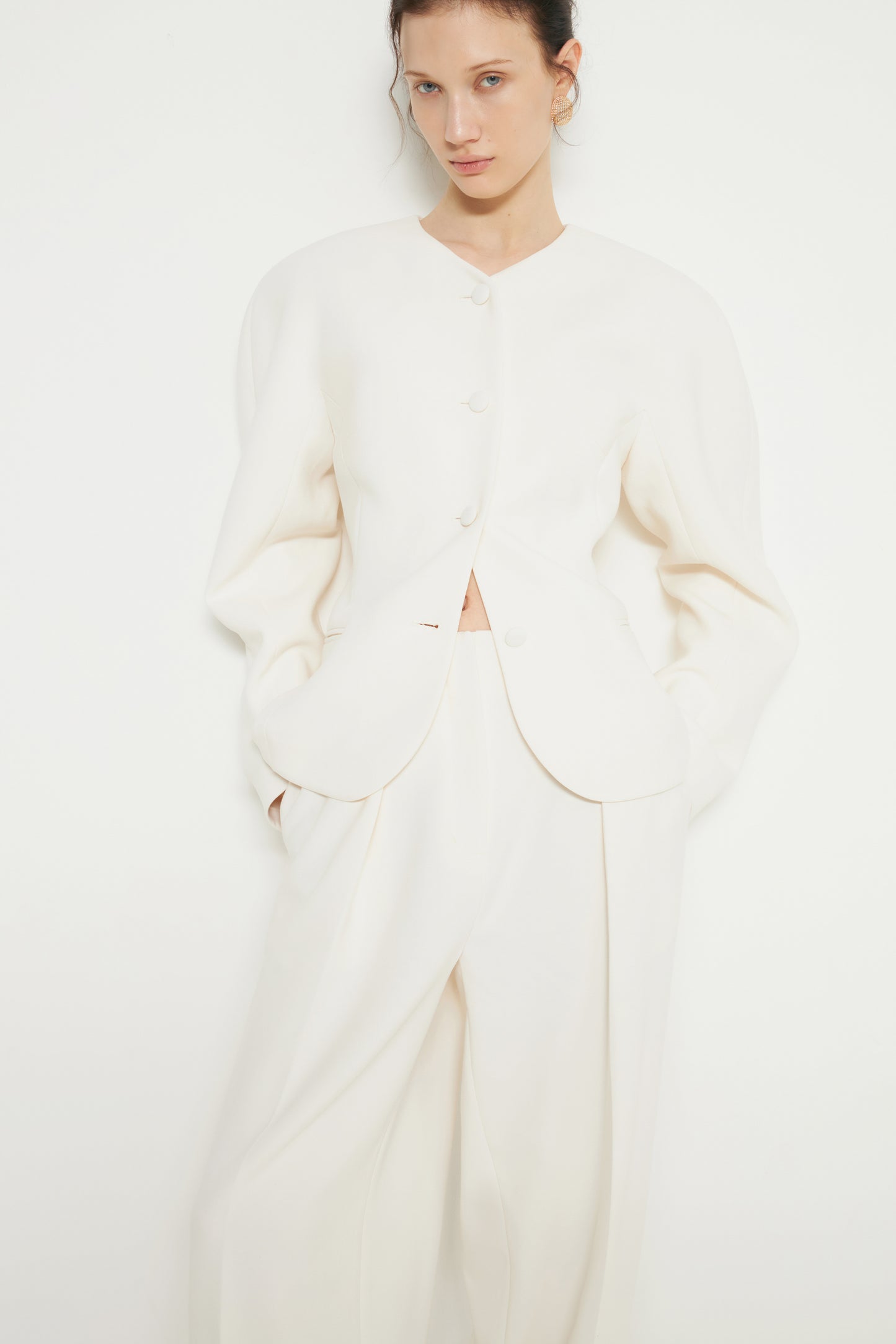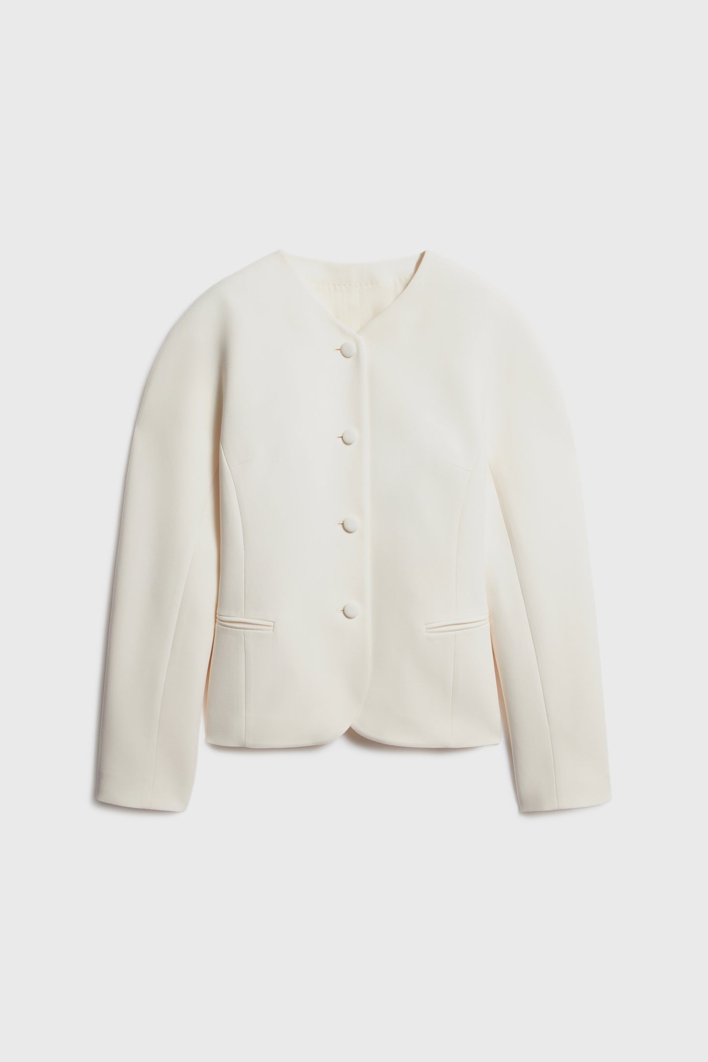Reimagines tailoring through exaggerated proportions. A slightly shorter blazer is designed with power shoulders and darts at the waist to create a slim-fit silhouette. Crafted from woven fabric it features a round neck, shoulder pads, long sleeves, and jetted front pockets. Lined. Single-breasted fastening with covered buttons.