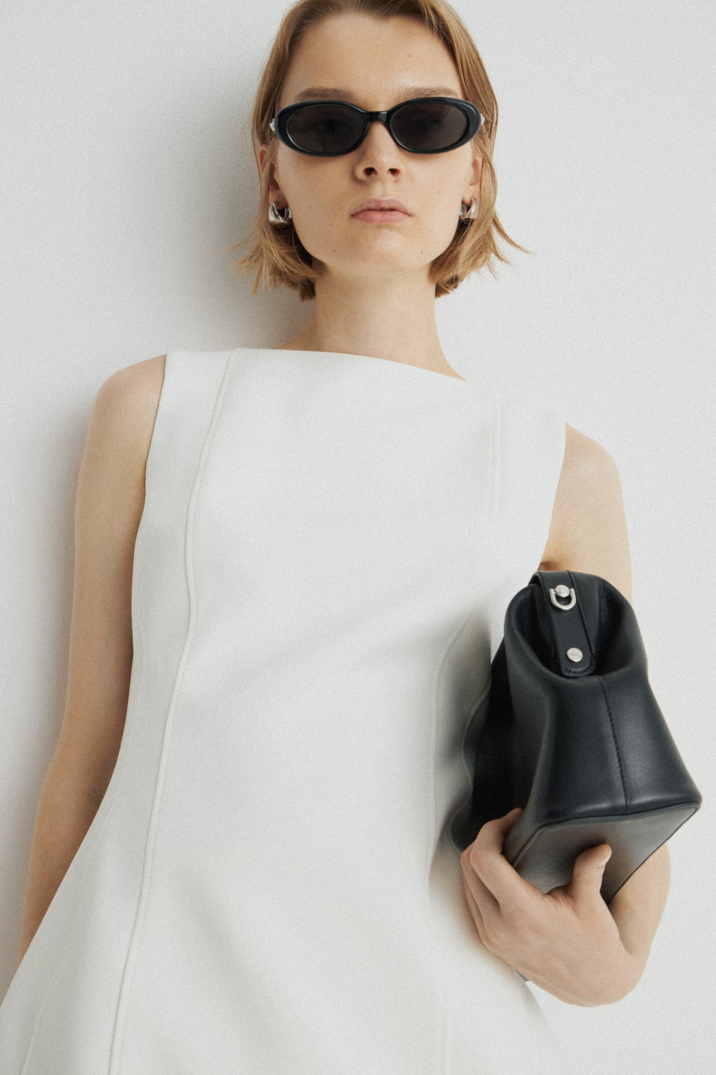 Long, fitted vest top in woven fabric with boat nechline. Shaping darts at the waist. Lined. A concealed zip at the back.