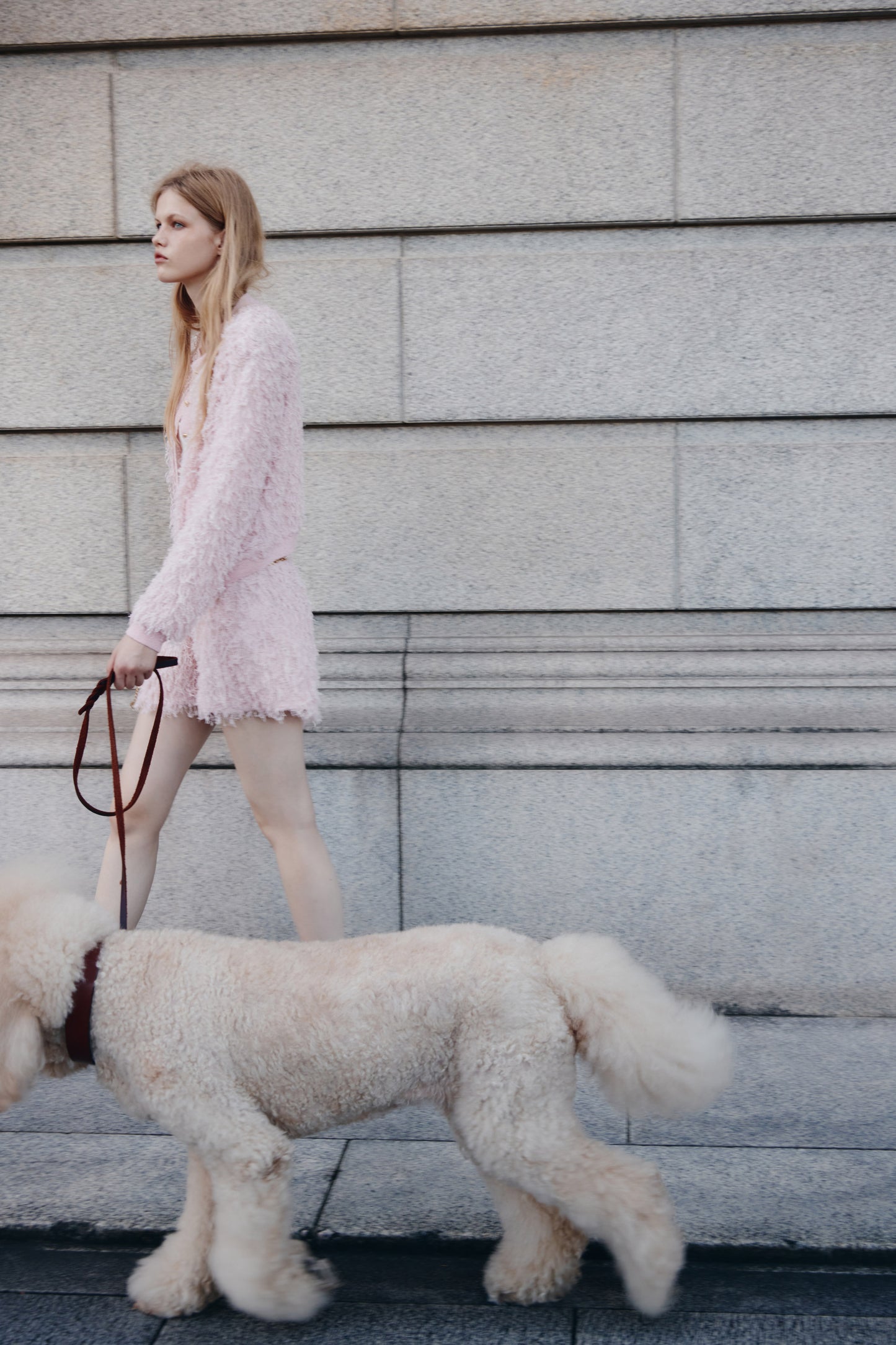 Sweatshirt in polyester fabric with fringe throughout the design. Round neck. Patch front pockets. Rib trims. Buttons at front.