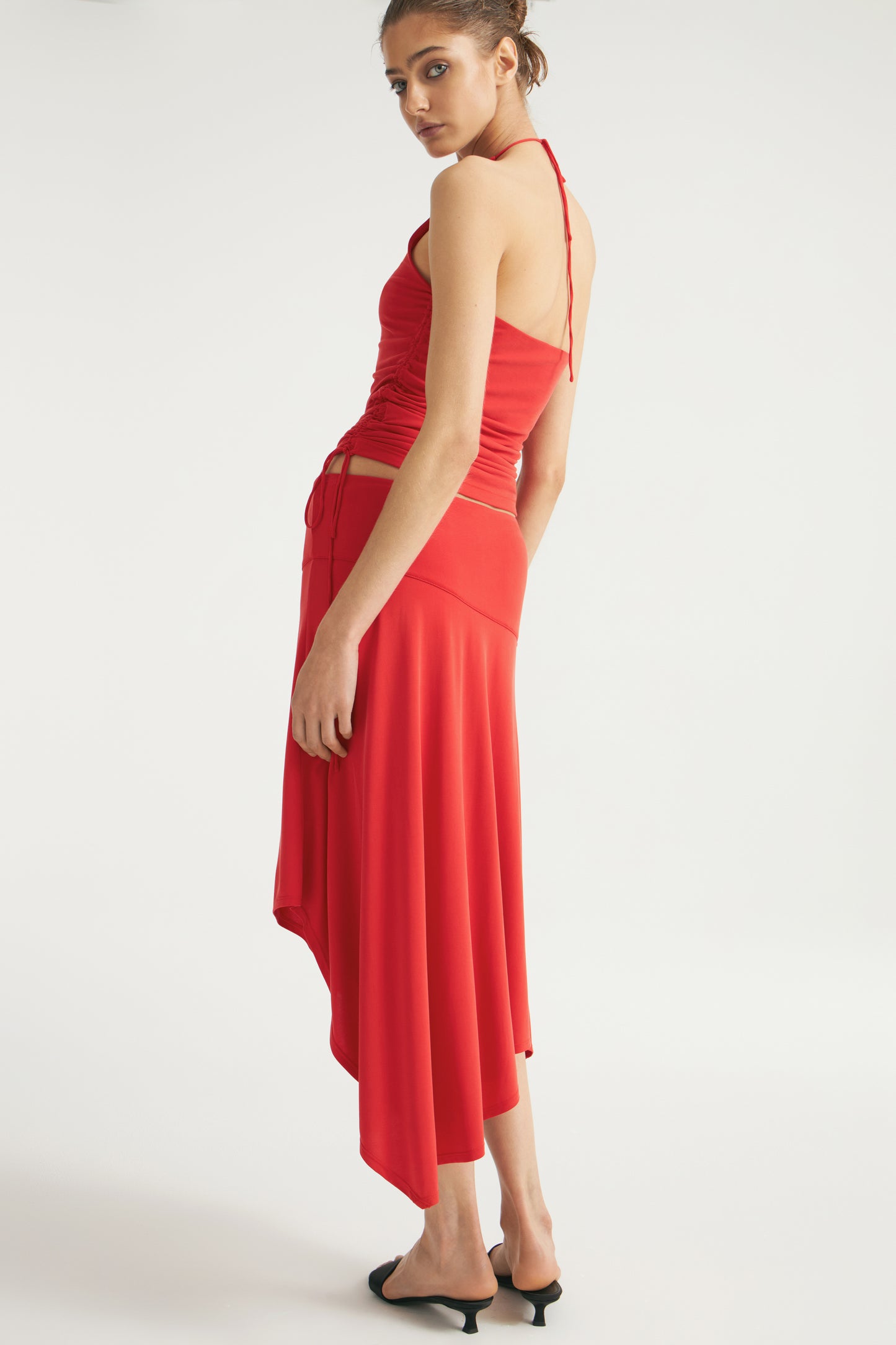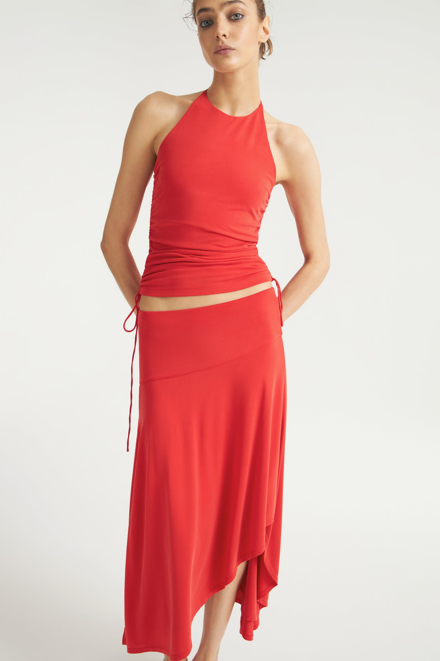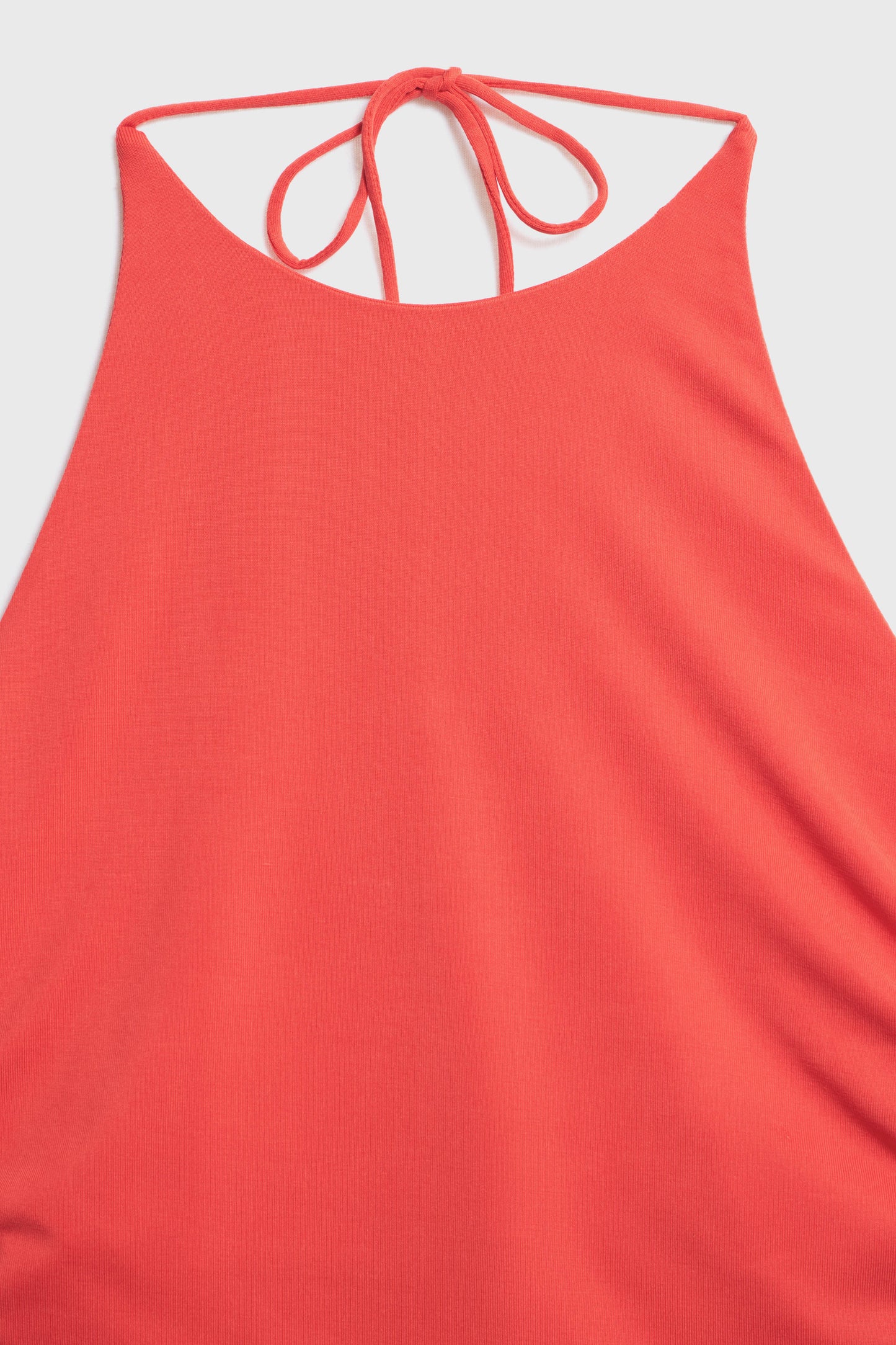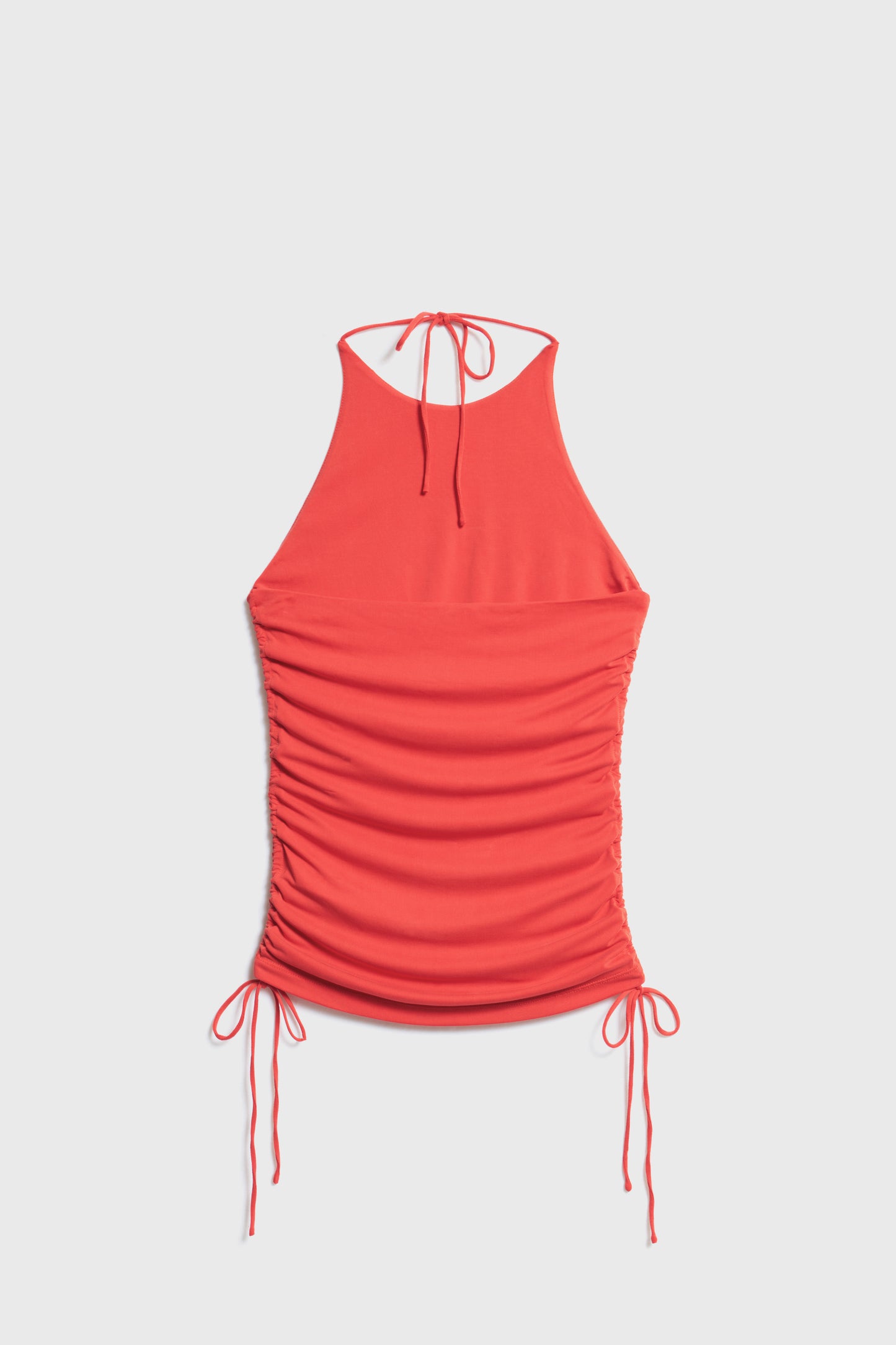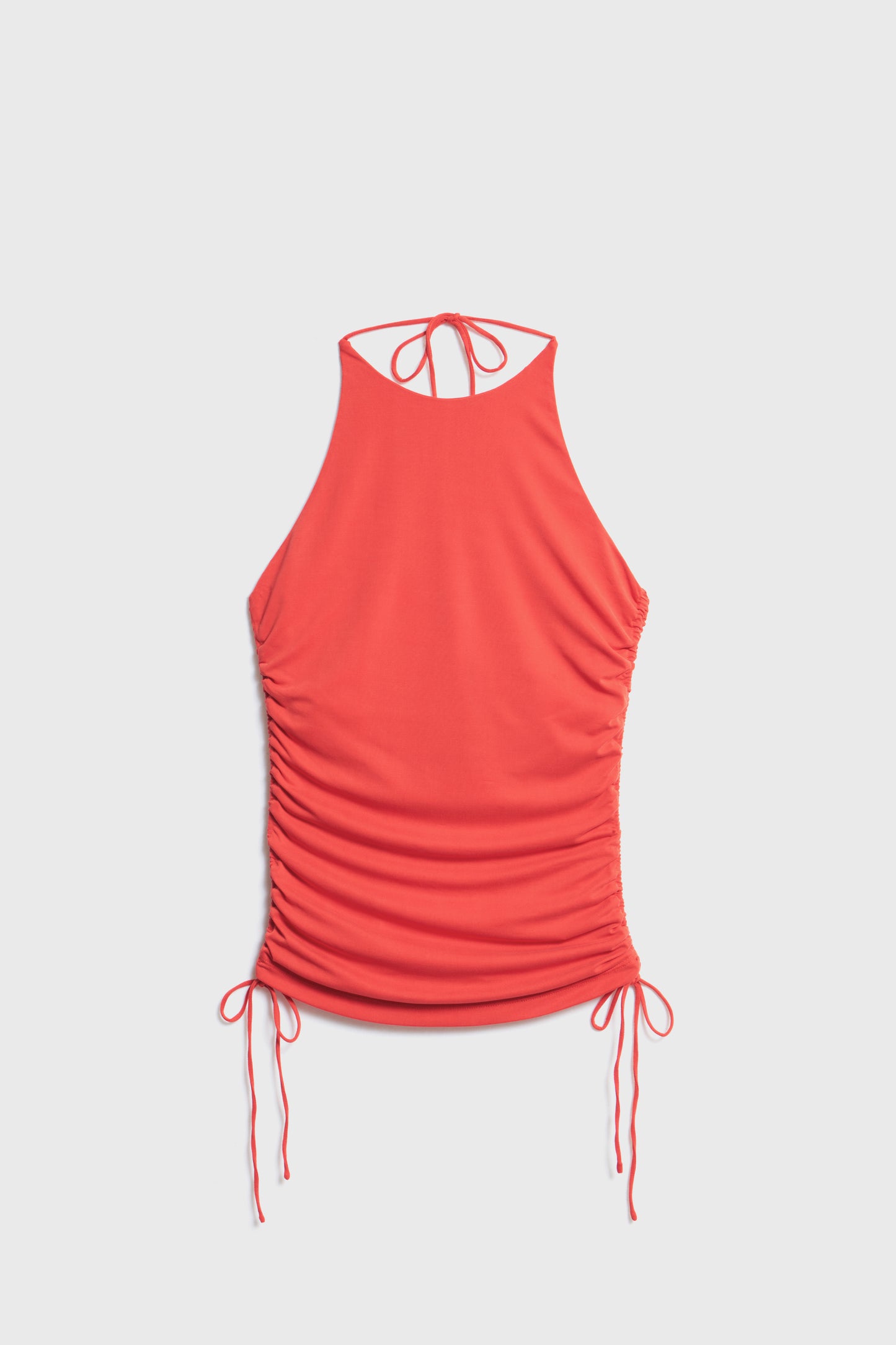 Fitted top in a viscose blend jersey with an open back and thin halterneck straps. Side ties for a draped look.