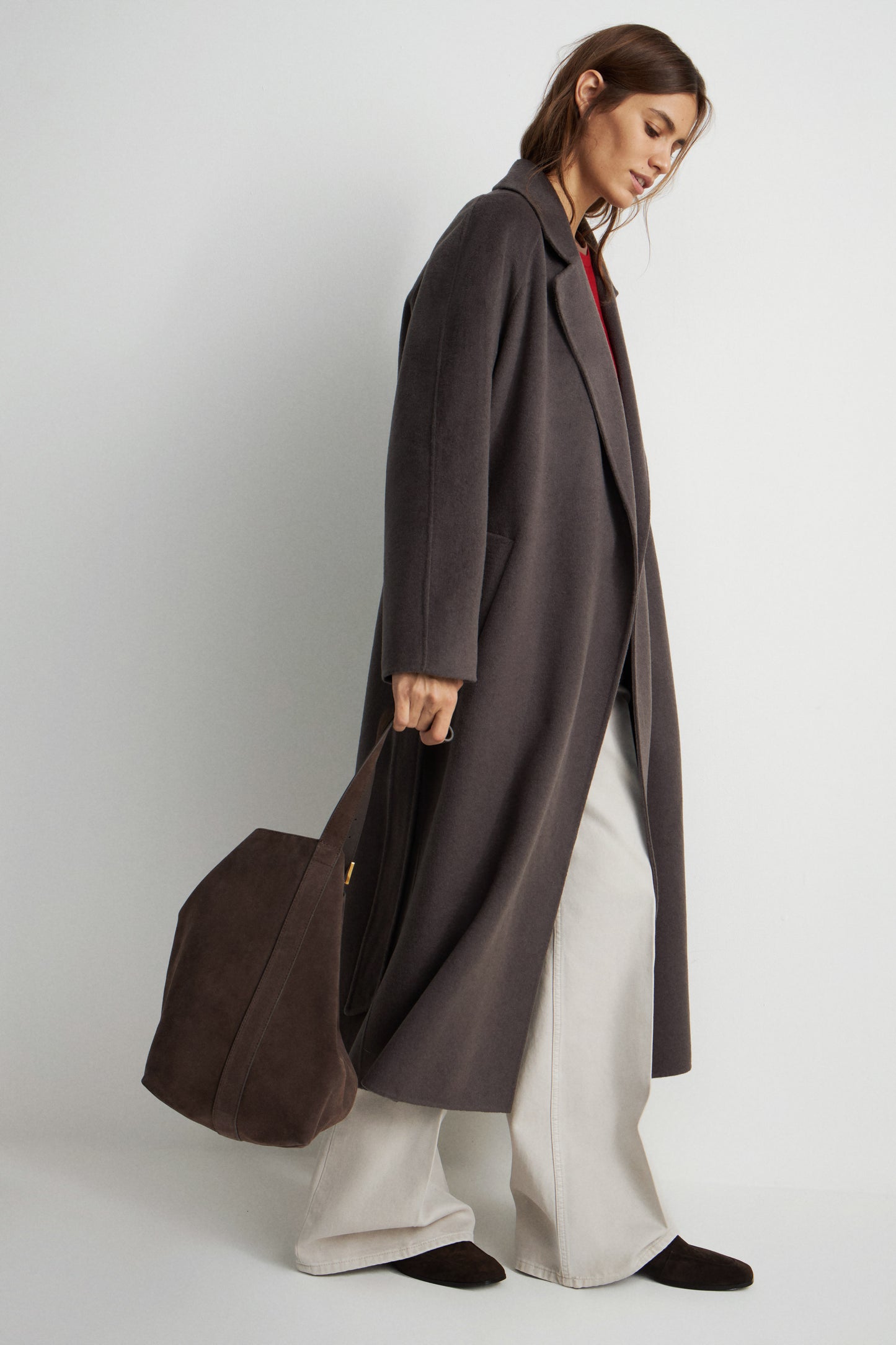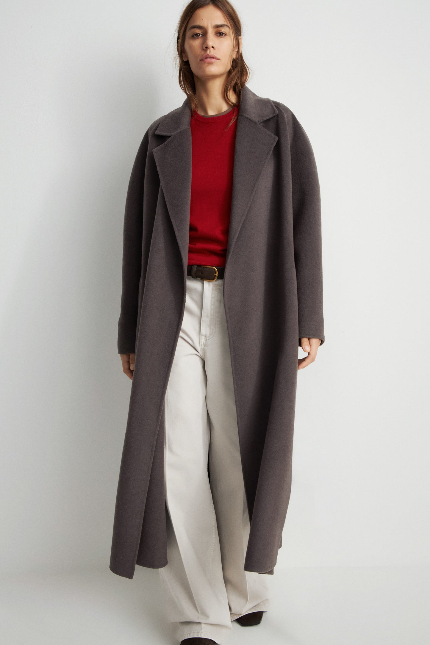 Ankle-length, single-breasted coat in a soft, felted wool blend. Pointed lapels, long raglan sleeves, wrapover front with a removable tie belt. Discreet side-seam pockets. Hand made.