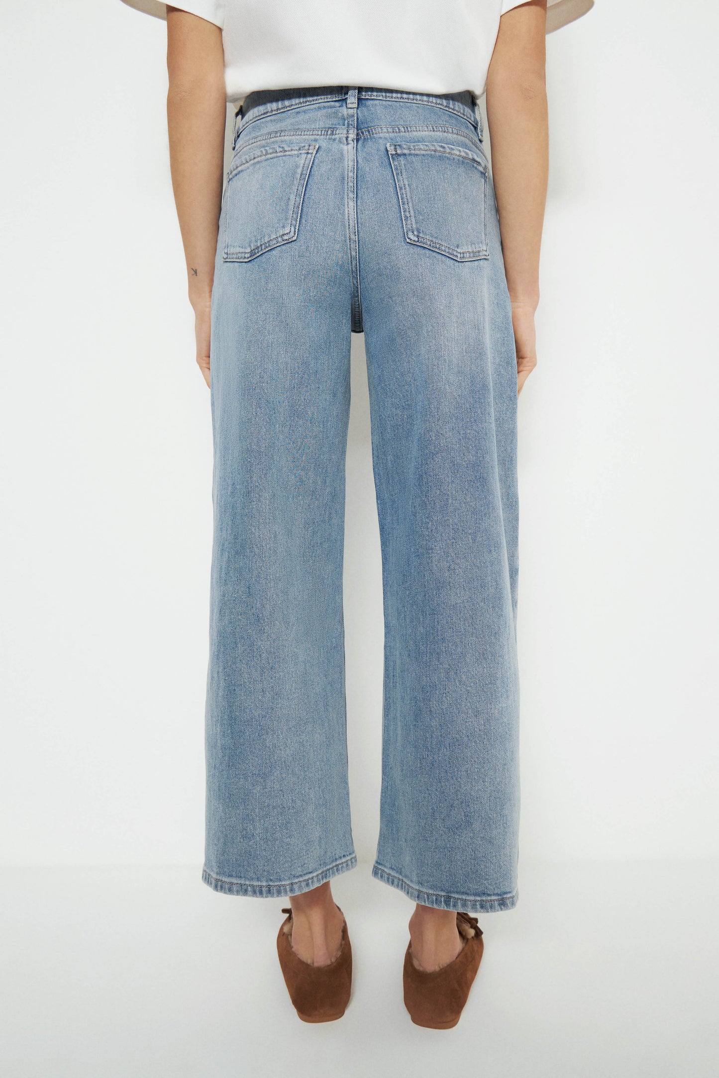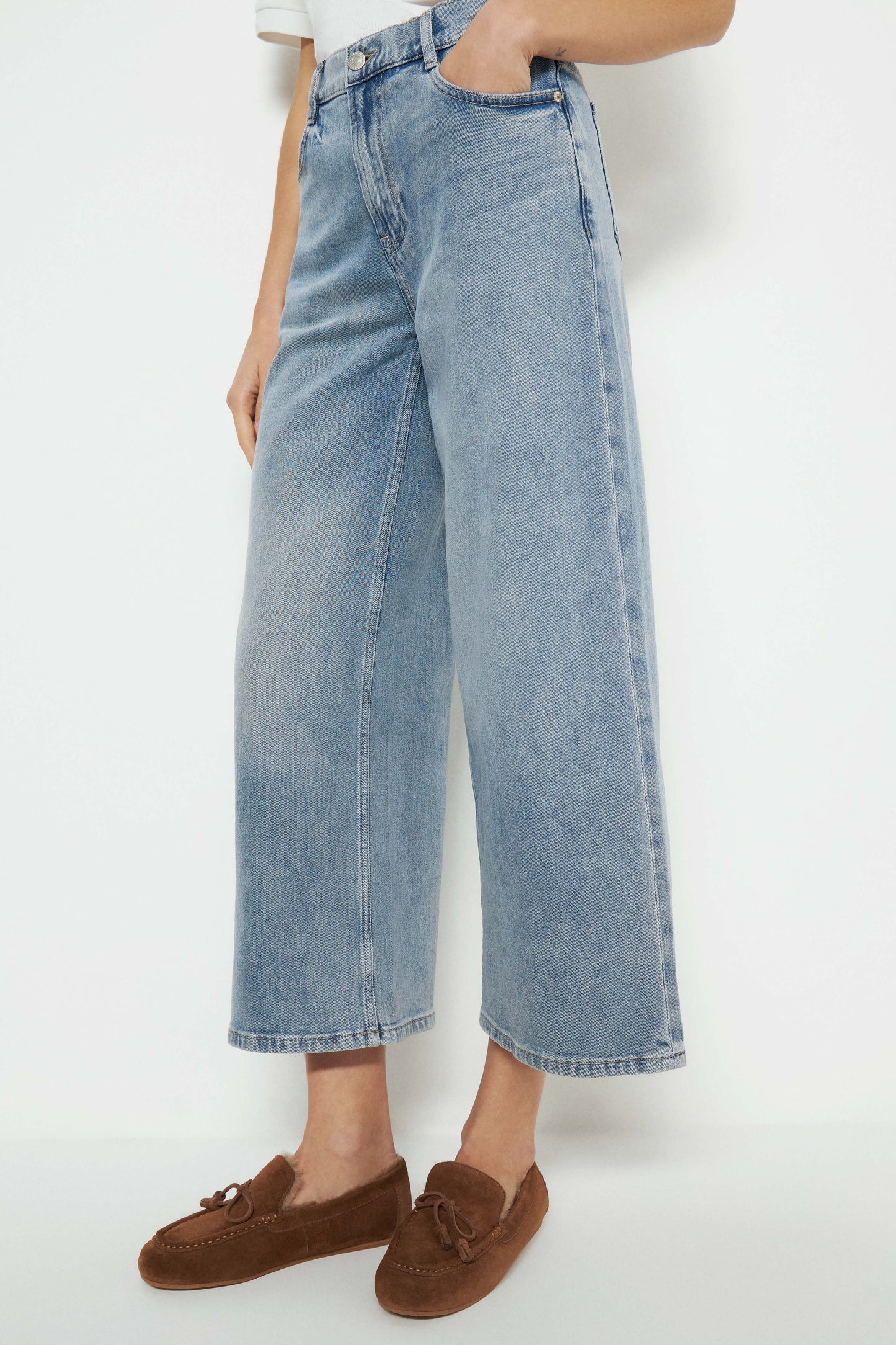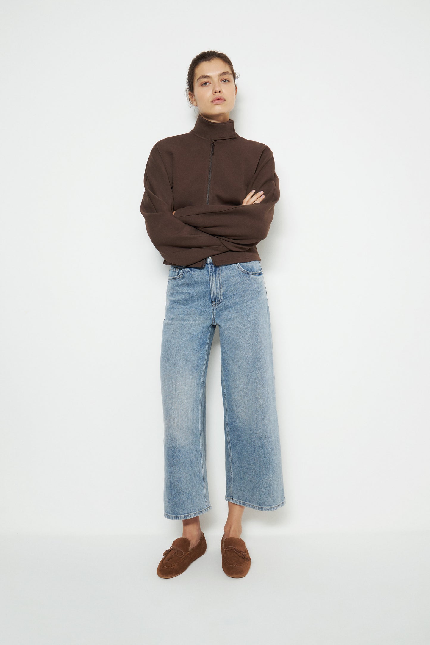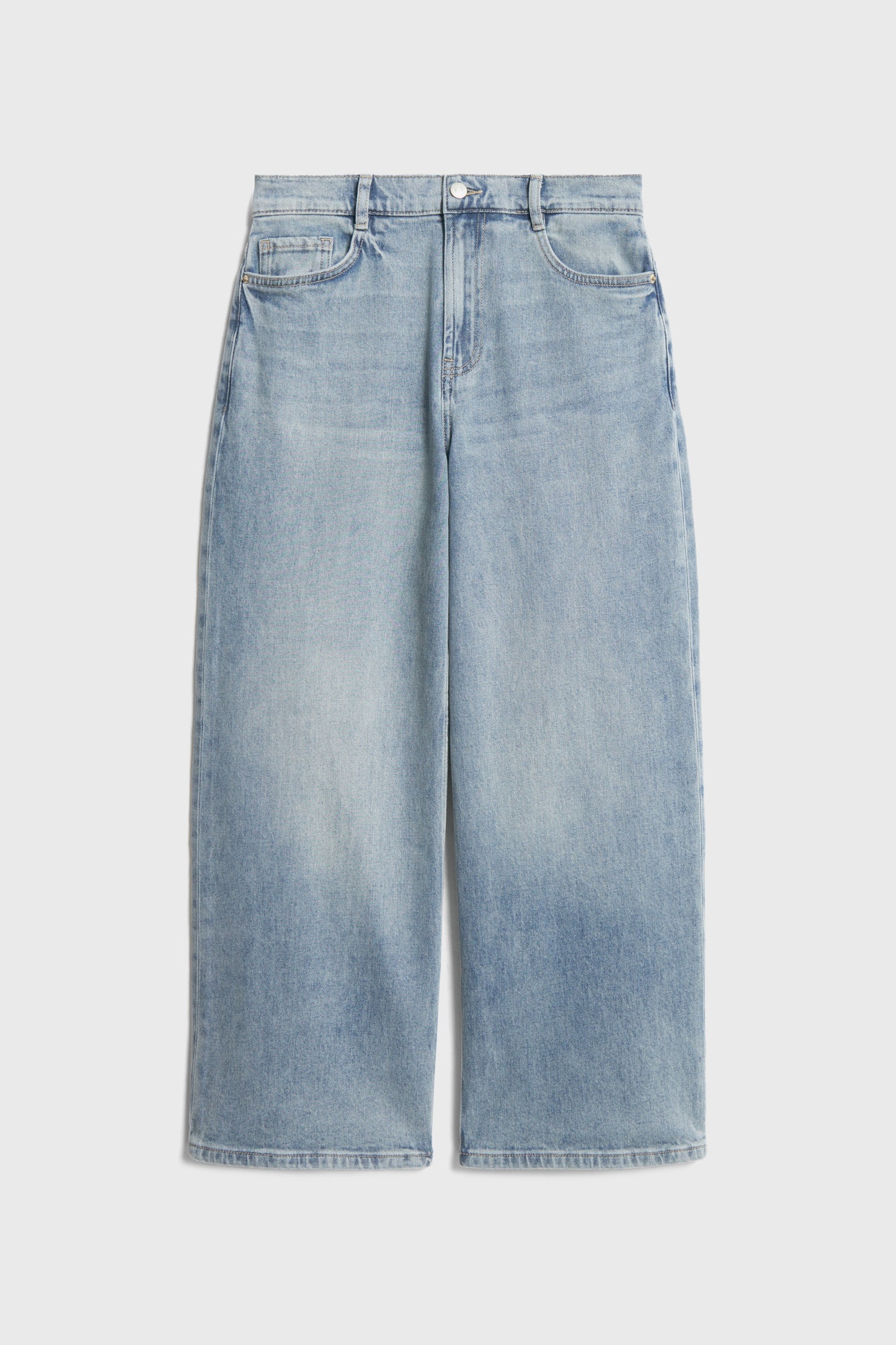High-waist jeans with five pockets. Wide-leg design. Faded effect. Ripped detailing. Front zip fly and top button fastening.