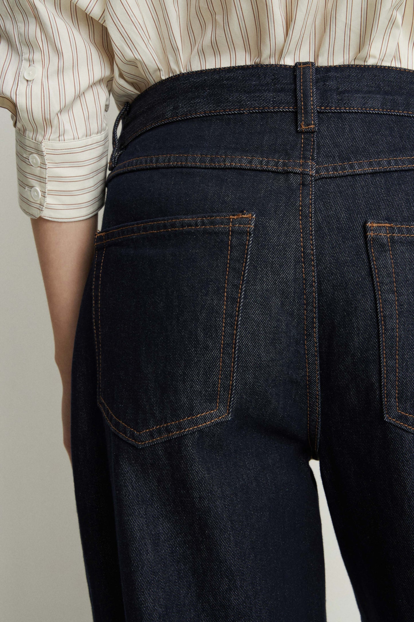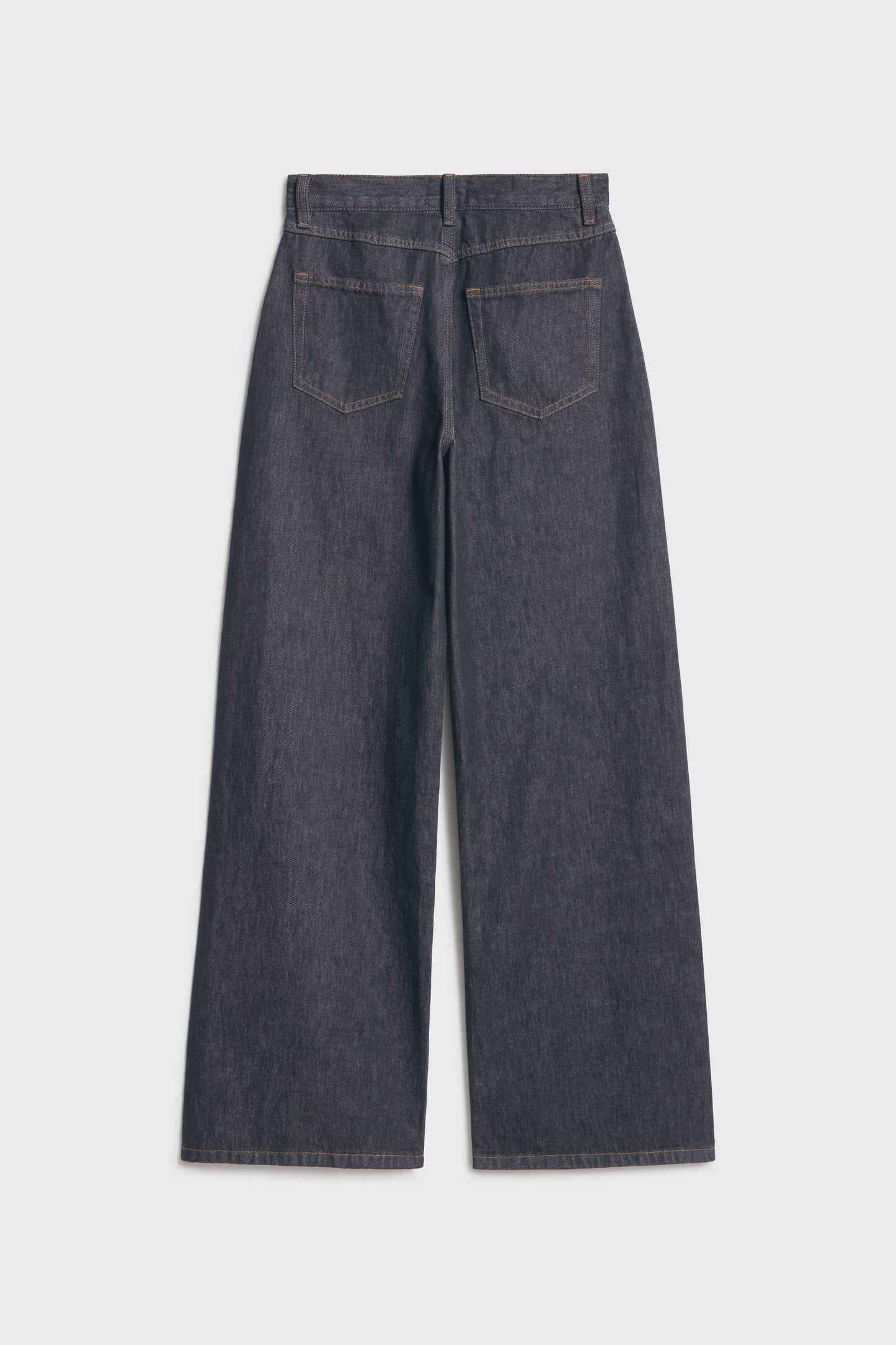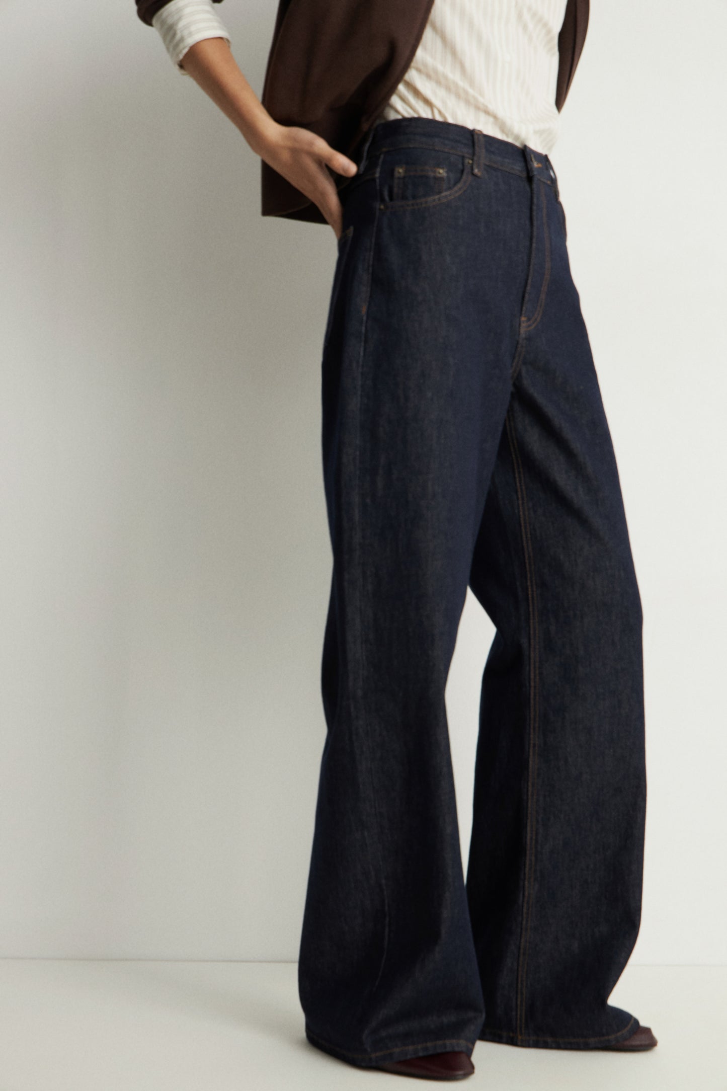 High-waist jeans with a five-pockets. Wide-leg design. Each bordered with tobacco-brown topstitching. Front zip fly and top button fastening.