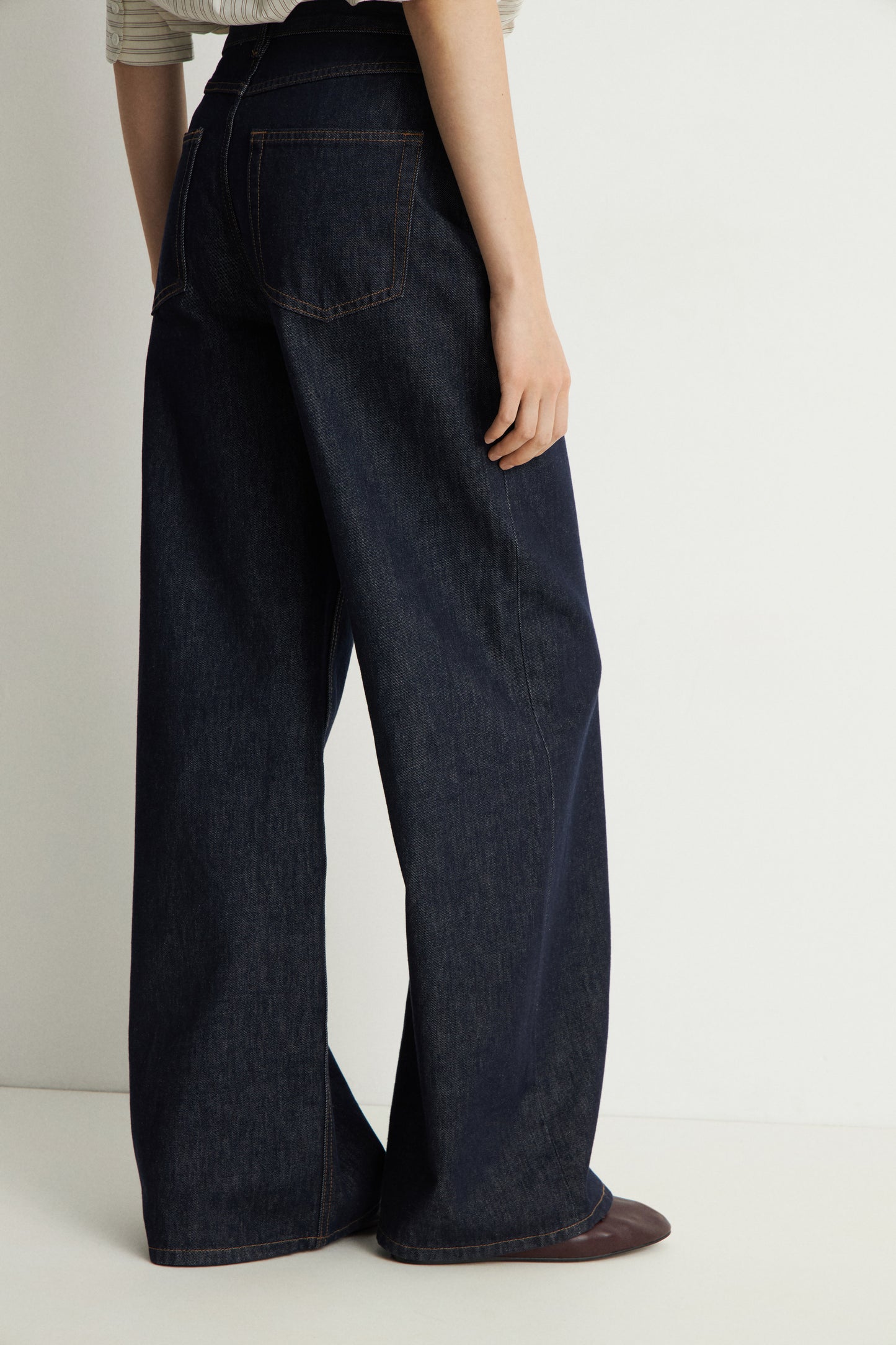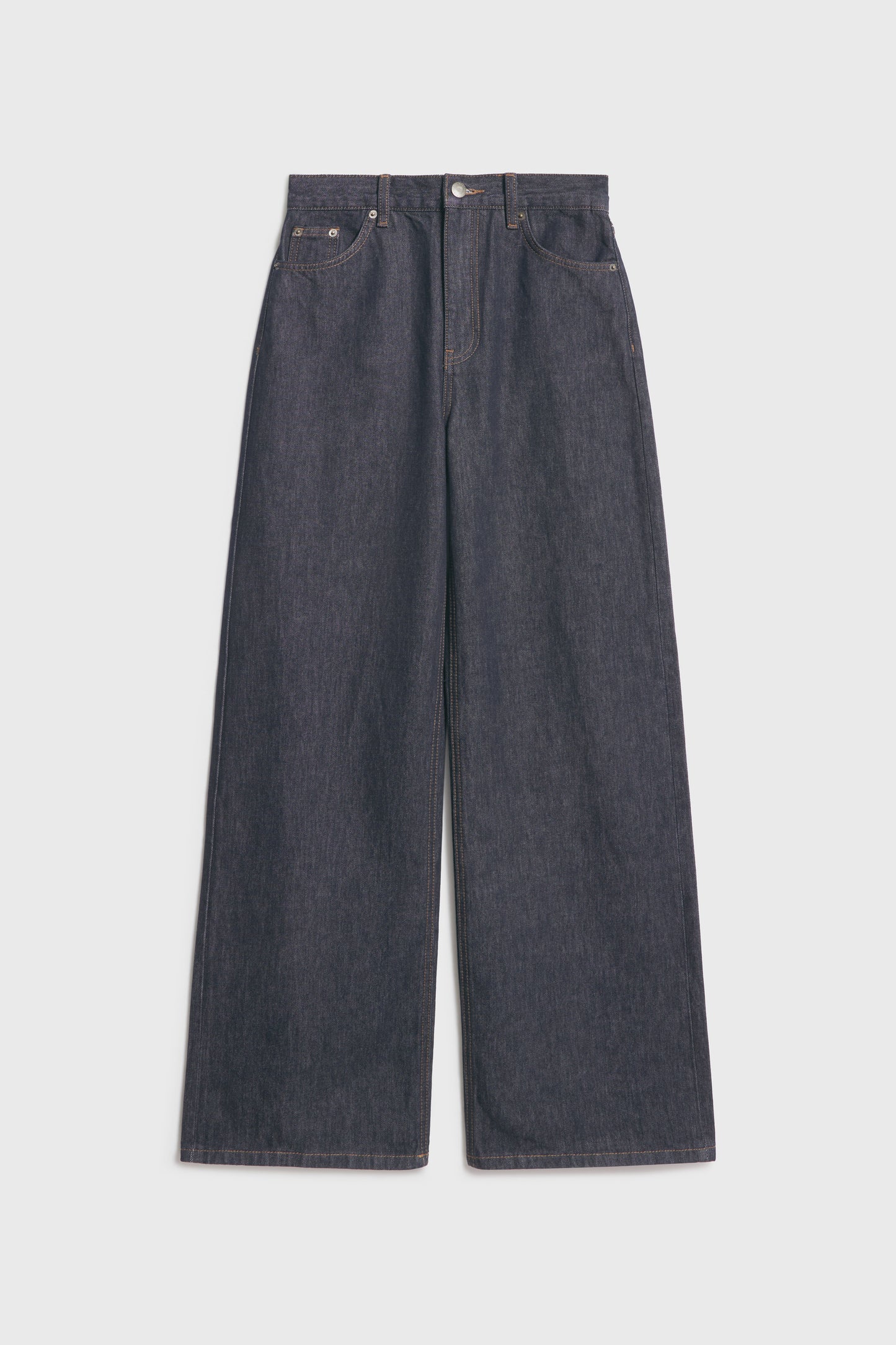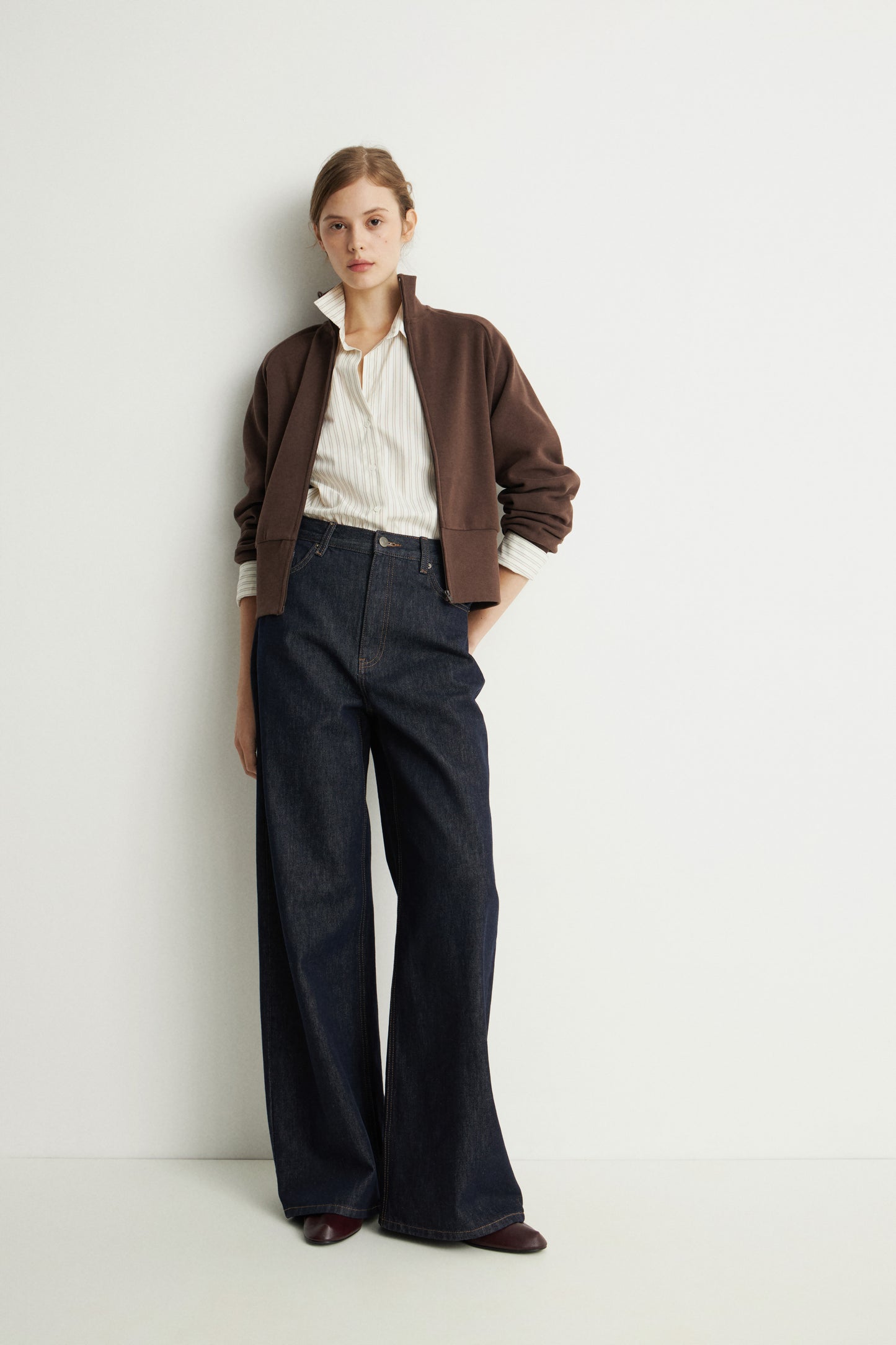 High-waist jeans with a five-pockets. Wide-leg design. Each bordered with tobacco-brown topstitching. Front zip fly and top button fastening.