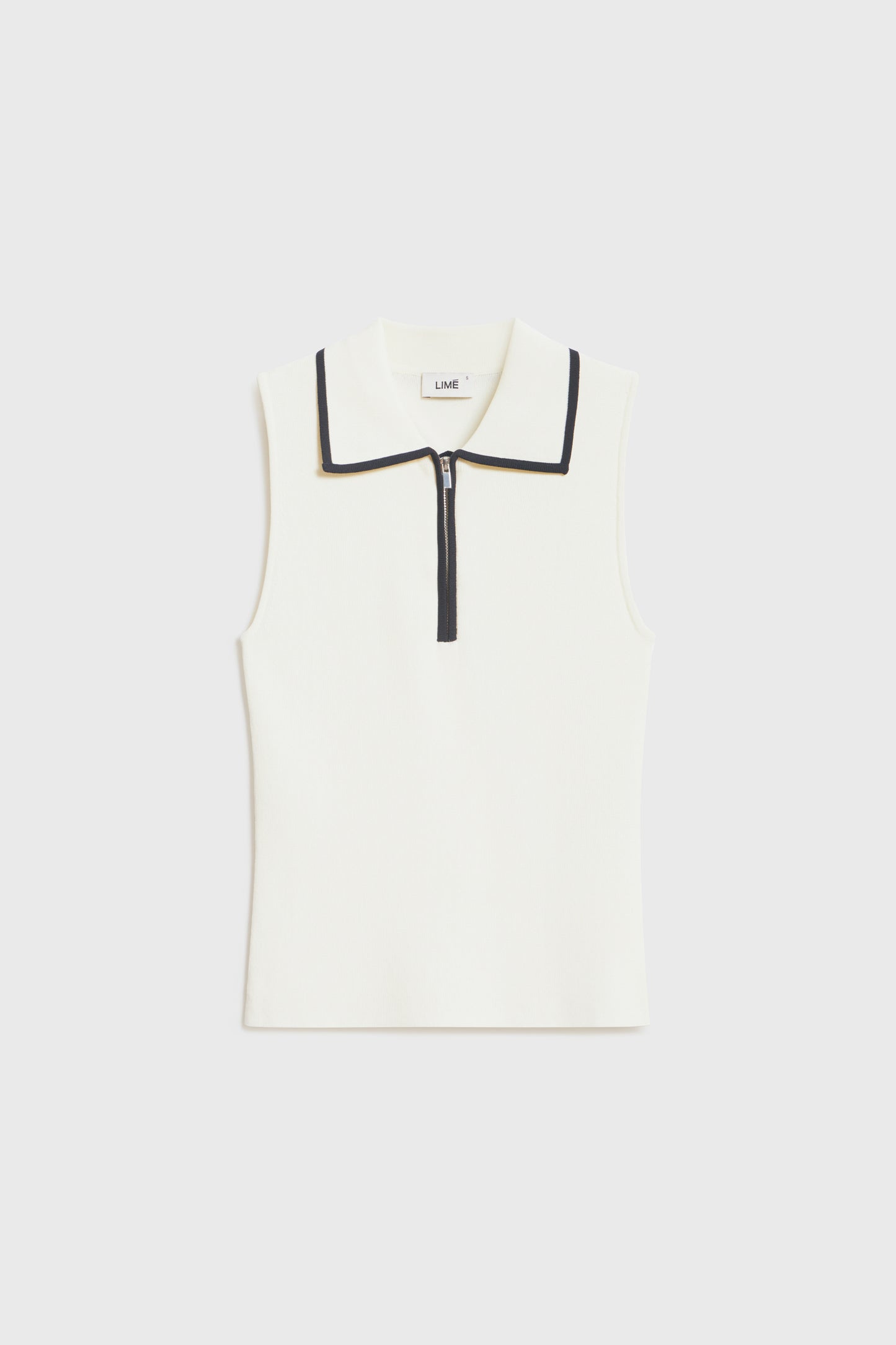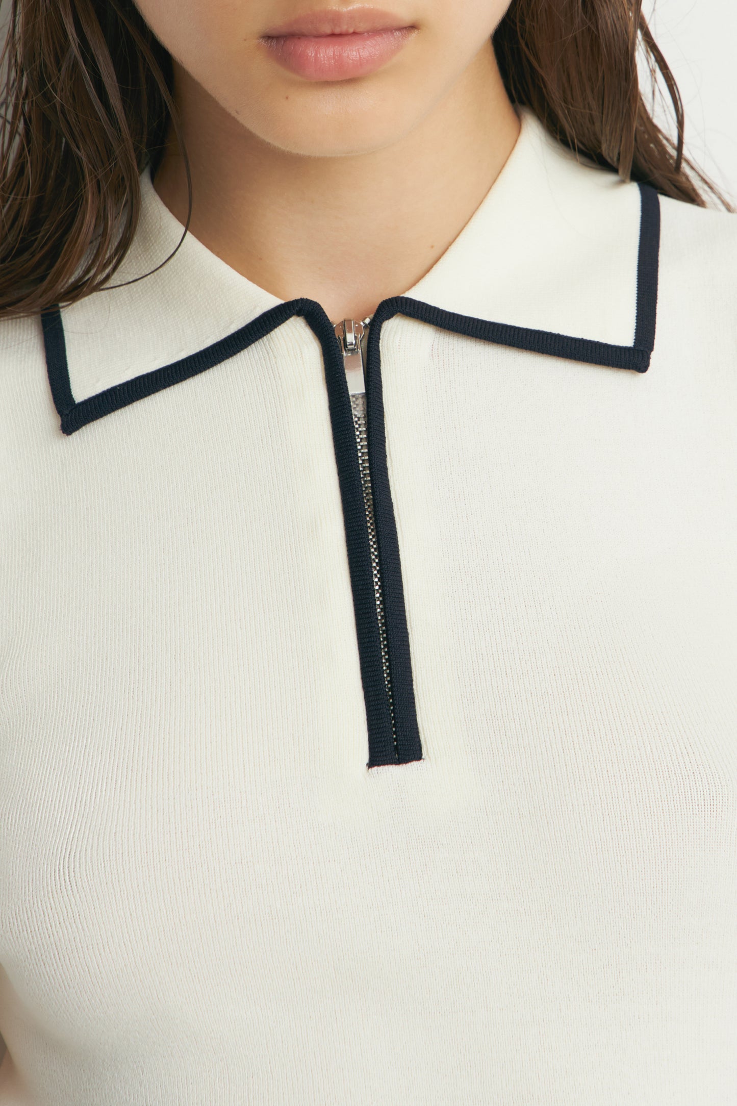 Slim-fit polo top in fine-knit viscose blend that hugs contours of the body for a fitted silhouette. Collar, half-zip, and contrasting trim.