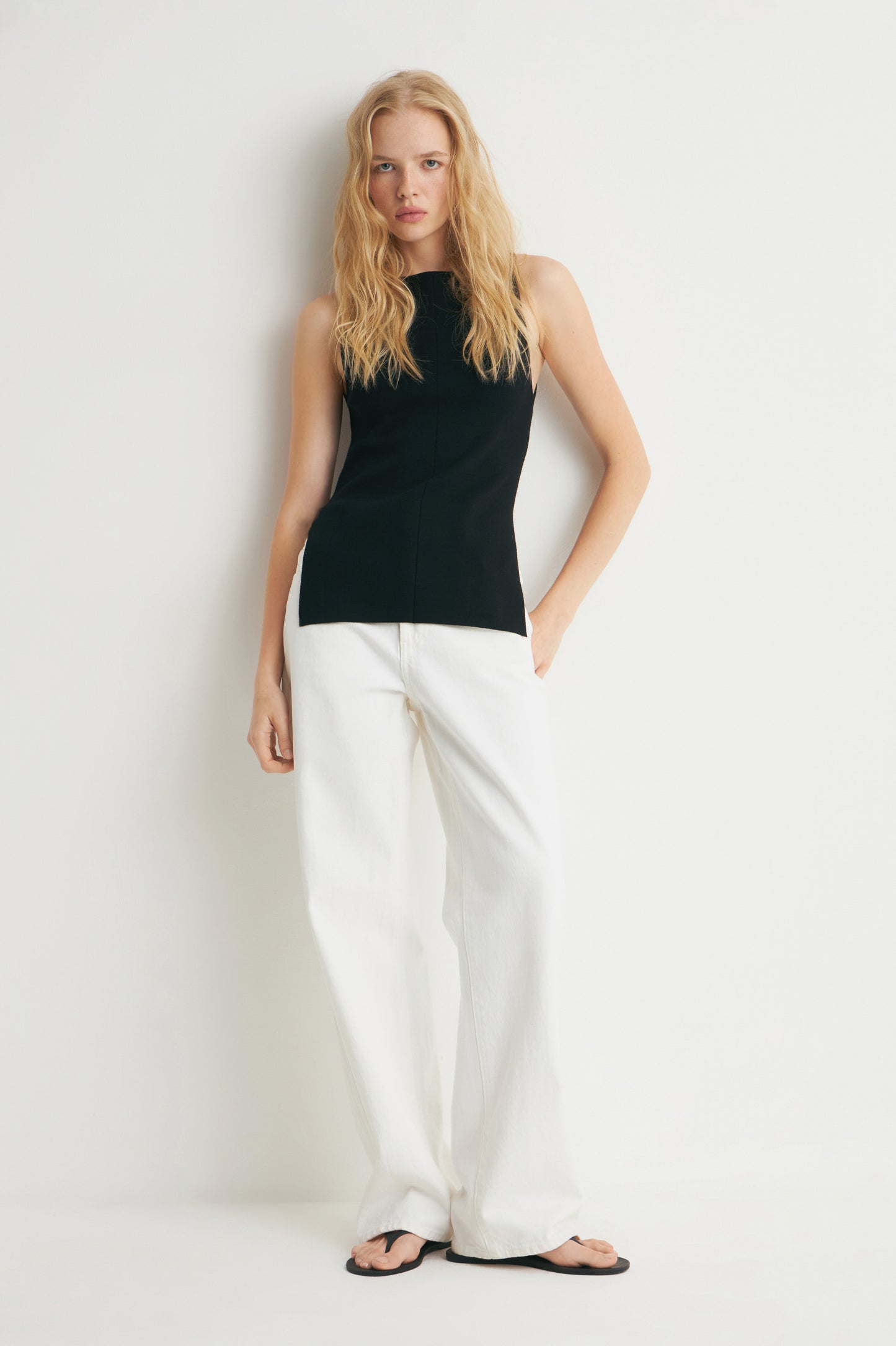 Fitted top in fine rib knit made of viscose blend. Delicate boat neckline with a narrow trim and a straight hem with slits.