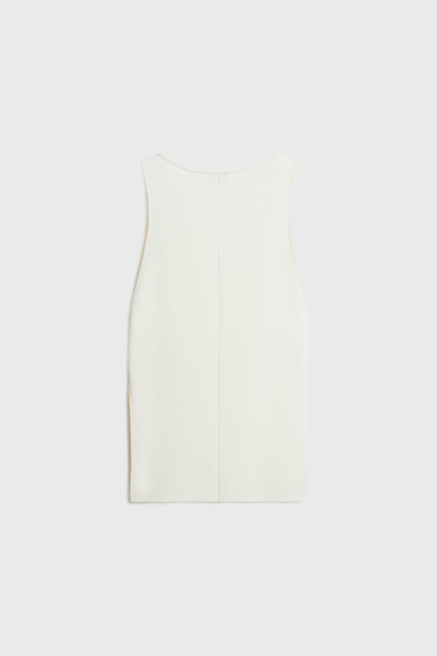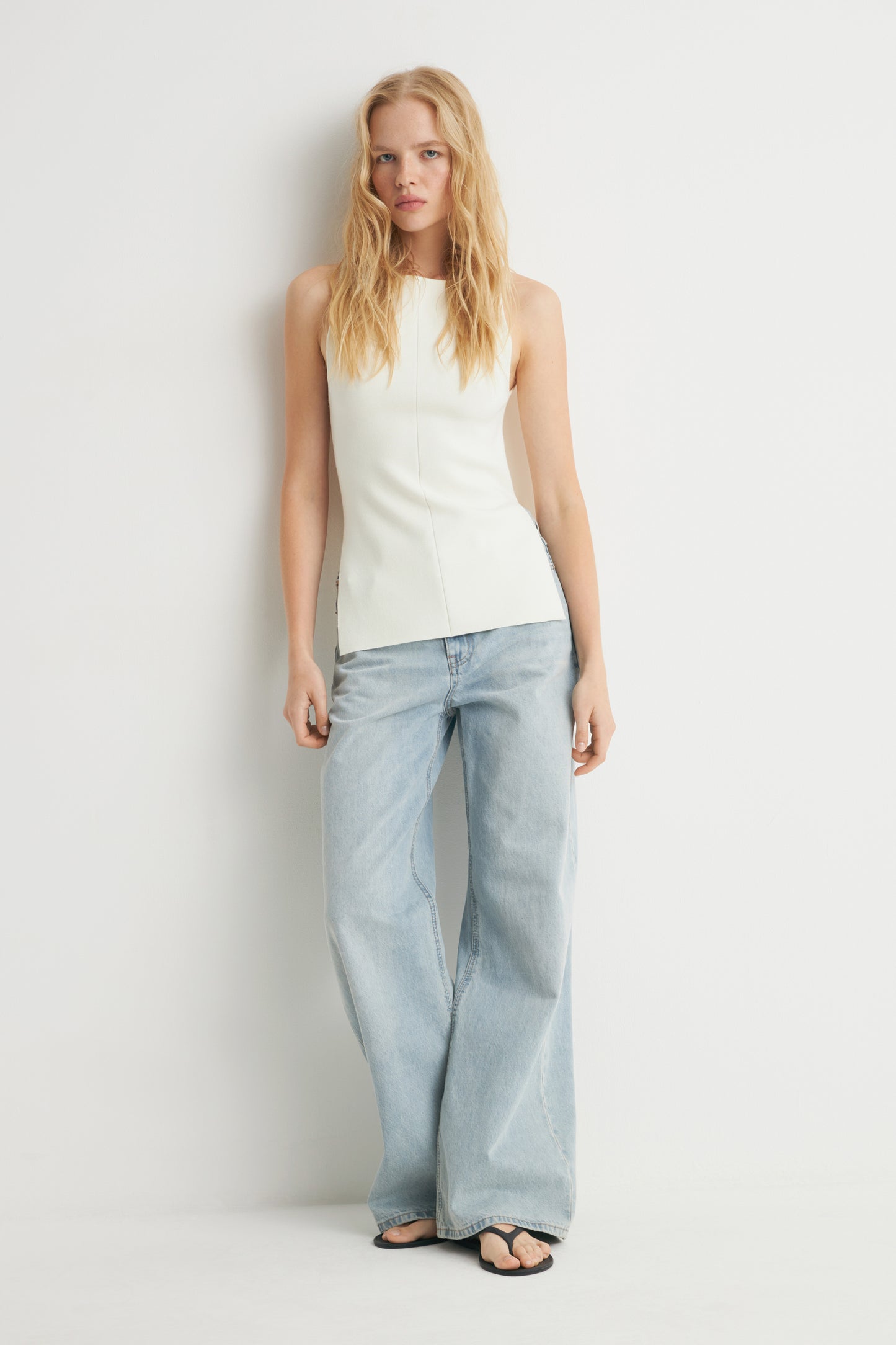 Fitted top in fine rib knit made of viscose blend. Delicate boat neckline with a narrow trim and a straight hem with slits.