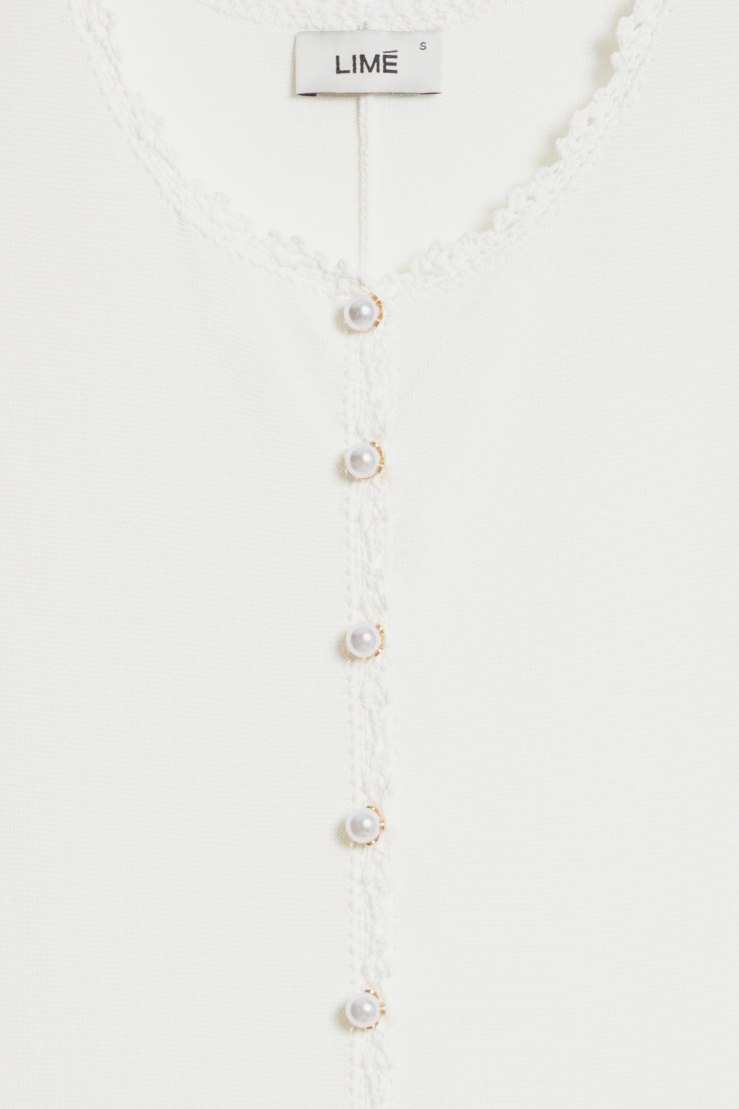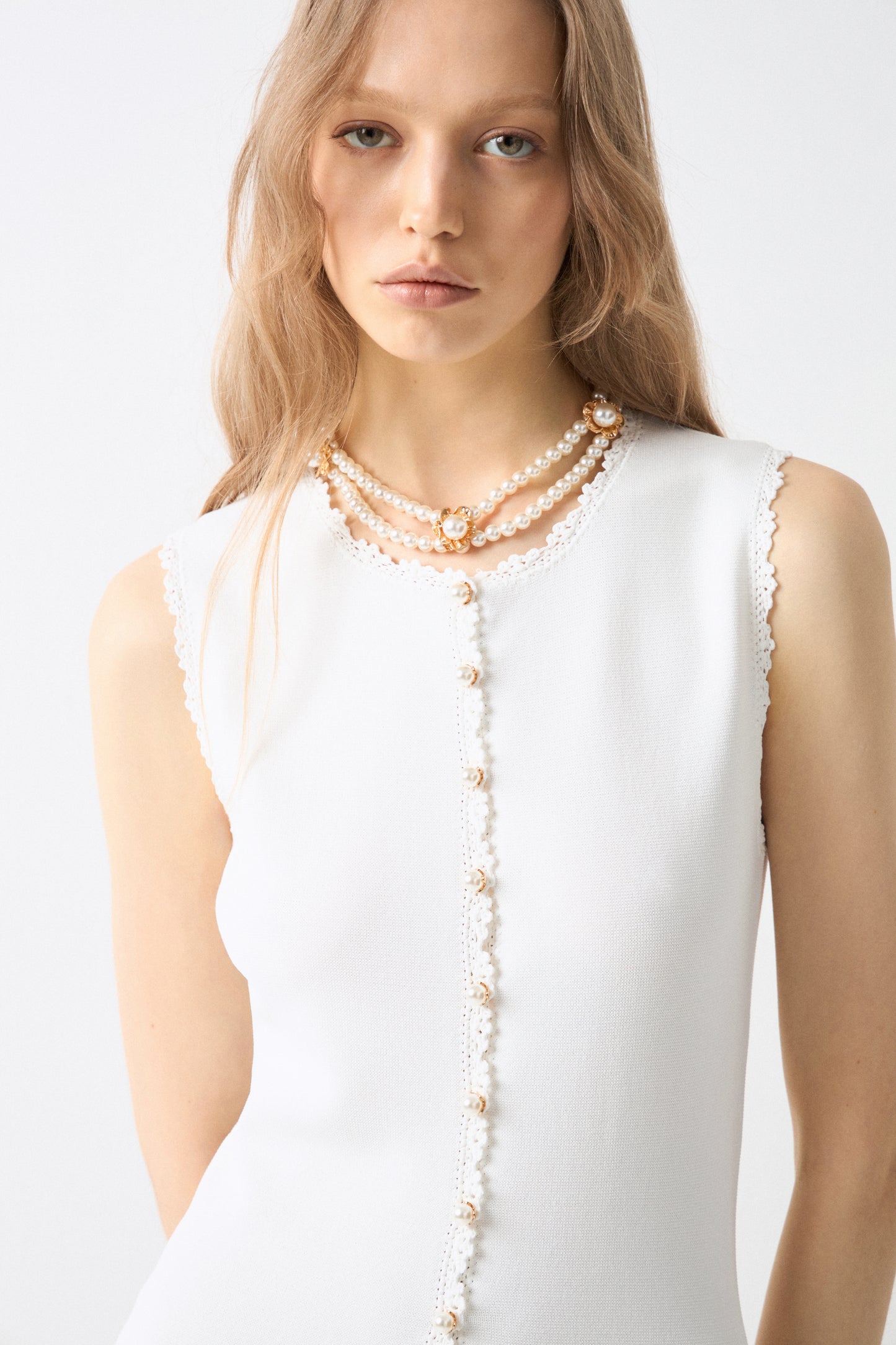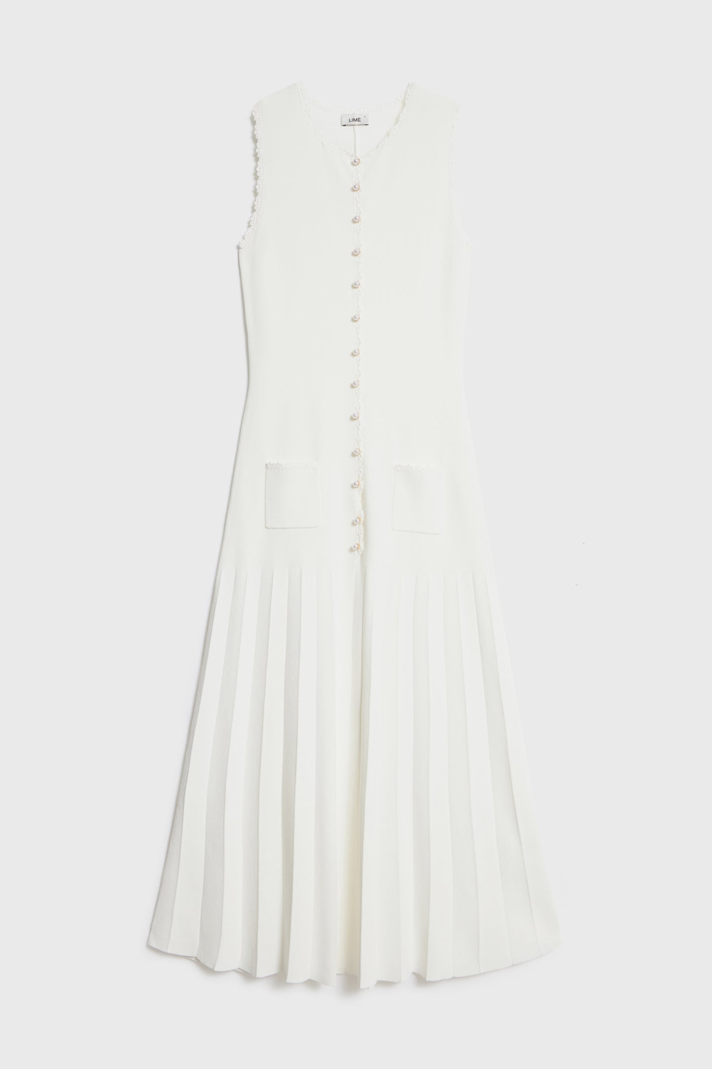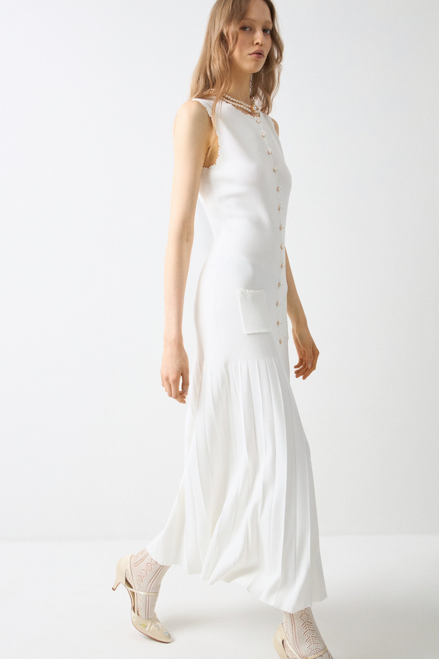 The calf-length dress in soft viscose blend knit is perfect for elegant, contemporary looks. Pearly button closure, round neck, patch pockets and fitted bodice. Crochet-look trims. Flared skirt with pleats along the hem.