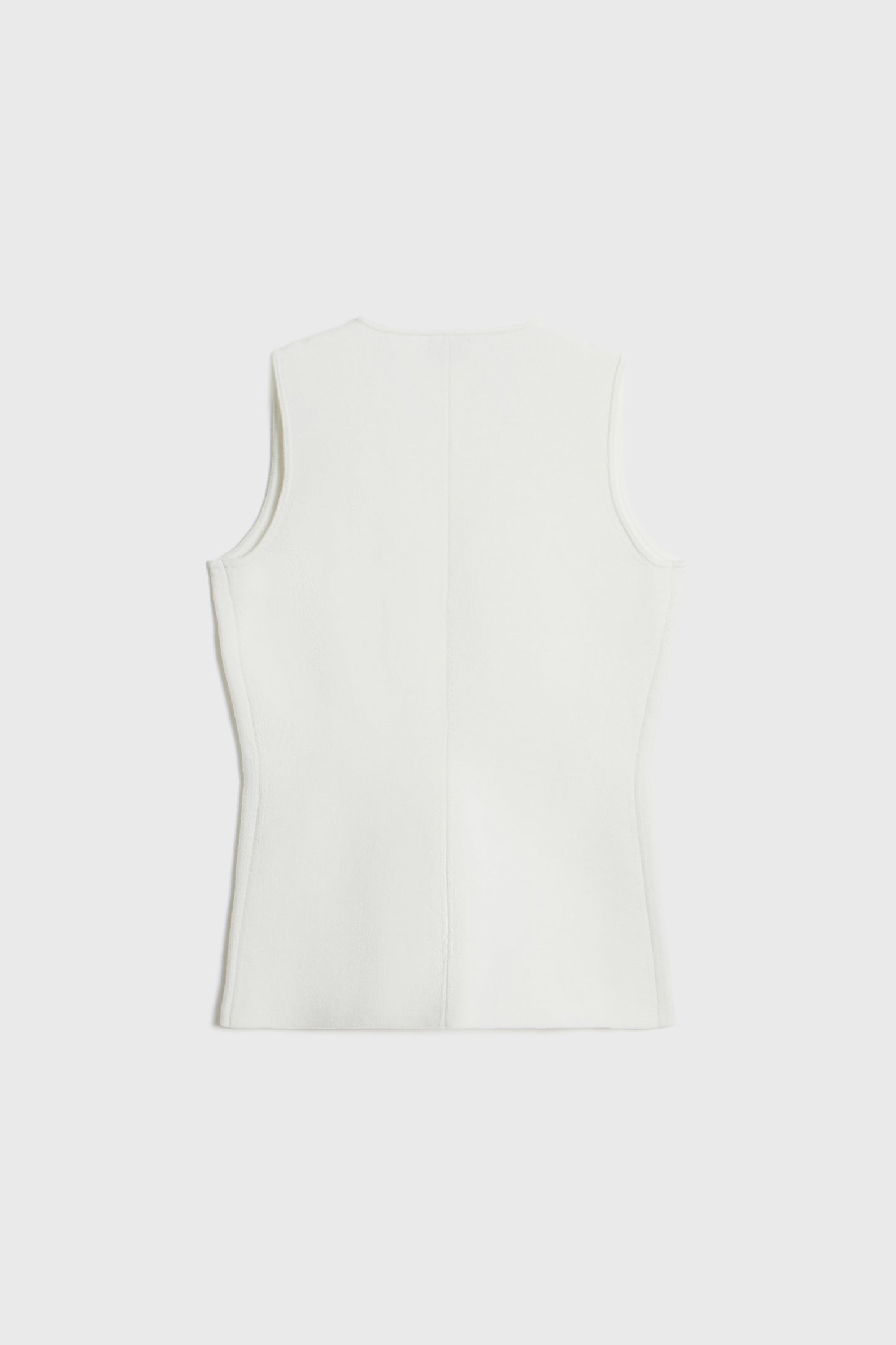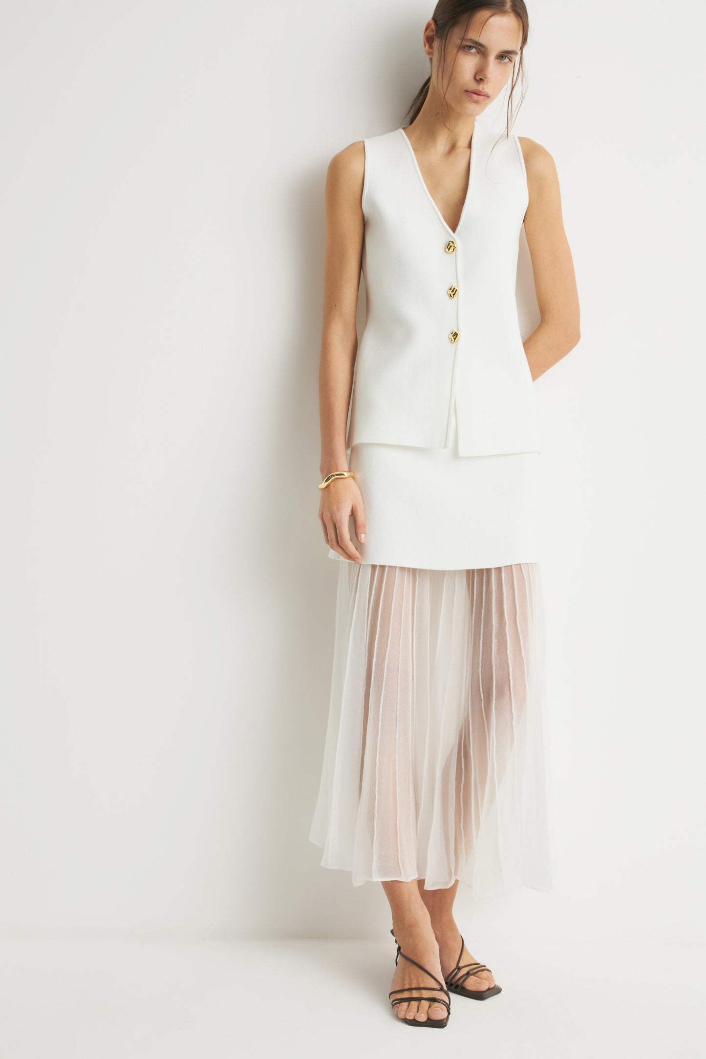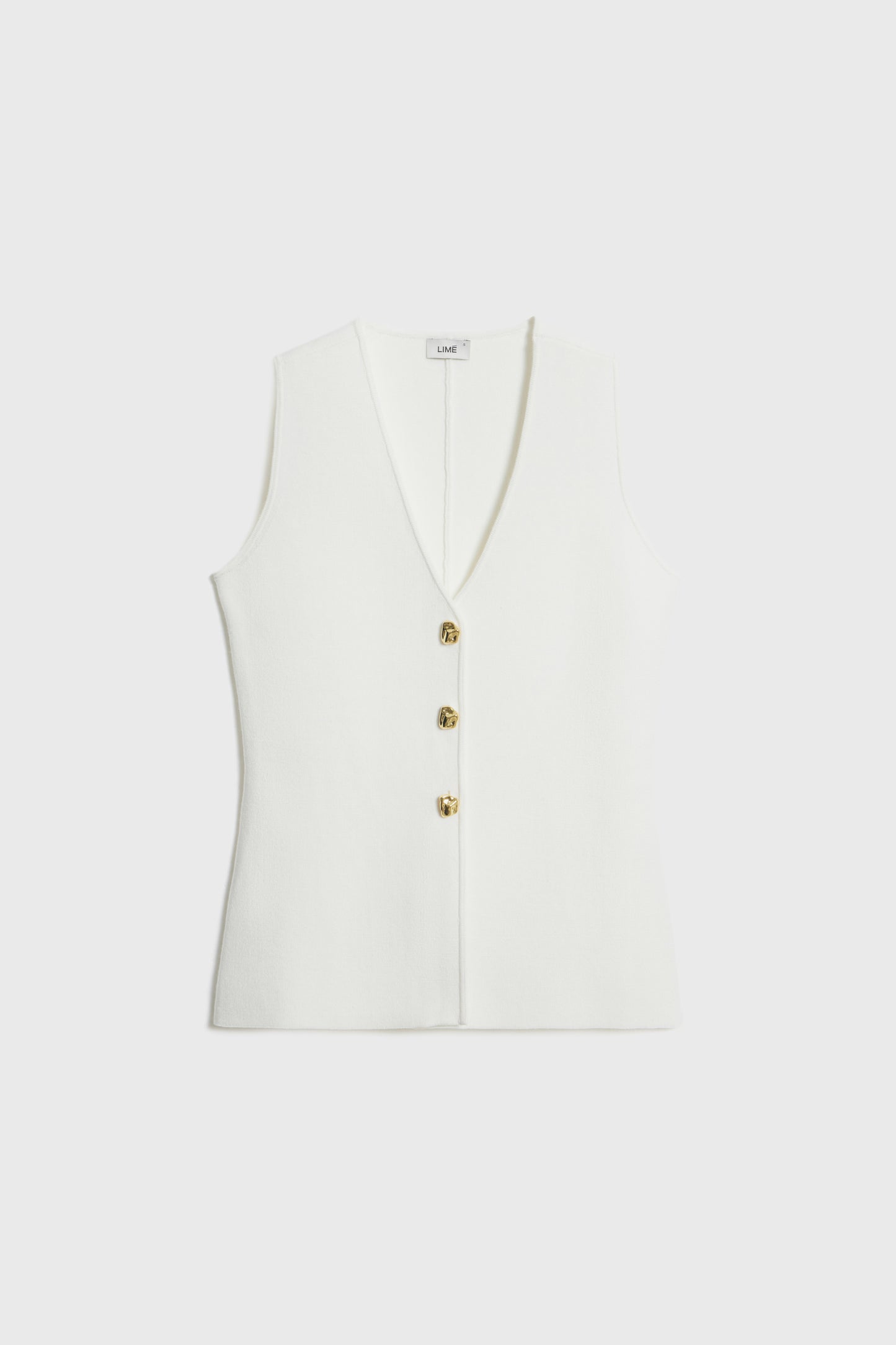 Slightly longer vest top in a soft knit made from a viscose with a V-shaped neckline and irregular metal buttons down the front. Slim fit.