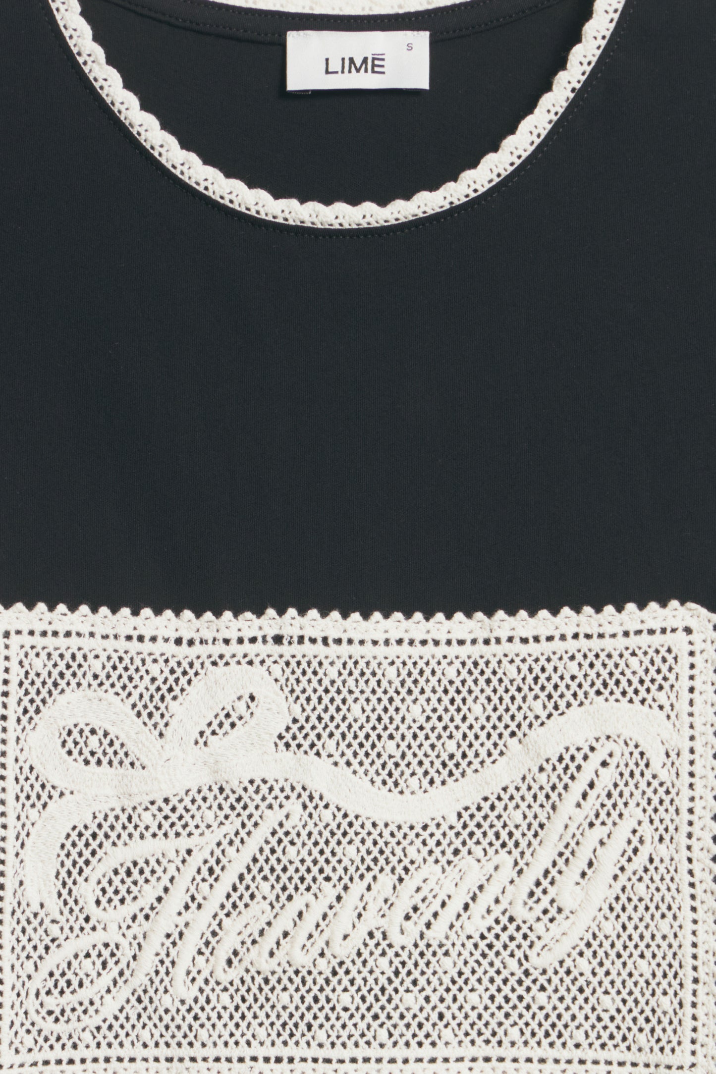 Fitted T-shirt in soft cotton jersey with a round neck and short sleeves. Featuring a contrast lace detail on the front.