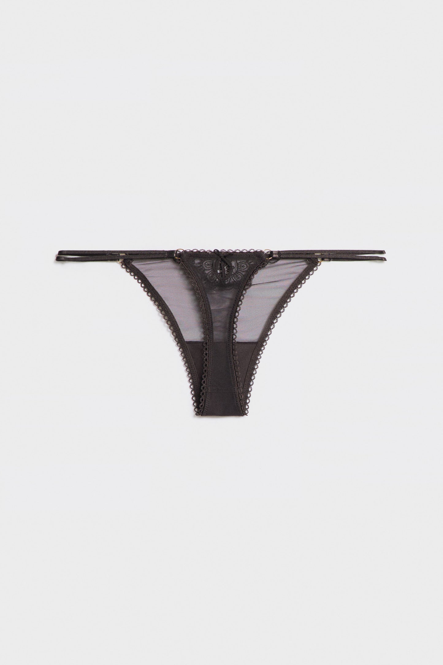 Mesh thong with elastic waistband. Matching lace detail and contrasting bow appliqué. 100% cotton gusset.