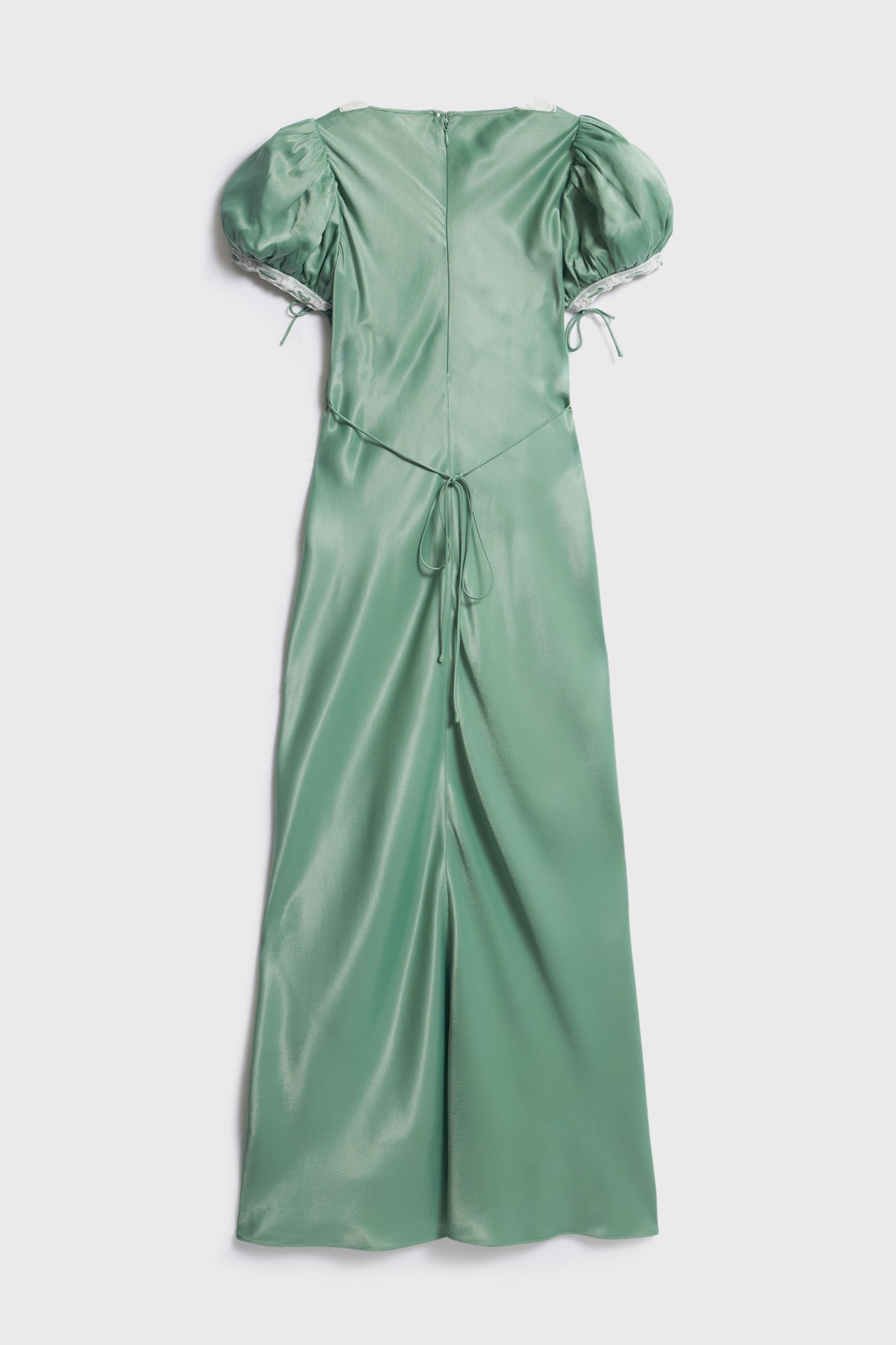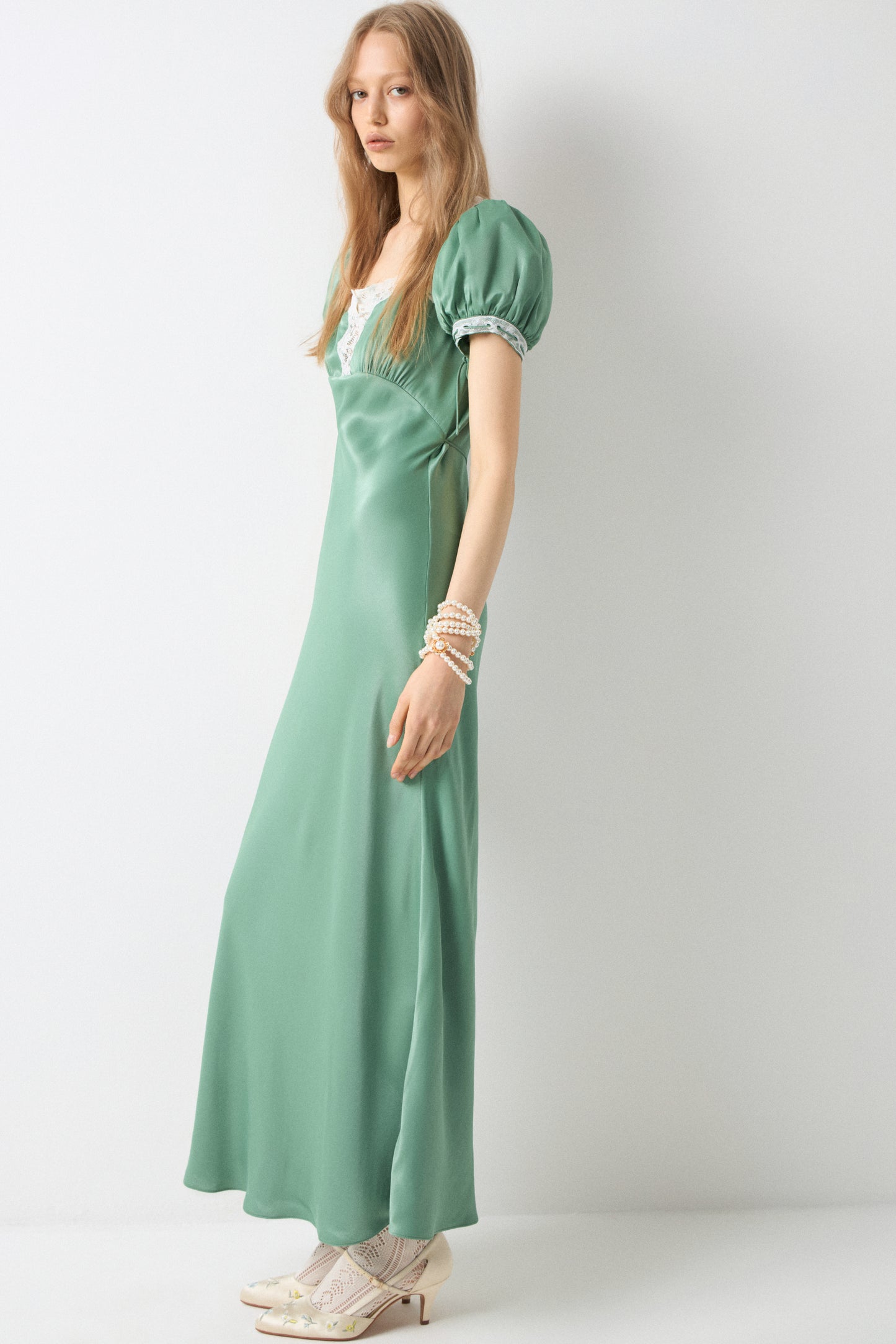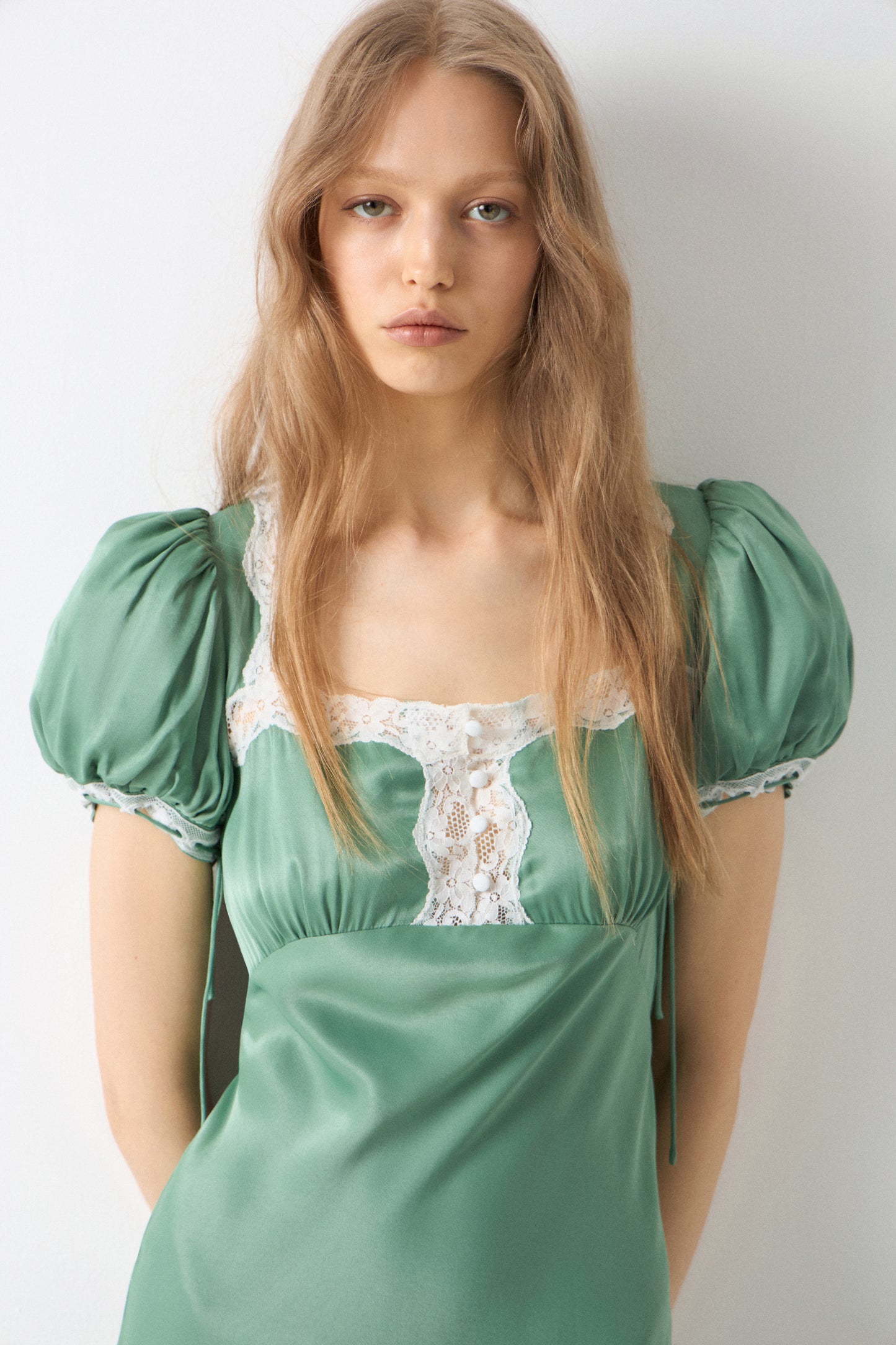 Fitted, calf-length dress in softly draped satin viscose with delicate lace sections. Square neck, covered buttons, and a narrow tie-belt at the waist. Puff sleeves and shaped, double-layered cups. Concealed zipper at the back with hook-and-eye fastener.