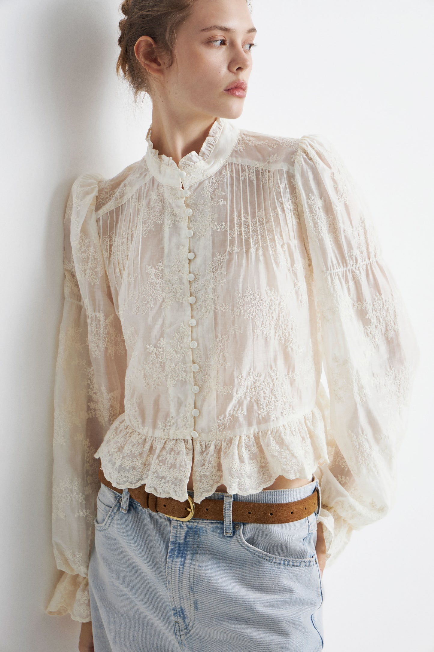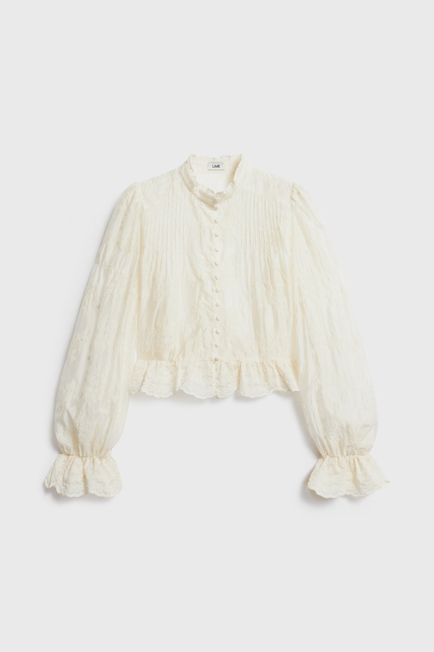 Retro-style blouse in a lyocell-blend with embroidery. Band collar, long puff sleeves and covered buttons. Pleated front details Ruffles at cuffs and hem.