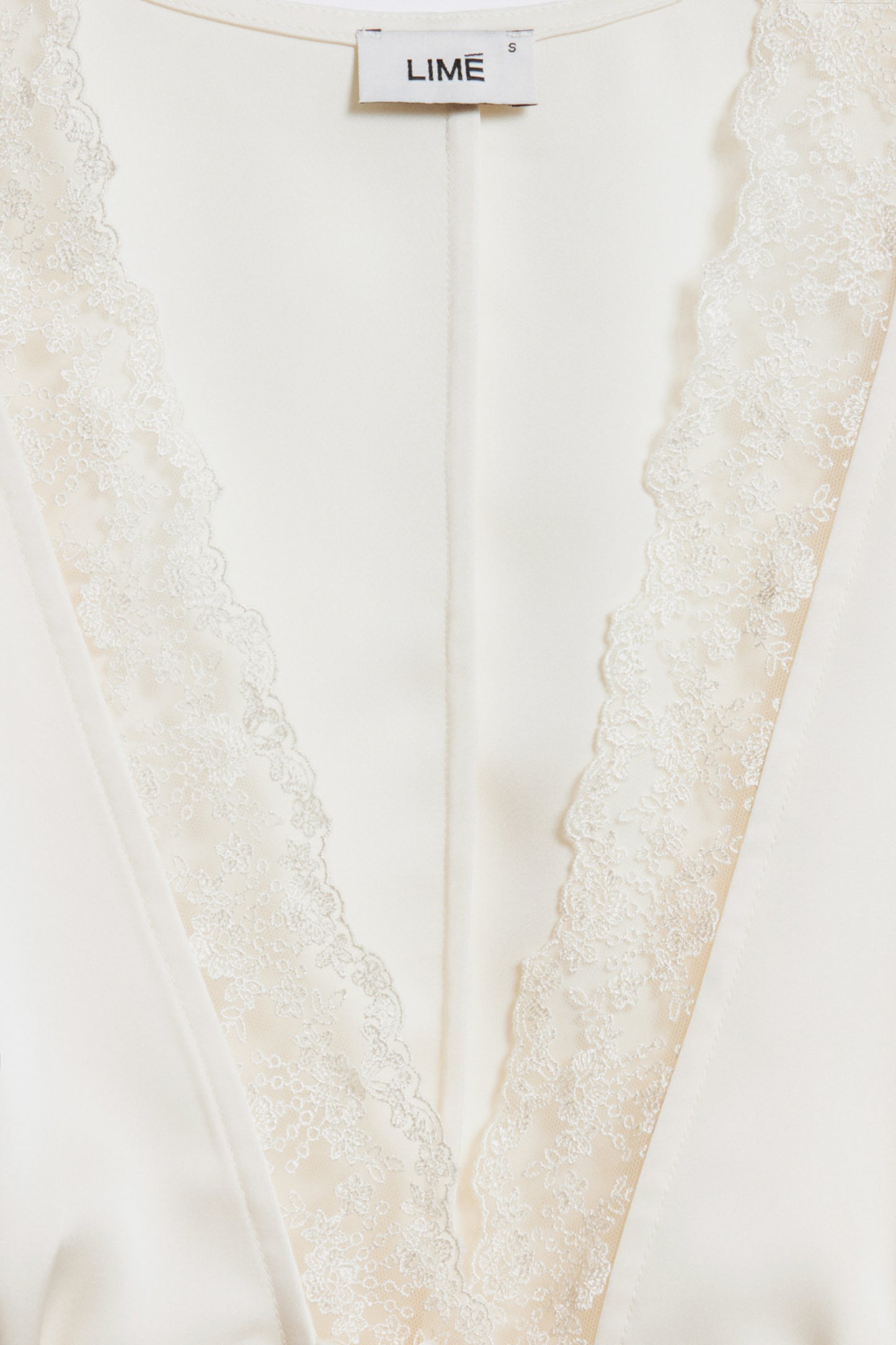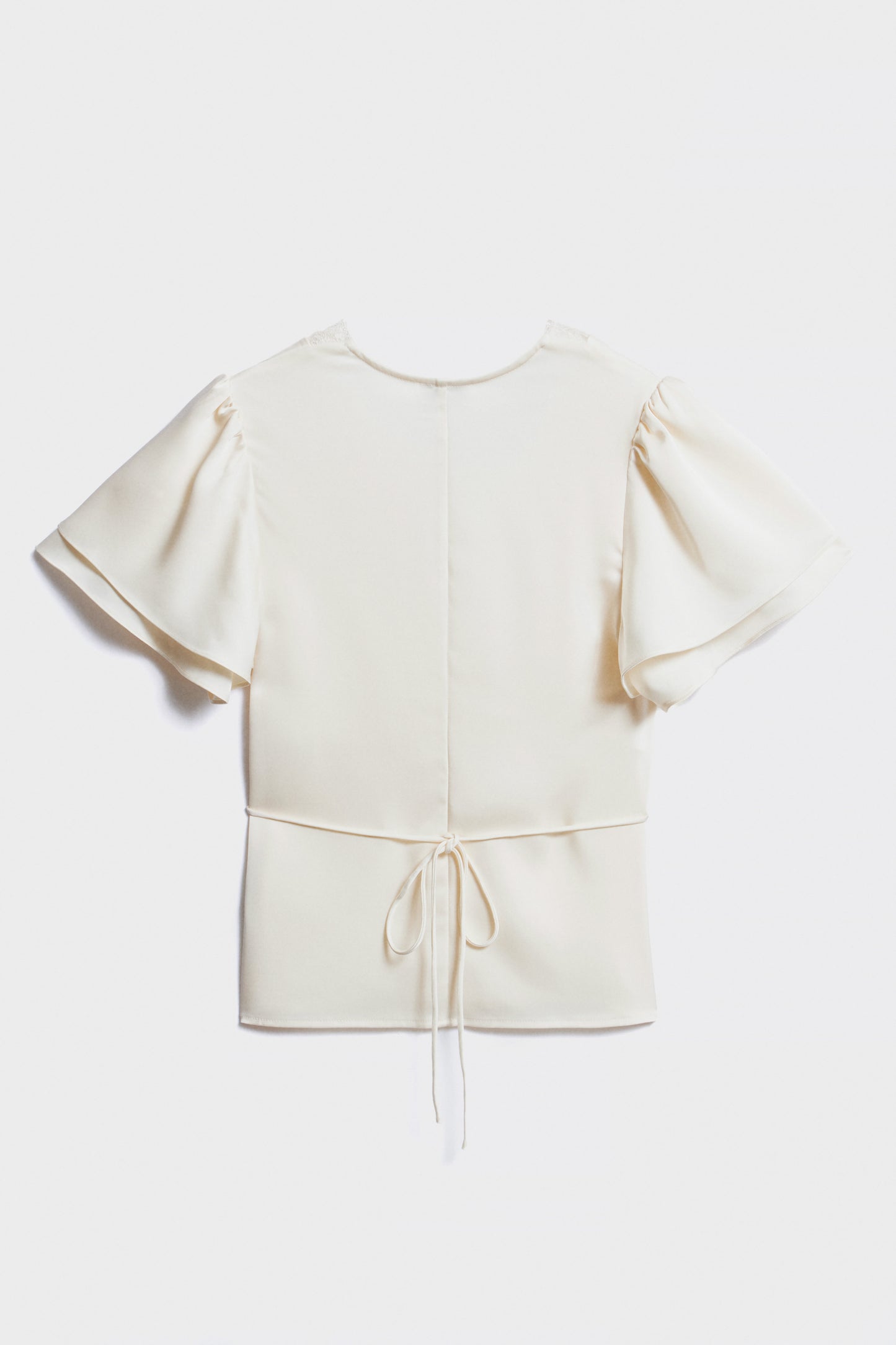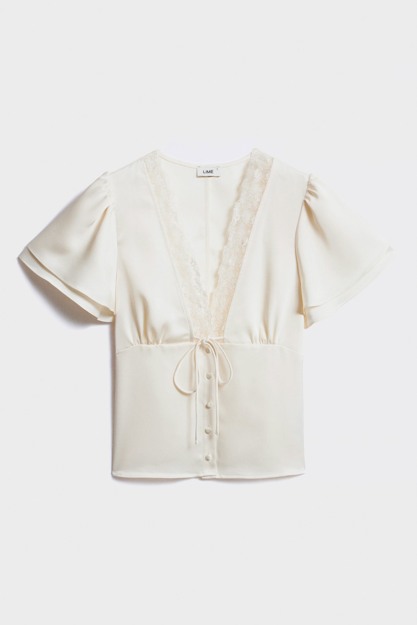 Slim-fit blouse in satin fabric with lace insets. Low-cut V-neckline, ties under the bust, and a narrow back tie belt. Covered buttons.