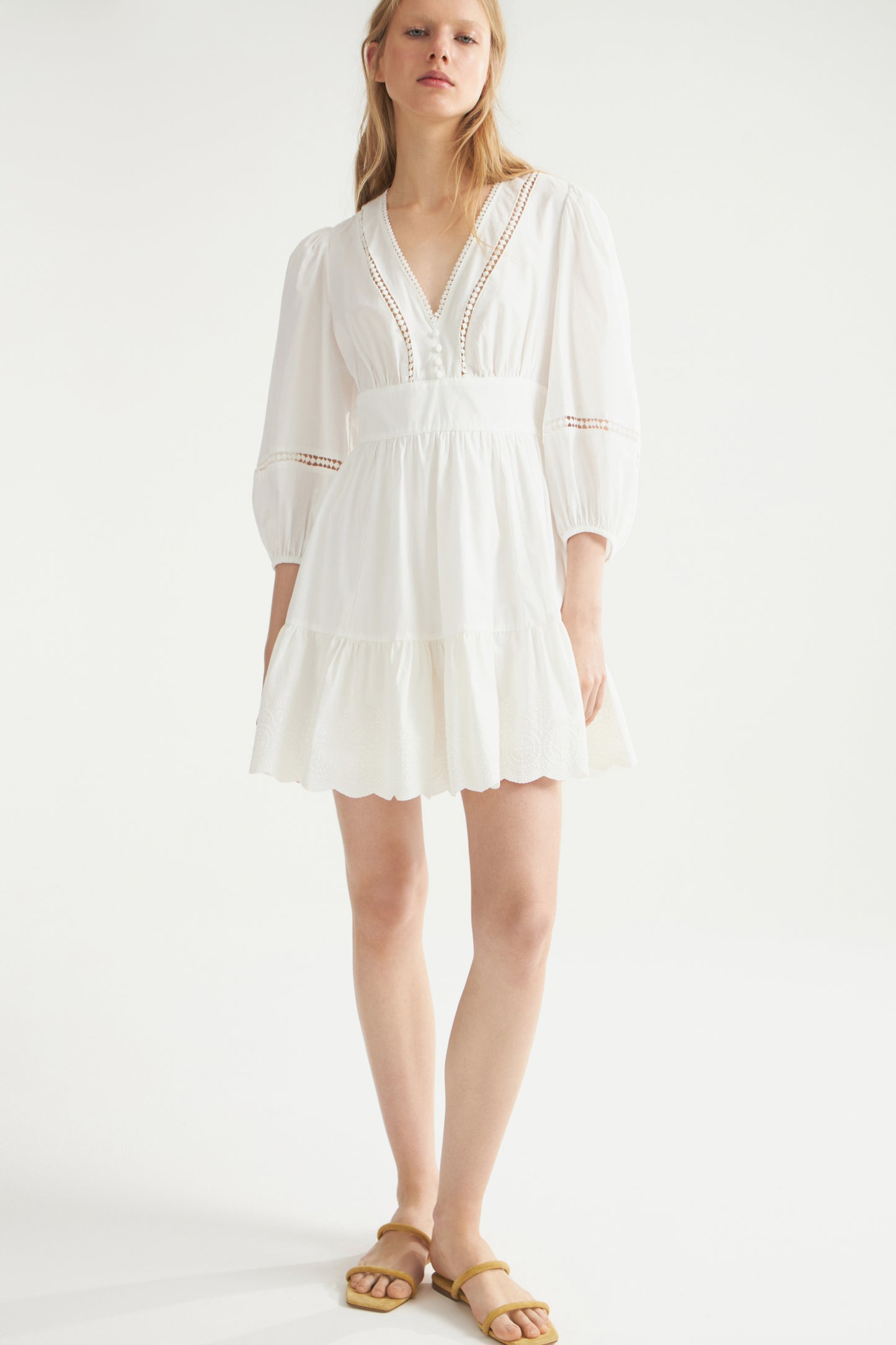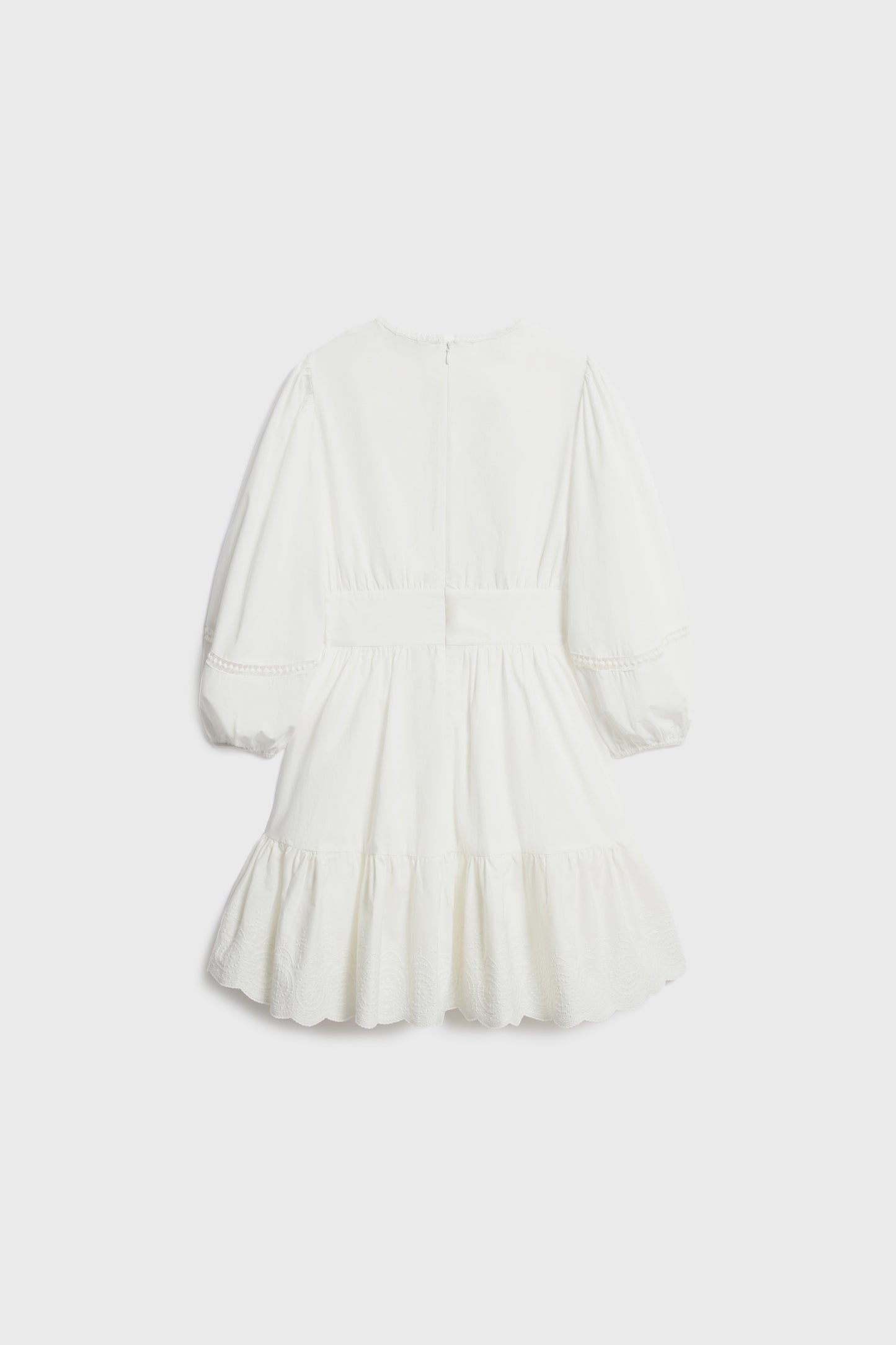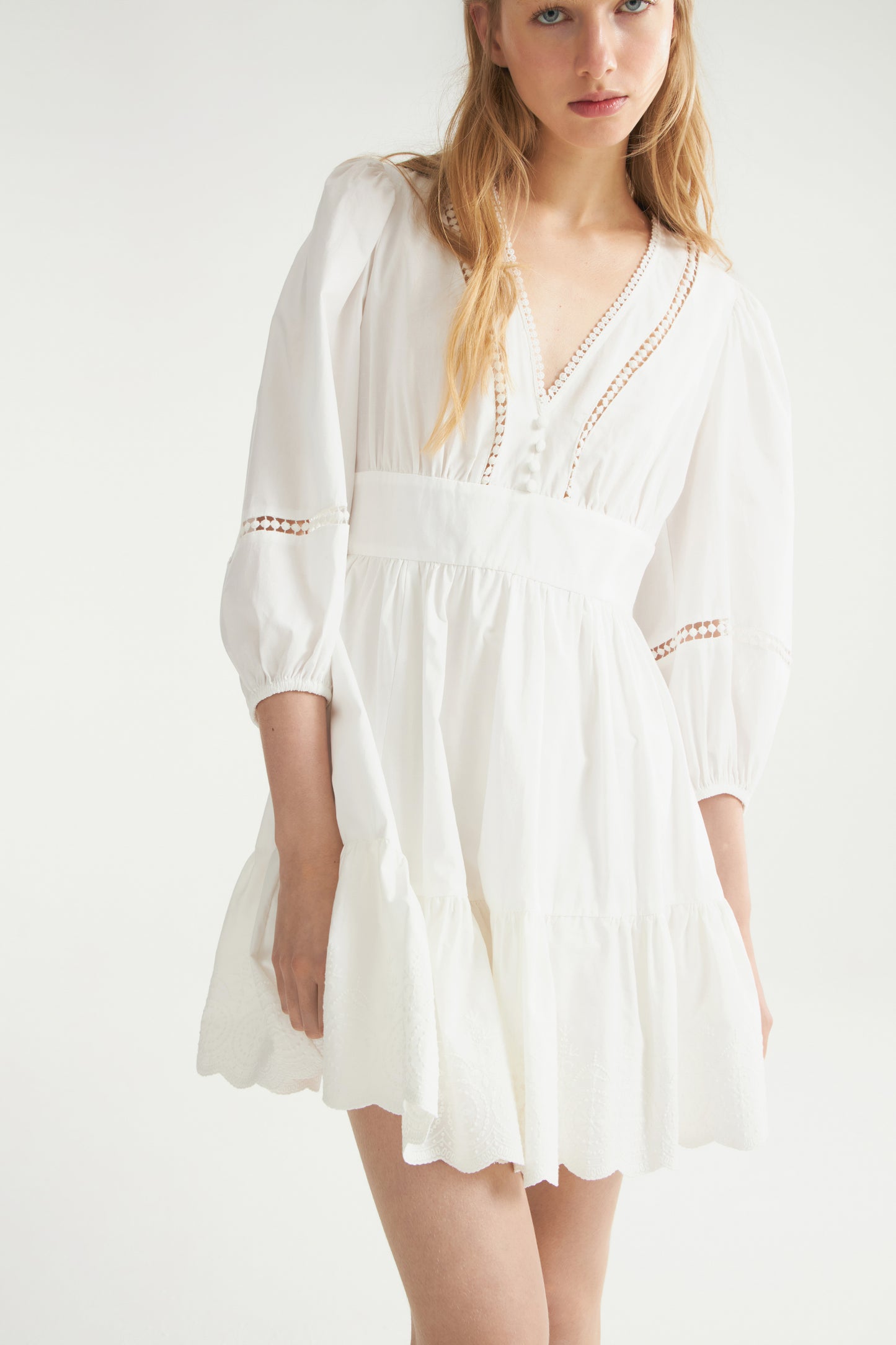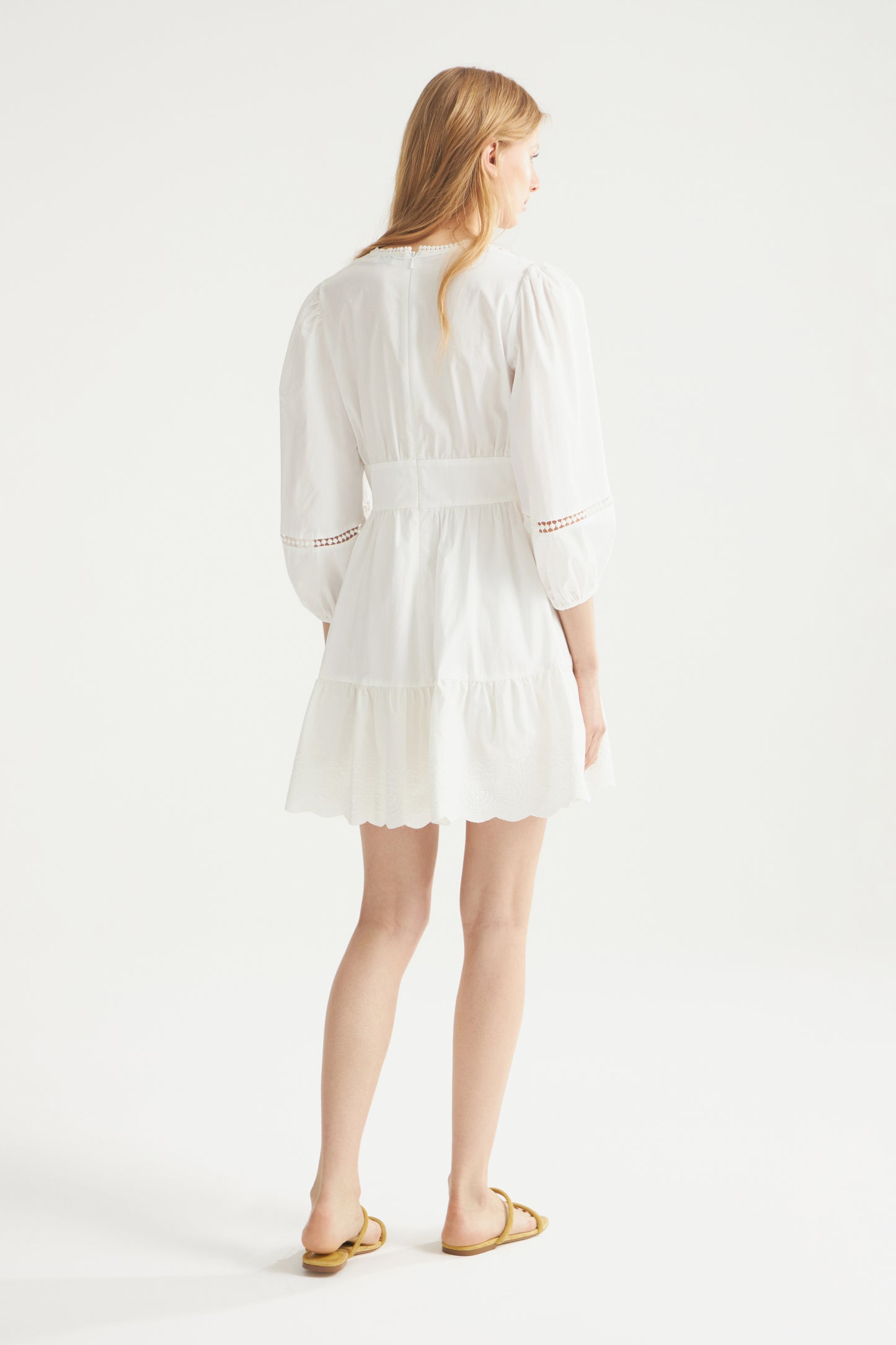 Short, flared dress in soft cotton weave. Featuring lace insets and embroidered scalloped hem. Fitted bodice with covered buttons, a concealed zip at the back, matching lining, and below-the-elbow puff sleeves.